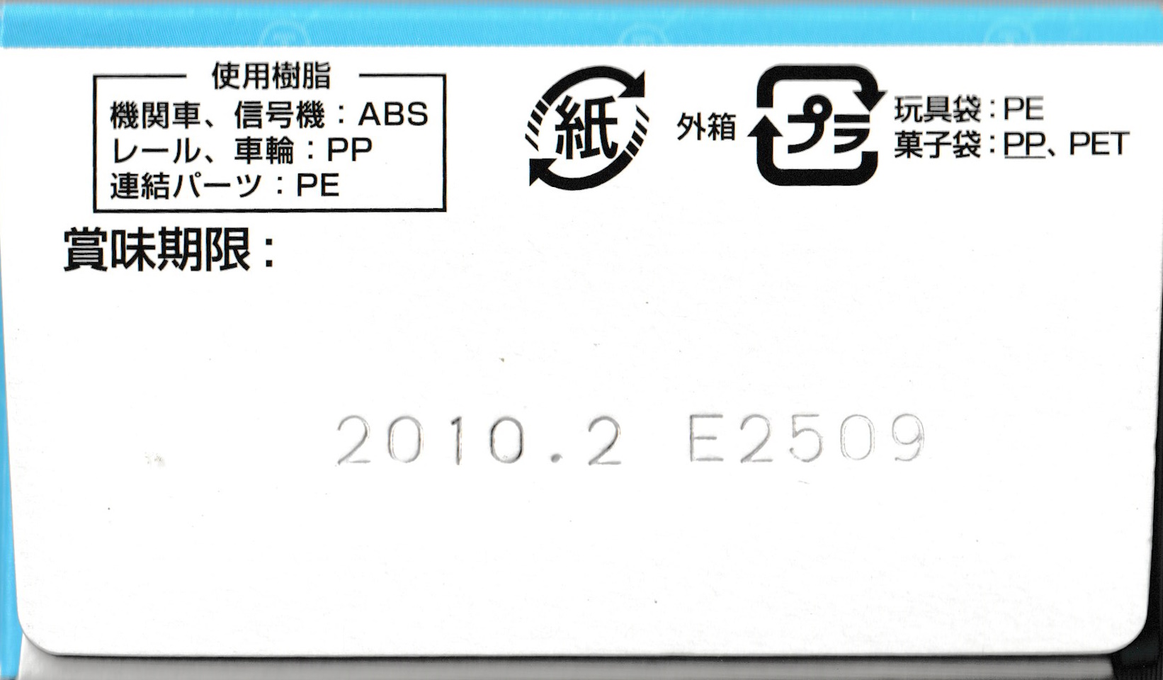 Here is the box for the later Candy Mini Thomas (キャンデーミニトーマス) series, which seems to date to 2008. This set was released in association with Subarudo. Regular Mini Mini Plarail had been discontinued by this point. The front and top of the boxes say which set is inside - the top of the box is scanned from set 1 and the front from set 5. The candy in these ones is marked best by 2010...