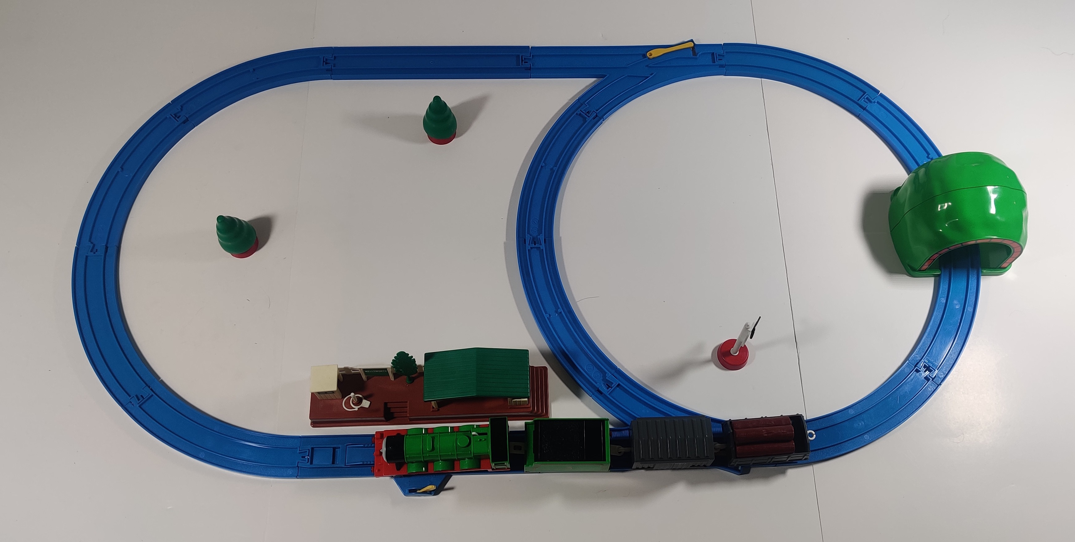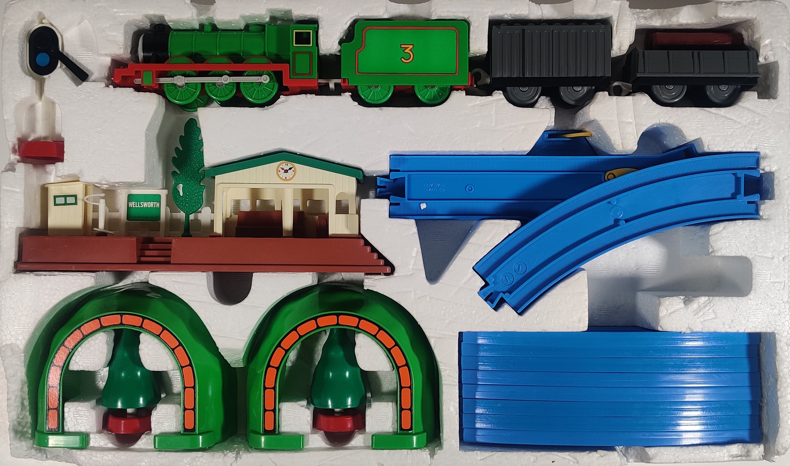 The layout is the classic oval with passing loop used in many other sets. The Country Station does not look very similar to Wellsworth station in the Thomas the Tank Engine books or television series, although it does fit the aesthetic of both Plarail and Thomas at the time. Like the other made in Japan Thomas sets which feature Wellsworth, the country station includes a tablet pole and tablet that were used on some railroads to give a train exclusive right of way on a section of track. This set would have originally had a paper manual, but my copy does not have it.