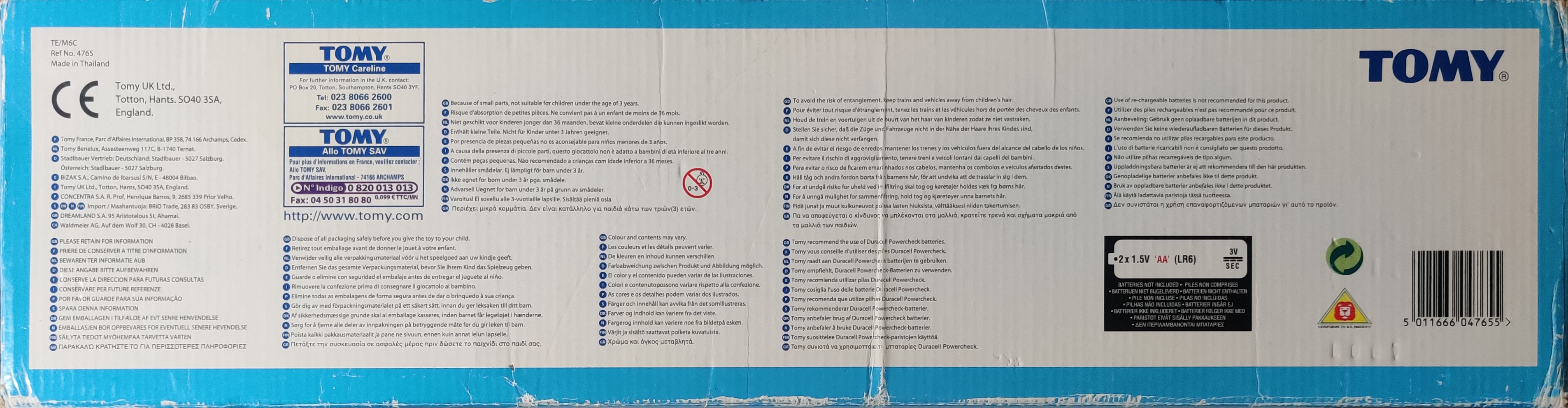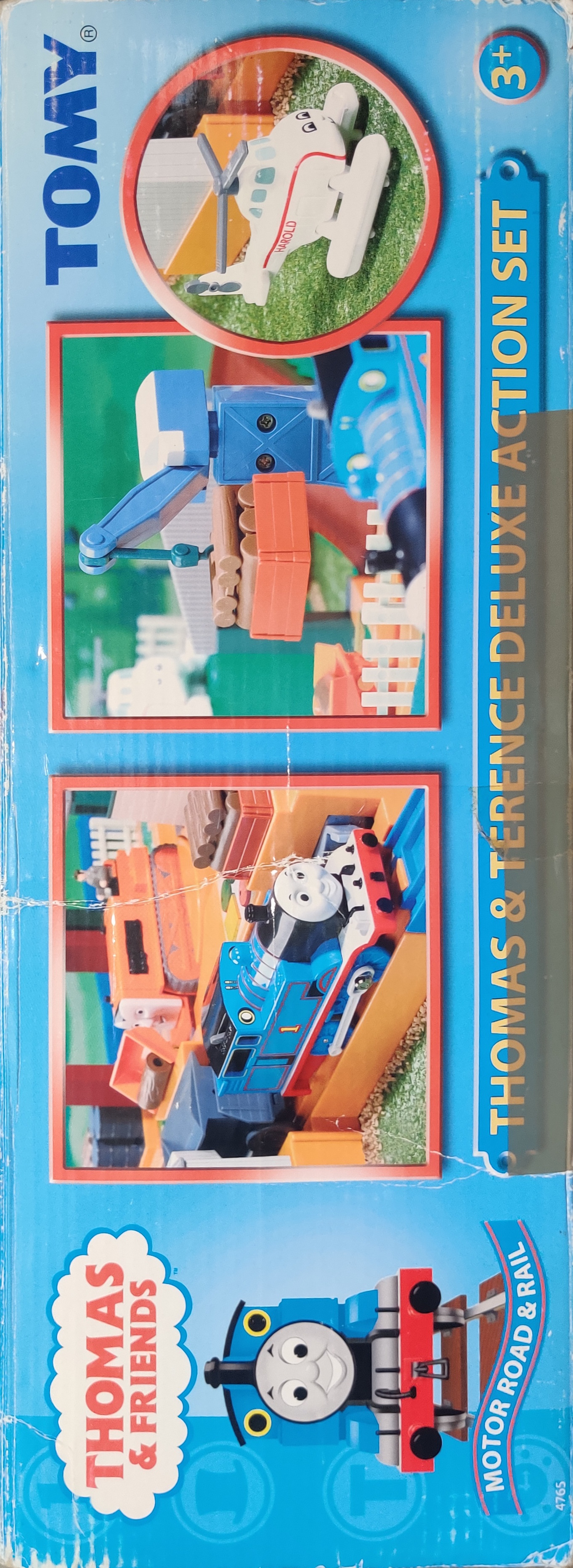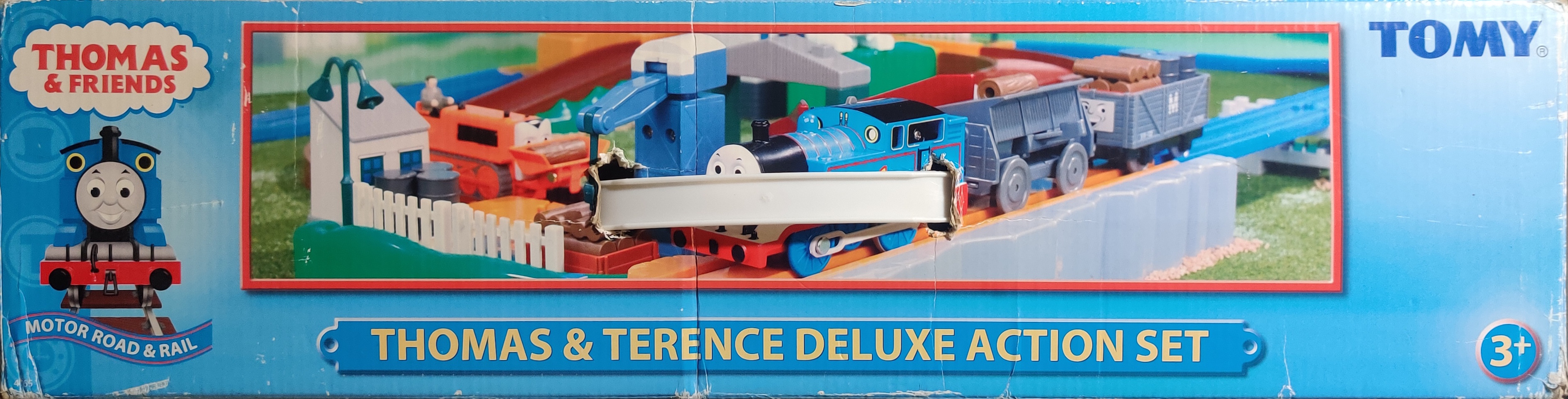 In 2003 the Thomas and Terence set was also exported to Europe as part of the Motor Road & Rail System as 4765 Thomas and Terence Deluxe Action Set. Unlike the American set which used a similar size and format of box to the Japanese release, the European release has a wider, flatter box.