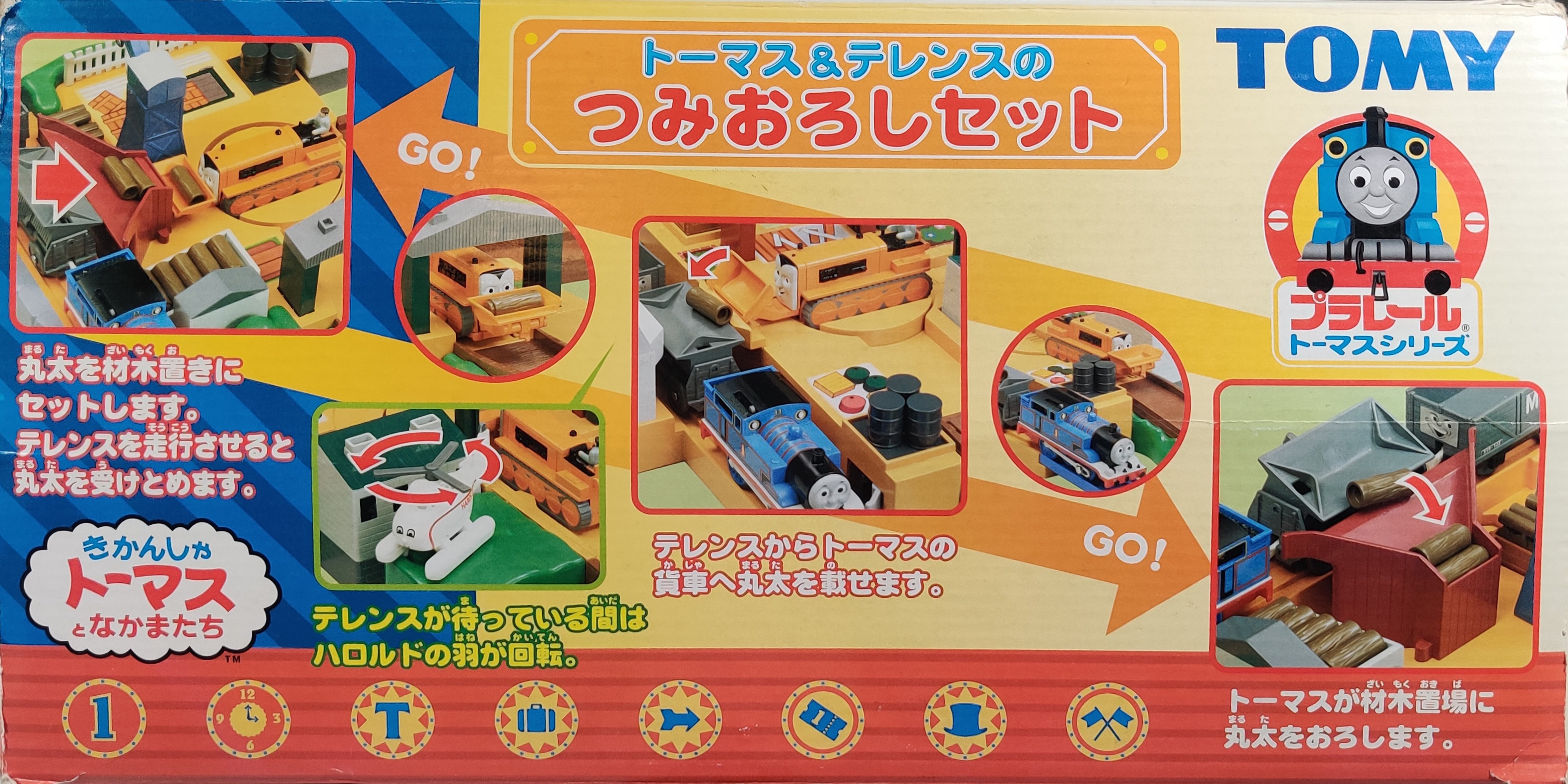The Thomas & Terence Loading and Unloading Set (トーマス&テレンスのつみおろしセット) was first released in Japan on June 27, 2002 for the Thomas Plarail series of train toys. The set features a fully automatic log loading and unloading operation with a moving crane and partially elevated layout.