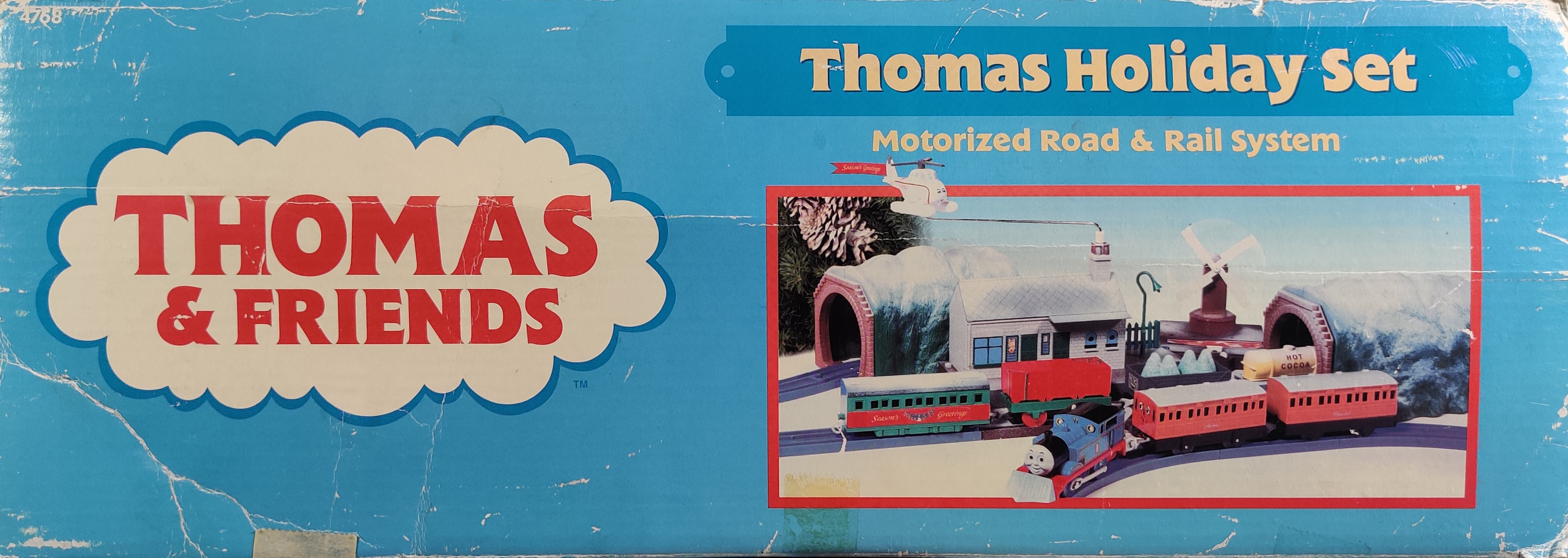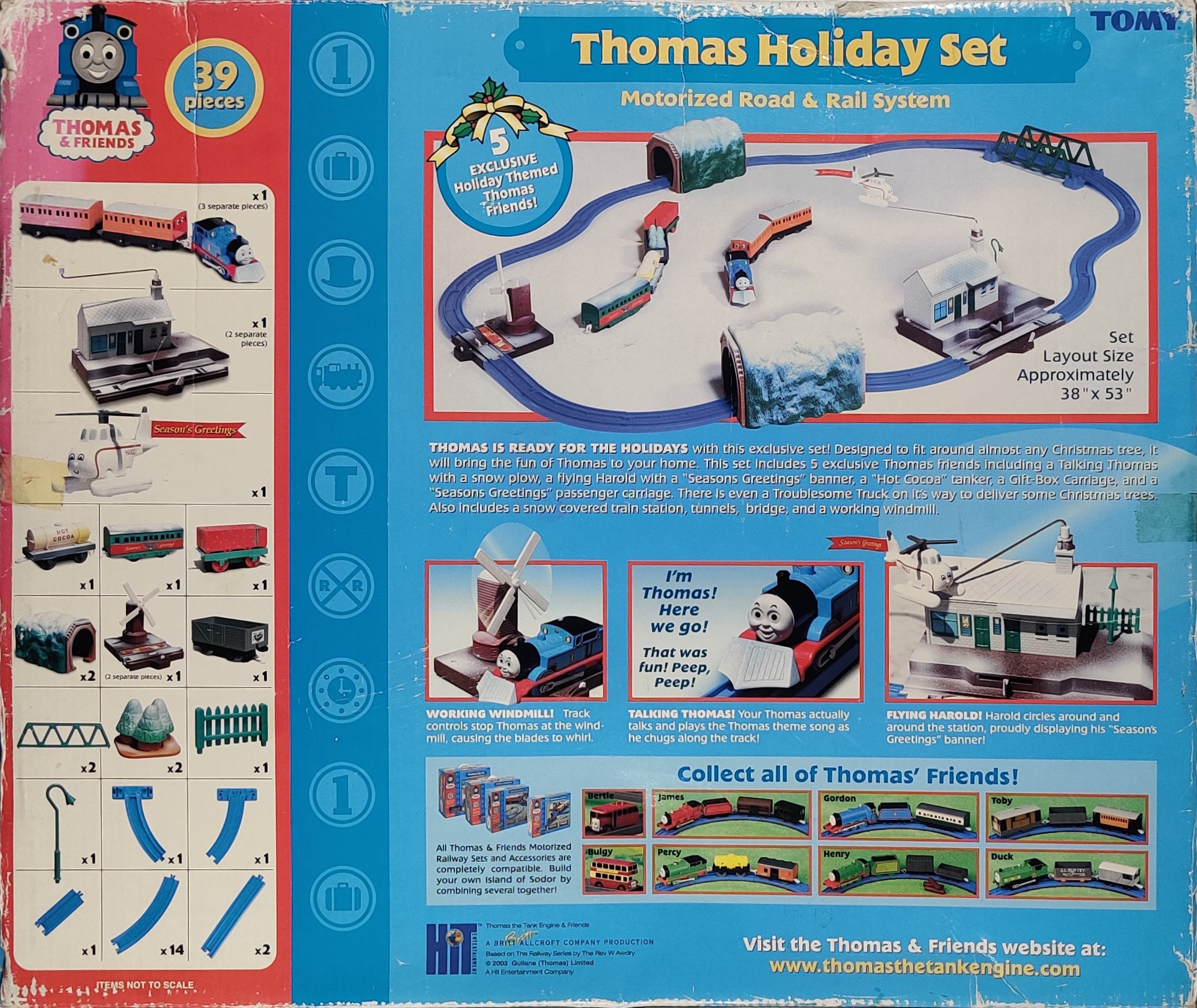 The Thomas Holiday Set was first released in 2003 as part of the Thomas Motorized Road & Rail range at Imaginarium (owned by Toys "R" Us) in America as well as exclusively at Toys "R" Us in Australia. The set includes includes a Talk 'n' Action series Thomas and a large layout that can fit around a Christmas tree. Some versions of the set also include the six talking track pieces.