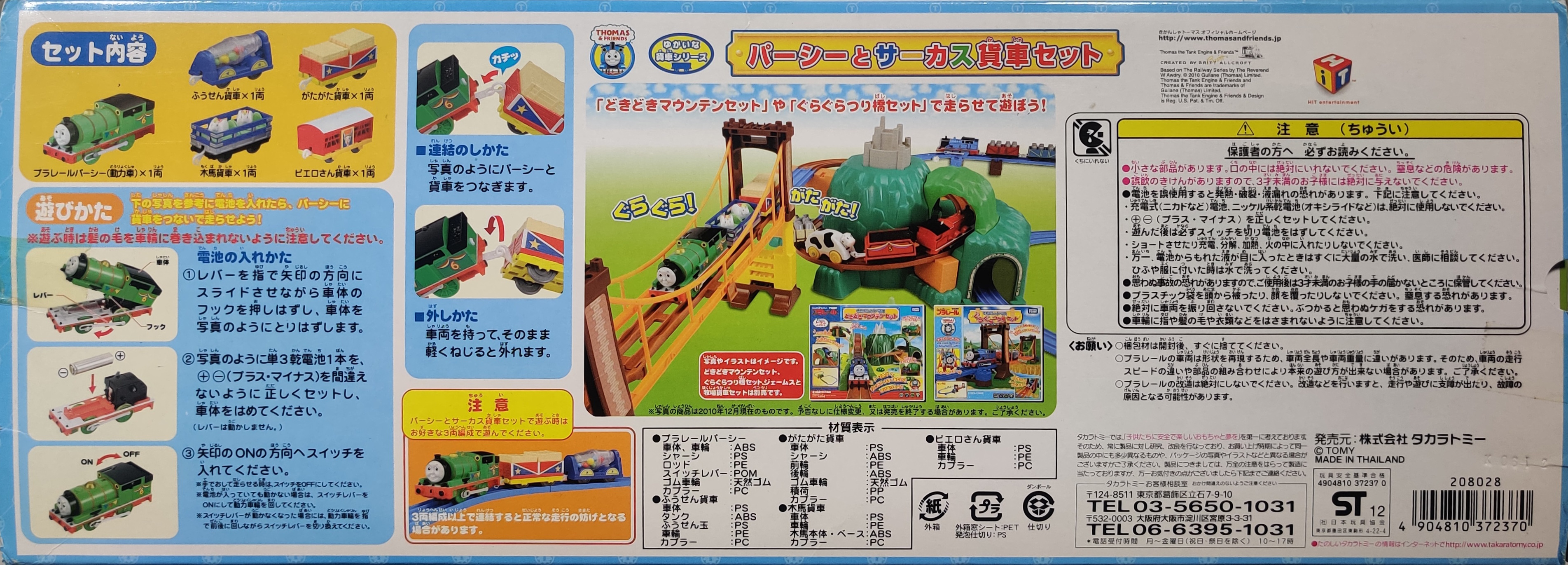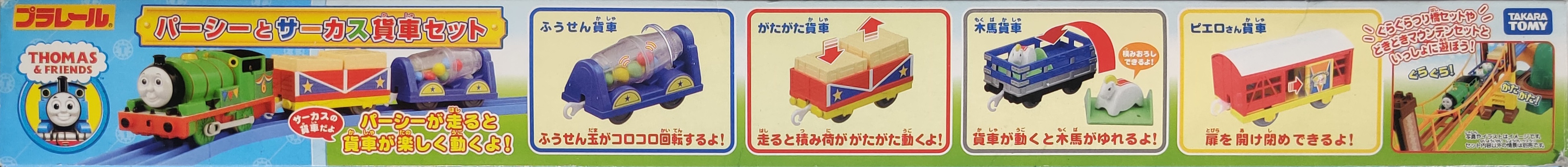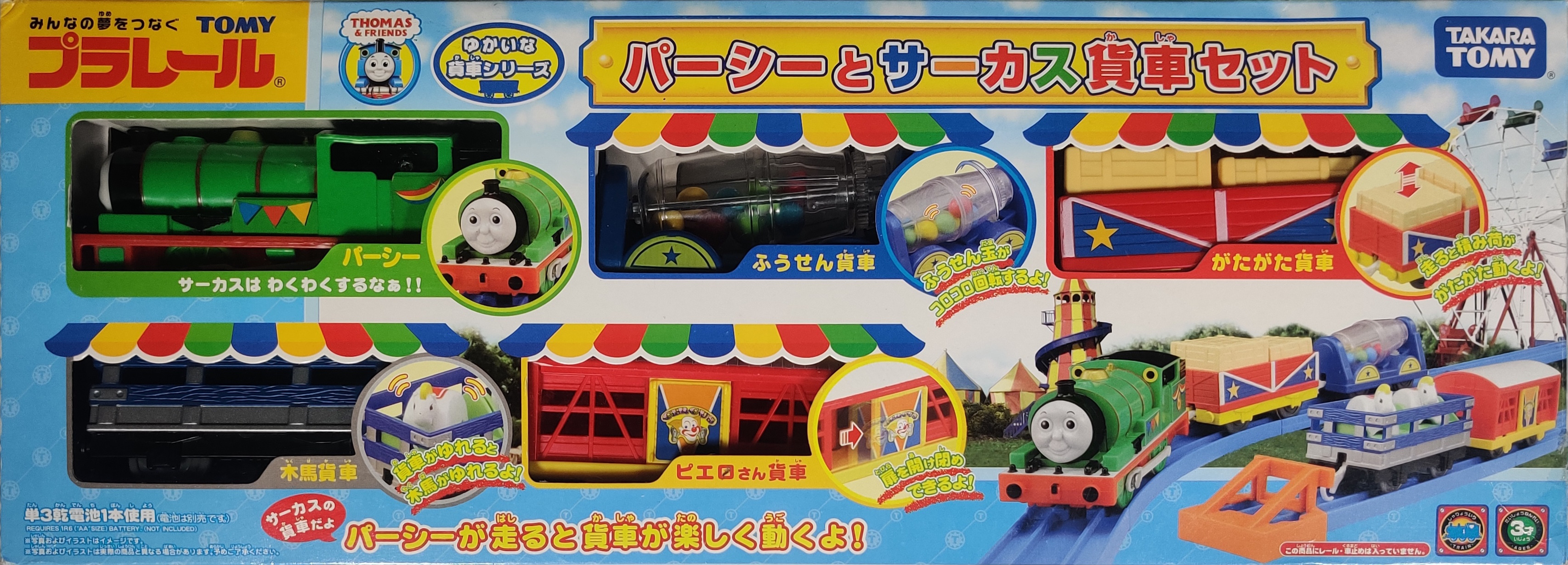On December 16th, 2010 the Thomas-series Plarail train pack Percy and Circus Wagons Set (パーシーとサーカス貨車セット) was released featuring a decorated Percy with several "action" freight cars in the same vein as other Plarail Thomas train packs. This set specifically mentions the circus although the cars are a little less directly related to the circus than the previous Percy with Fun Action Freight Car Set.