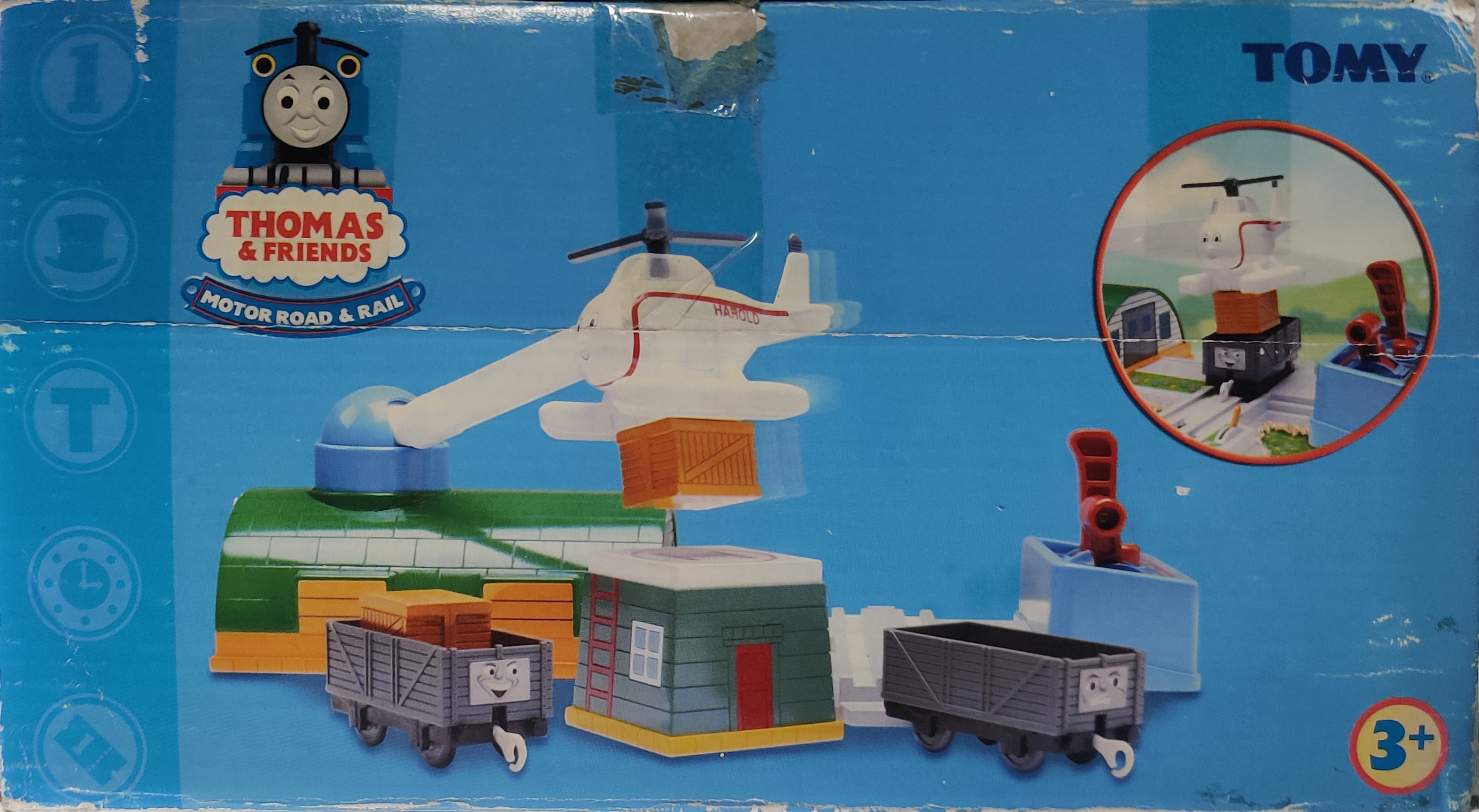 In 2005 a motorized, magnetic "flying" Harold destination was released in all major markets of the Thomas Plarail system and its exports. In Japan and the United States it was only available in sets while in Europe it was only released individually. The main plane flying base is actually based on a 1970s Tomy plane-flying toy, which has been adapted with a track section that lines up with Harold's flight so he can drop crates into waiting trucks.