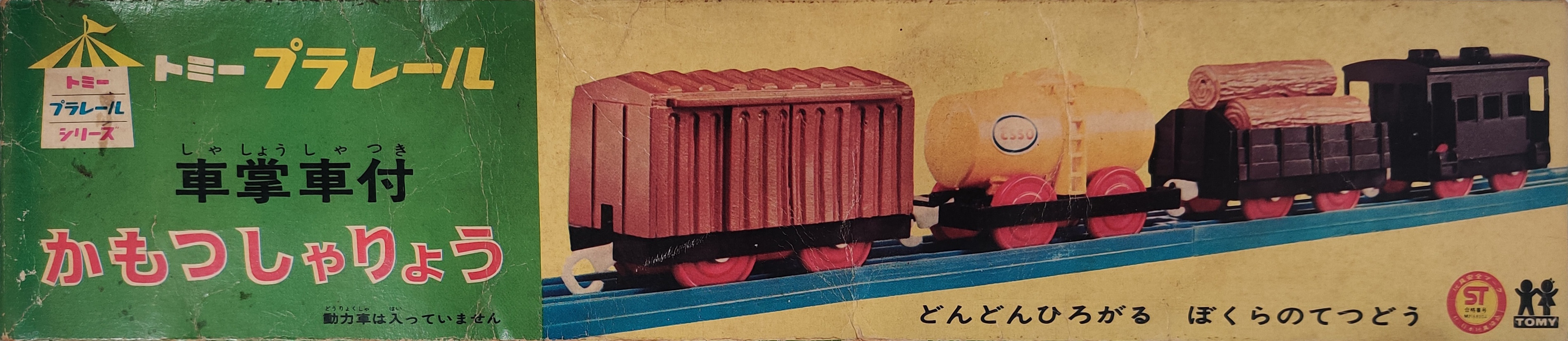 In 1973 several new freight car molds using the same short chassis were released for Tomy's Plarail system with the DD51 and some sets, as well as individually as the four-piece Freight Cars release and beginning in 1976 individually in hanging bag packaging. These freight cars are a small log wagon with three logs, a "stubby" Esso tanker, a short box car, and a type 6000 JNR guard's van. These wagons were shorter than other Plarail wagons up to this point and were presumably cheaper than some of the larger freight cars from the early 1970s. They all have nicely molded details and fit the "chibi" style that Plarail had in the 1970s and 1980s.