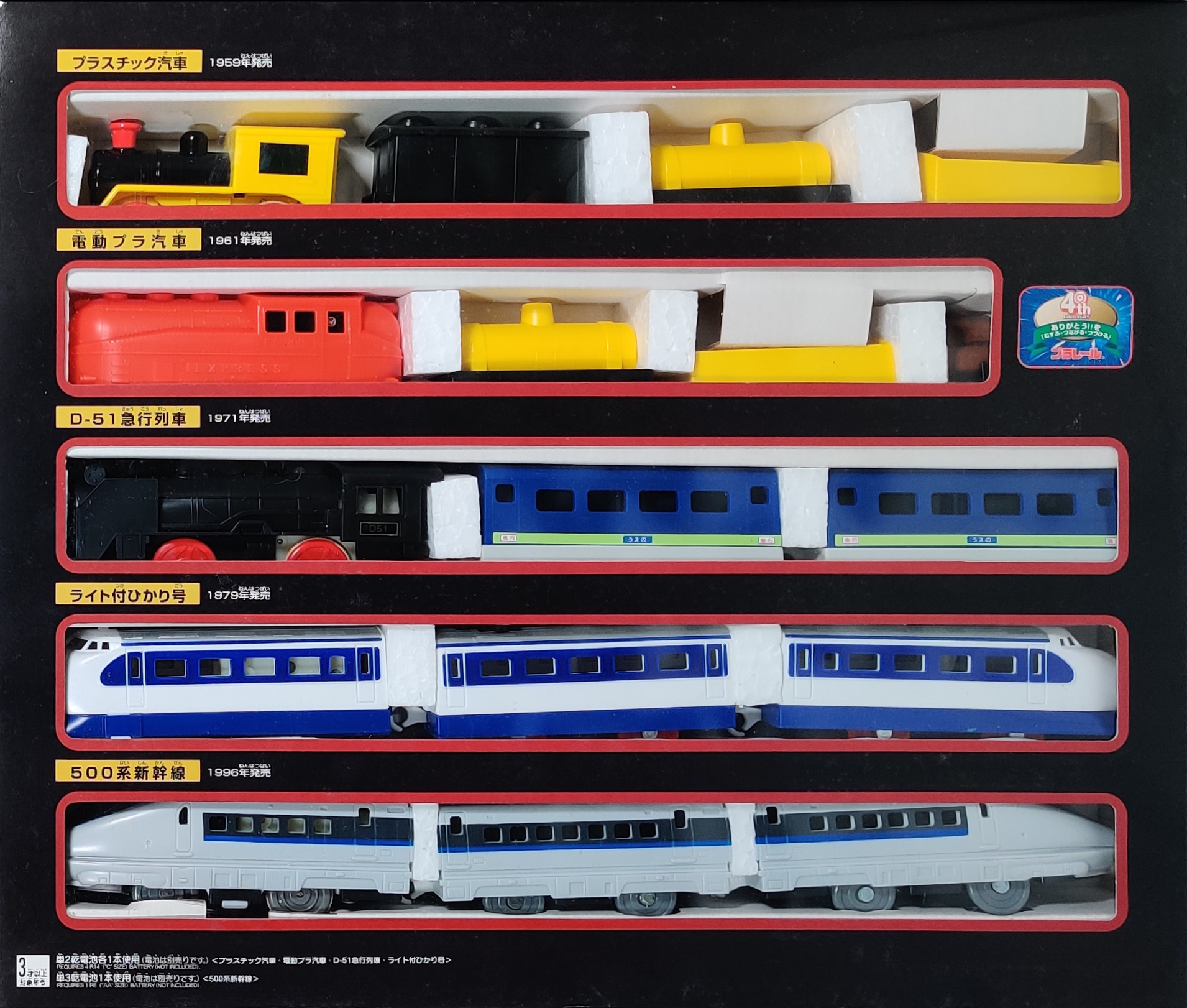 The back of the box says of the Plastic Train: The "Plastic Train" that appeared in 1959 (Showa 34) can be said to be the origin of Plarail, and was a five-car train. Although it was not called Plarail at that time, the specifications of the rail parts and the connection play have been inherited by Today's Plarail vehicles. The "Plastic Train" differed greatly from today's Plarail in that it was rolled by hand rather than by motor power. Furthermore, this Plastic Train was an original design that was not modeled after an actual vehicles. There was also a color variation in which the train was red. Production ended in 1969 (Showa 44).