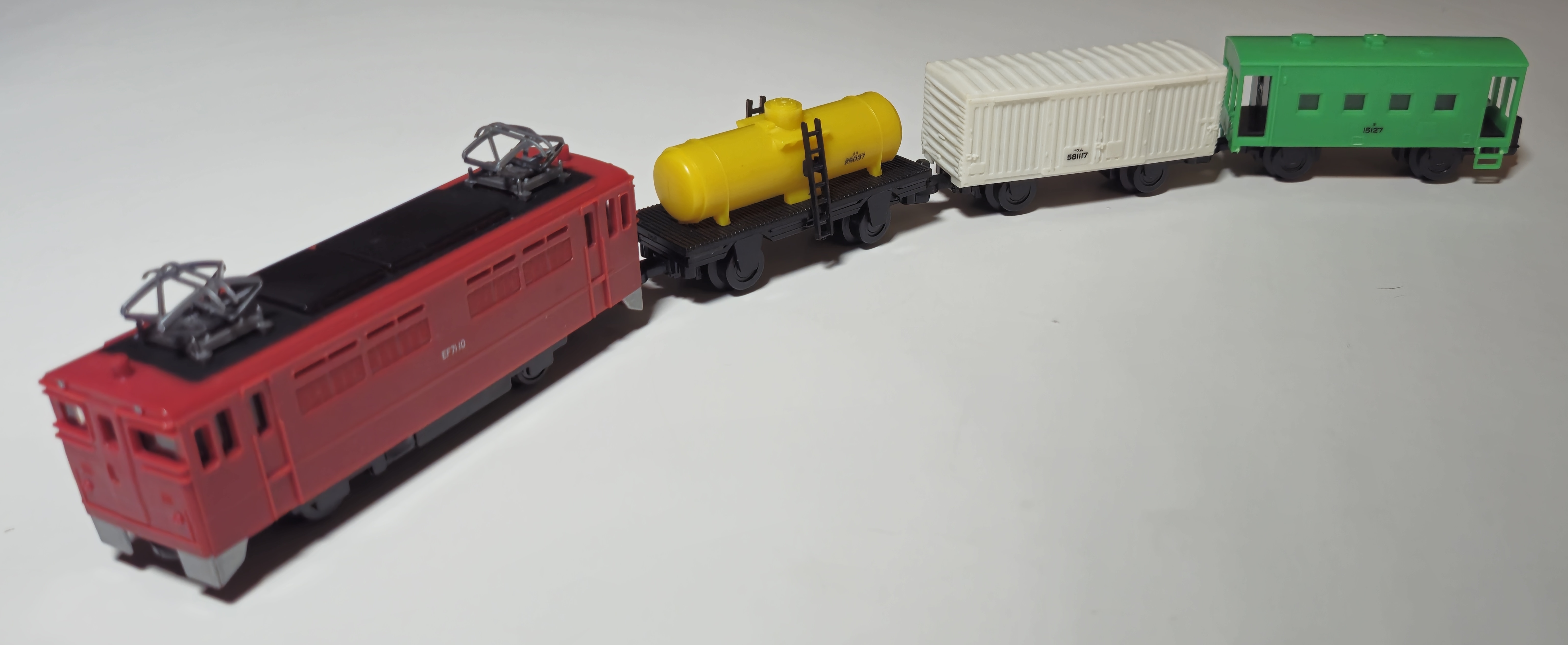 New-chassis red EF-71 with white WHAM box car, yellow tanker, and Takara green guard's van. This train was sold individually and in the Action Series No. 3 EF71 Electric Locomotive Horn Set.