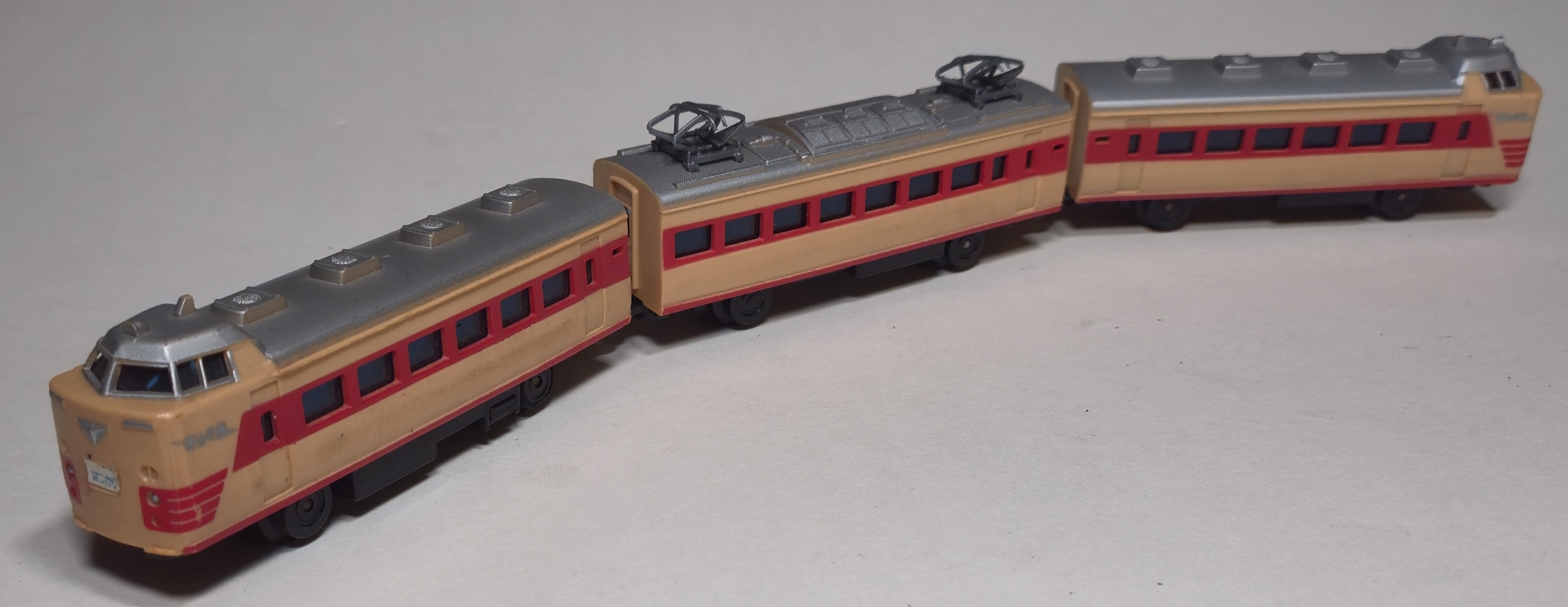 A new tooling for the early Action Series was the 485 series Limited Express train. The circa 1976 green card release has the power chassis in the middle car while the ~1977 orange card release of this train has the power car in the front. The limited express train I have from a 1977 copy of the Action Serise No 2 Limited Express Set still has the power car in the intermediate car like the early individual release.