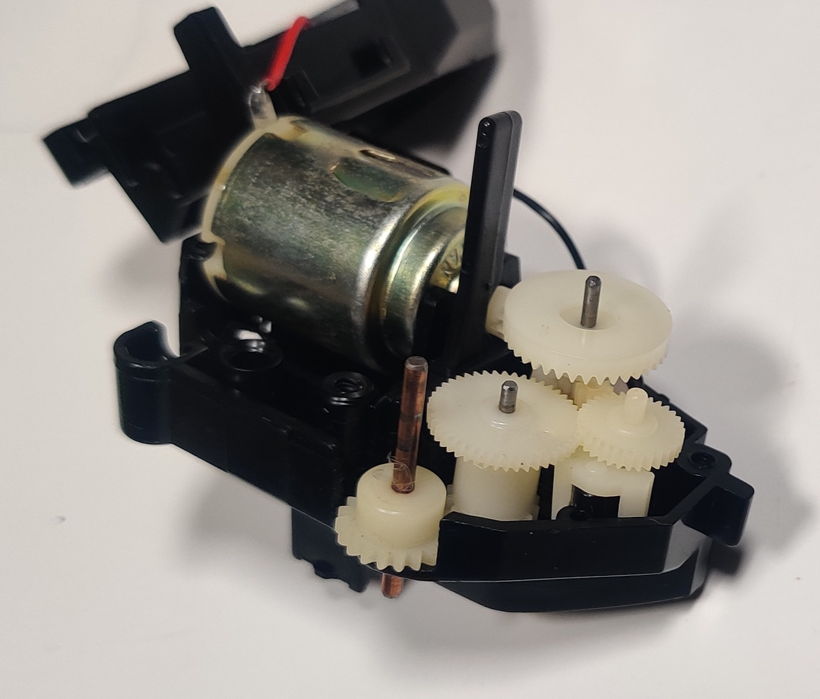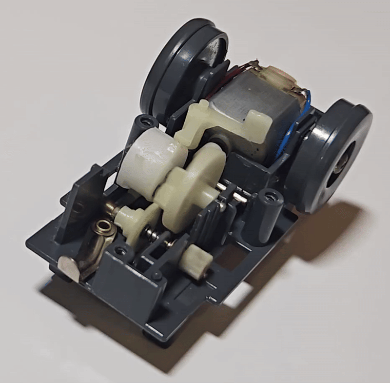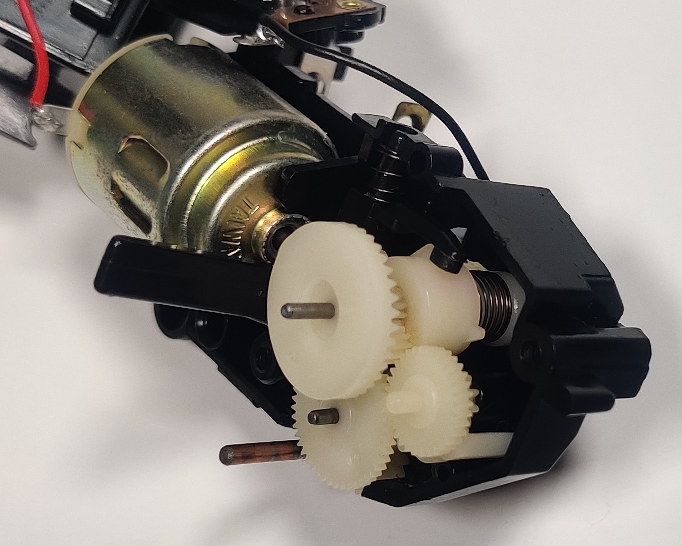 The geartrain inside includes an interesting mechanical reverser that also uncouples the output of the wheels from the input, leaving the chassis free-wheeling when unpowered. The motor pinion drives a contrate gear which has an integrated smaller pinion.