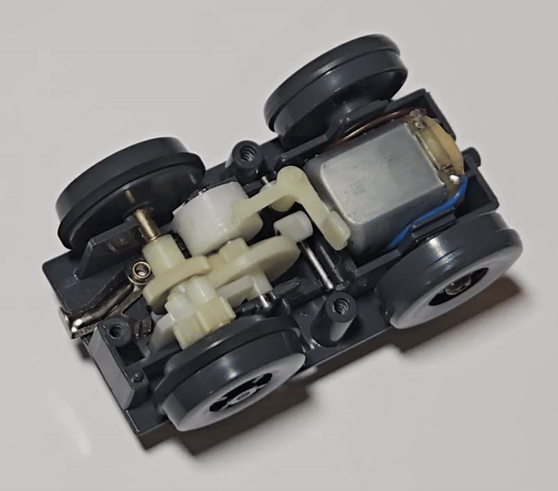 The mechanism is mostly the same inside, although it appears to be an entirely new chassis tooling with the rivets in the metal contact strips in different positions and the metal bar swinging up to the left instead of the right. The screws in the unpowered wheels now have flat caps, but the screws holding it together that had previously changed from cross-headed to triangular security screws were changed to five (instead of the older three) cross-headed screws.