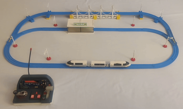 TomyTrain was a battery-powered plastic toy train system developed by Tomy for international sale in the late 1980s. Tomy Train was aimed at younger children with chunky reversing engines and magnetic couplings. Track was based on the Plarail track standard but made from dark blue plastic and the loading gauge was larger to accommodate taller trains. Engines and cars have magnetic couplings that are easy to connect and disconnect and figures and accessories have magnetic and other interactive play features. Many pieces included LEGO-style studded surfaces and the building toy compatibility was one of the advertised selling features.