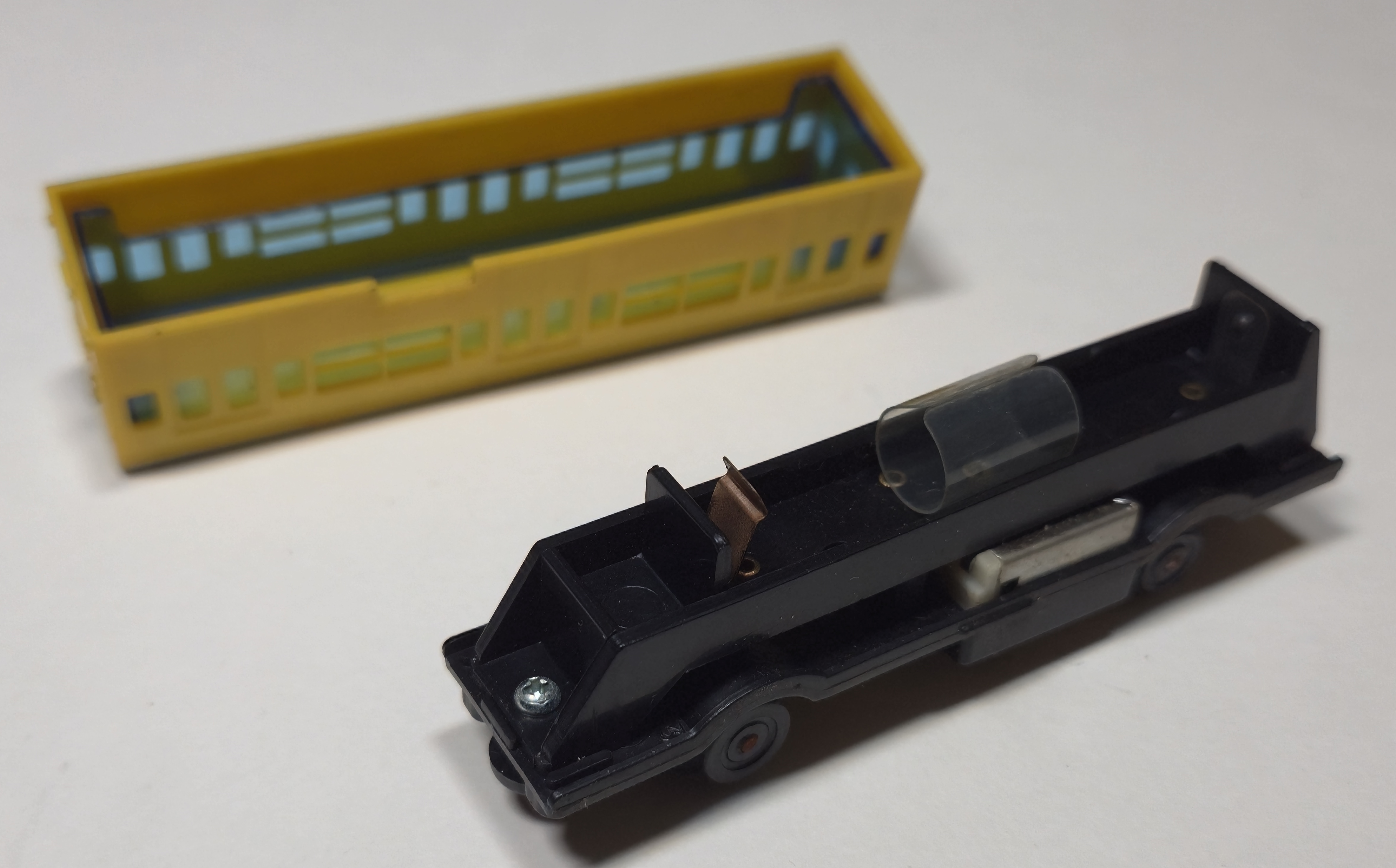 The lead car has a silver headlight, with the rear car having red tail lights. The front car holds the powered chassis with the intermediate and rear cars using the same unpowered chassis as most of the other carriages in the series.