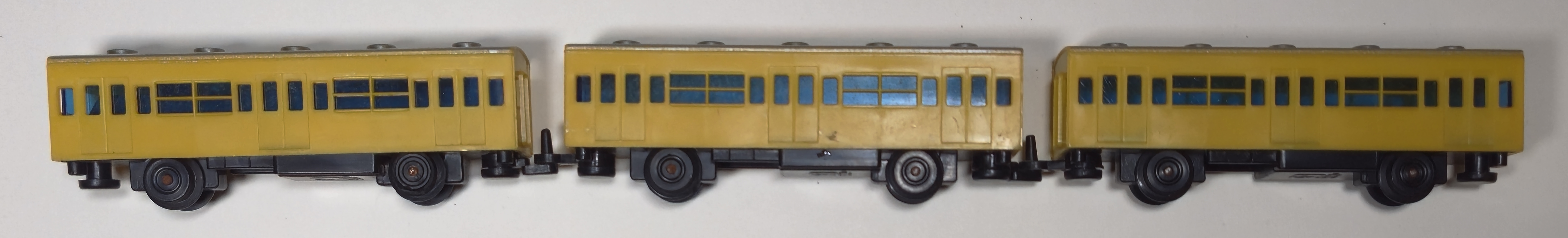 The original non-reversing JNR 103 series National Railways Train was produced in orange, light blue, green, and yellow as pictured in the same No.1, No.2, and No.3 sets as the other trains. As noted above, the components to this set were purchased in a larger lot, of which this yellow 103 series train was the only that appeared in the No. 3 set.