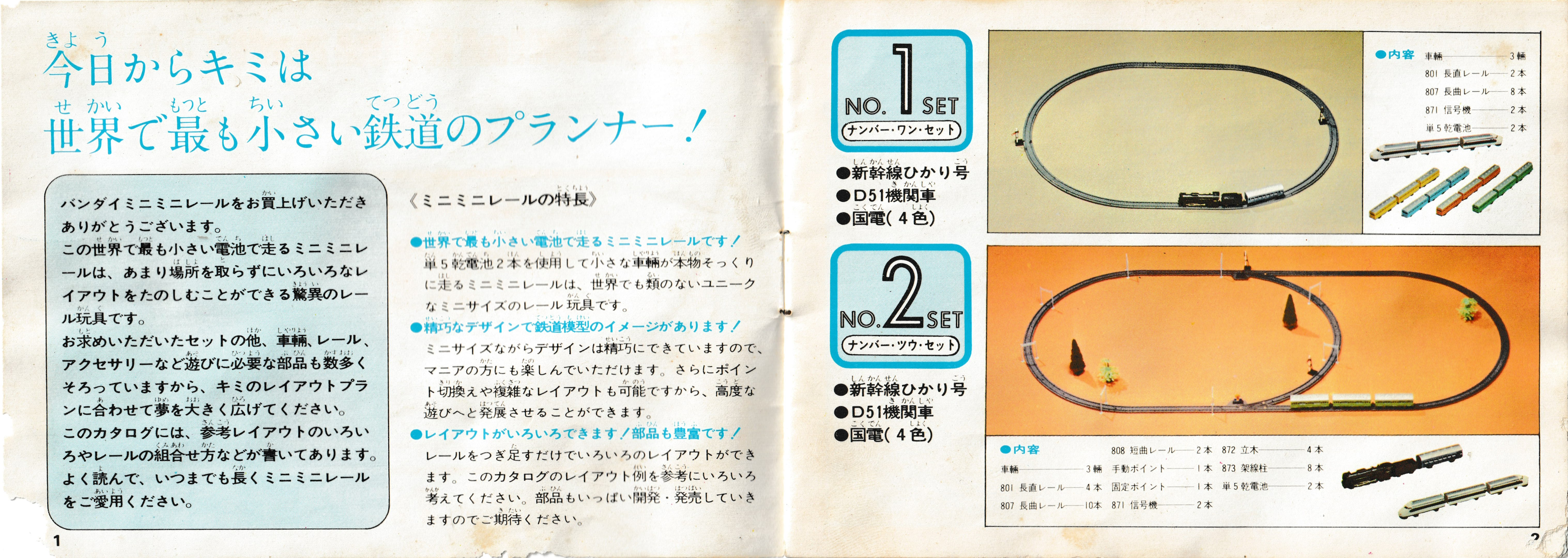 The left page points out some of the features of Mini Mini Rail - that it is the world's smallest train that runs on the smallest battery, that the design is intricate and like a model train, and that there is a wide variety of parts that can be used to make different layouts. The right page shows the oval No.1 set and passing loop No.2 set.