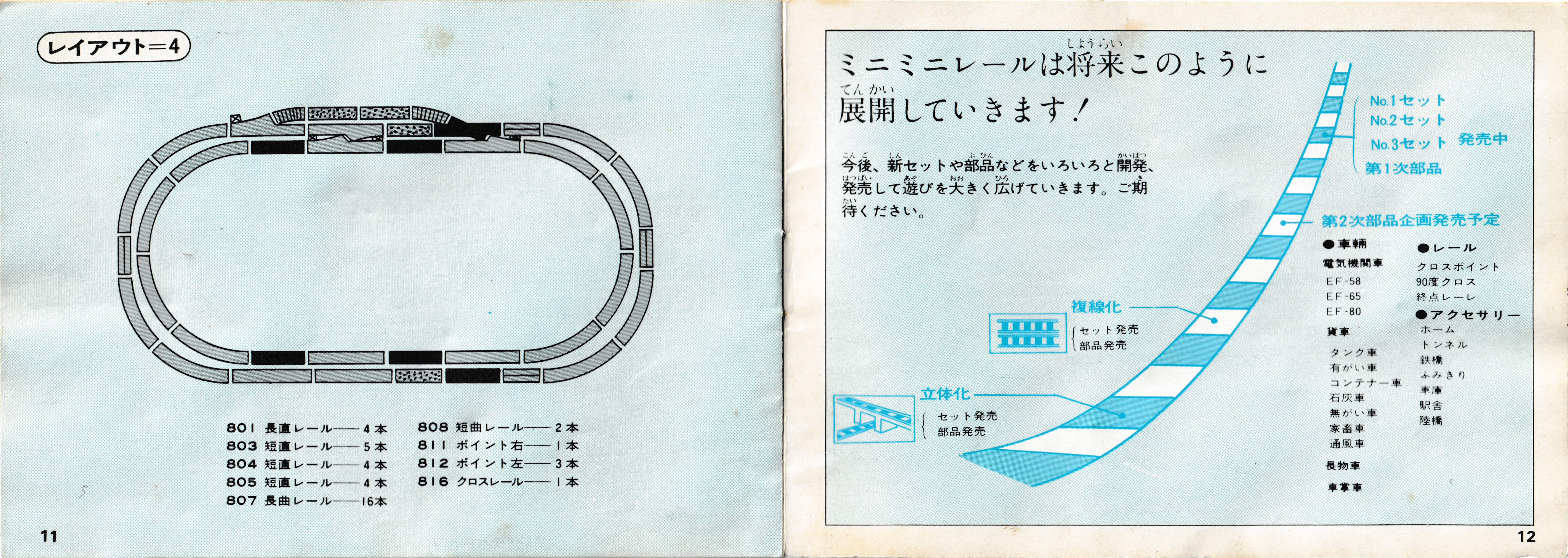 A double track loop which seems like they could have made it fit the double track curves... maybe these layouts were designed before the double rail curves and some other types of rail were developed? The page on the right talks about starting with one of the numbered sets and adding onto it - they mention a few products I don't believe I have seen, an EF-58 and EF-80 listed alongside the EF-65 that did appear late in the original pre-Action Series era with a D-51 hauled freight train with some of the cargo cars listed.