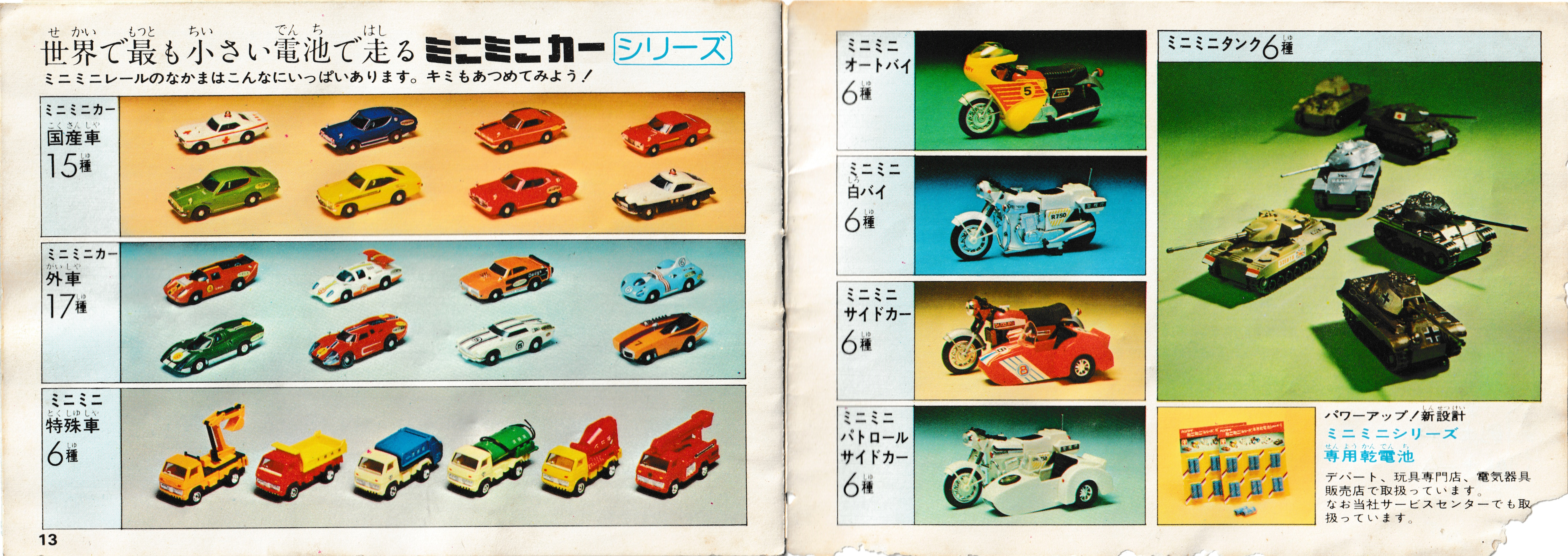 The left page shows the Mini Mini Car series, which first appeared around 1973, and were also battery-powered - this is where the Mini Mini part of the name comes from (it seems to me that Mini Mini Rail was longer-lived and better-surviving). The right page has other Bandai vehicle toys as well as a second advertisement for packs of pairs of N batteries, the "smallest battery in the world" and Bandai and other manufactures used on some toys in the 1970s. N batteries were harder to find even in the day and the Mini Mini Rails series was redesigned to use a AA battery in the later 1970s.