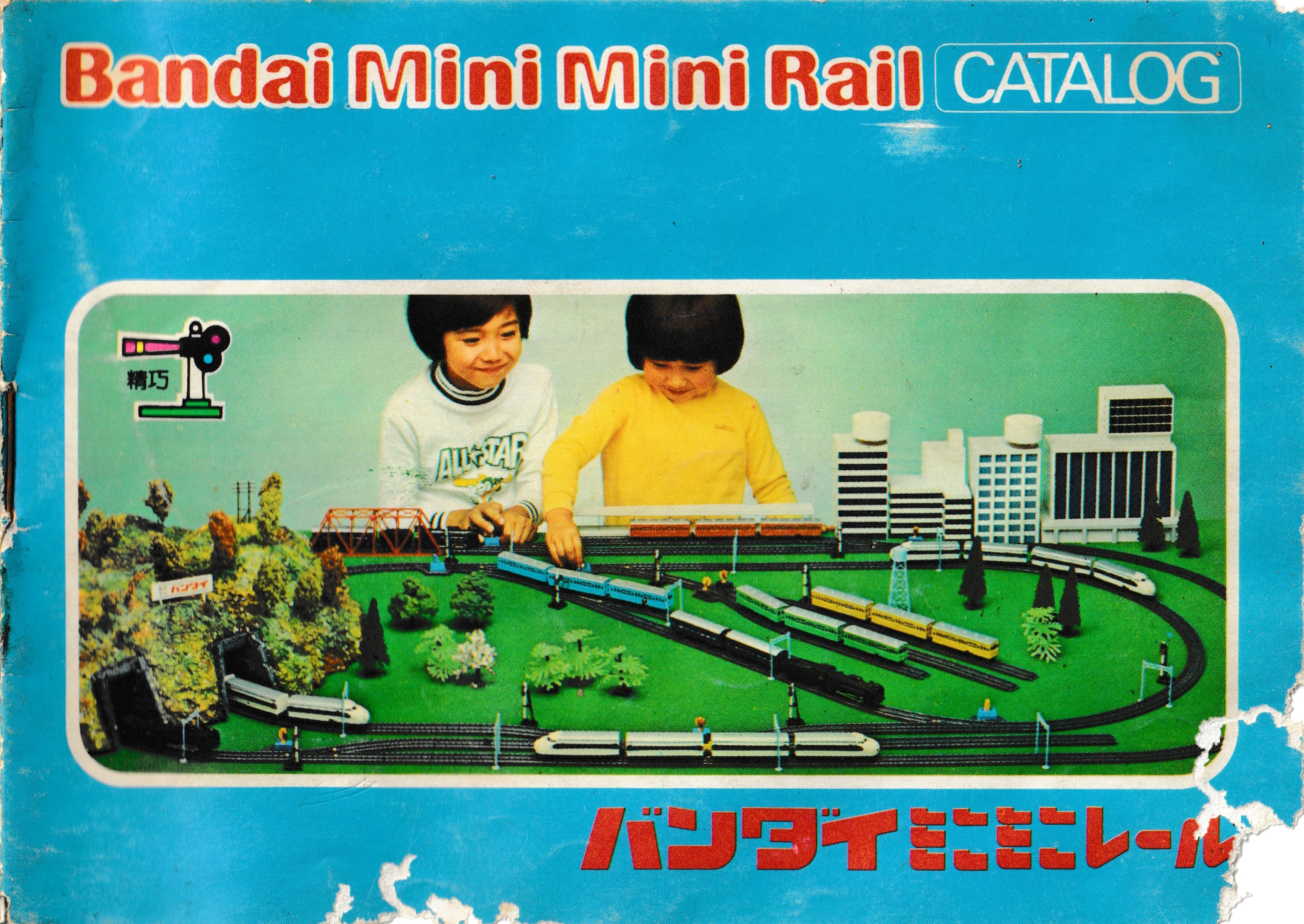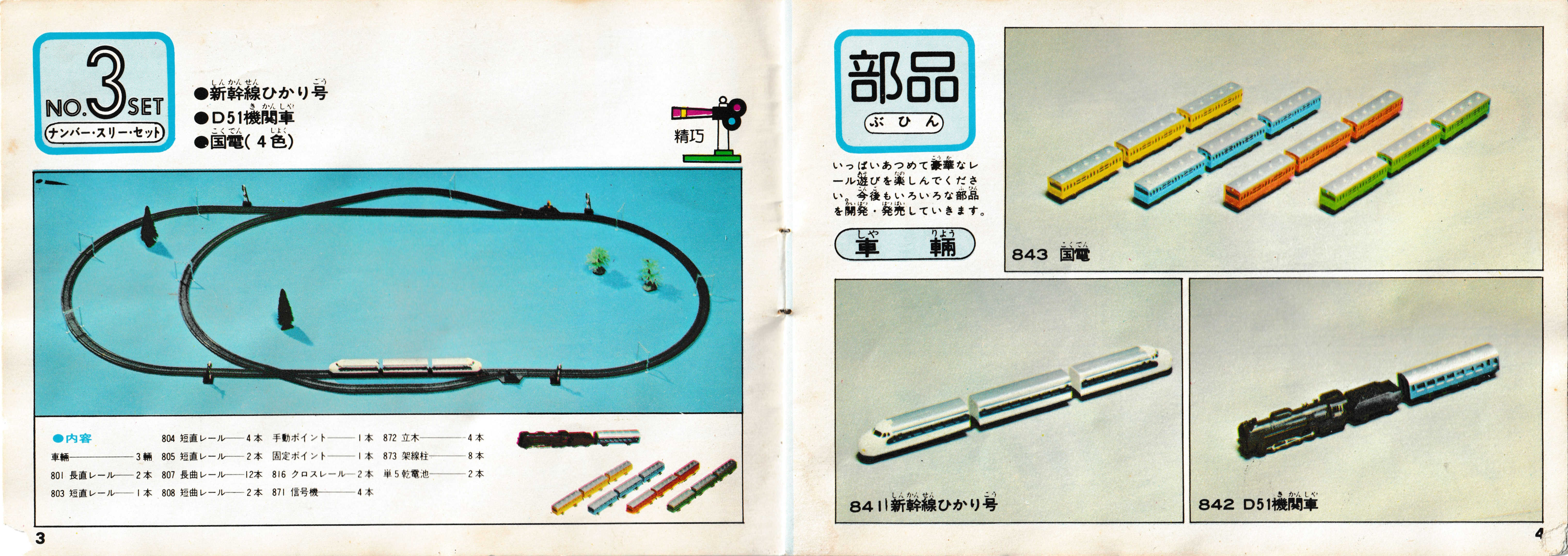 Catalogue from 1975 showing the early non-reversing Bandai Mini Mini Rail range with three sizes of sets and the only trains being the Hikari, D-51, and JNR 103 series. Click photos for full size