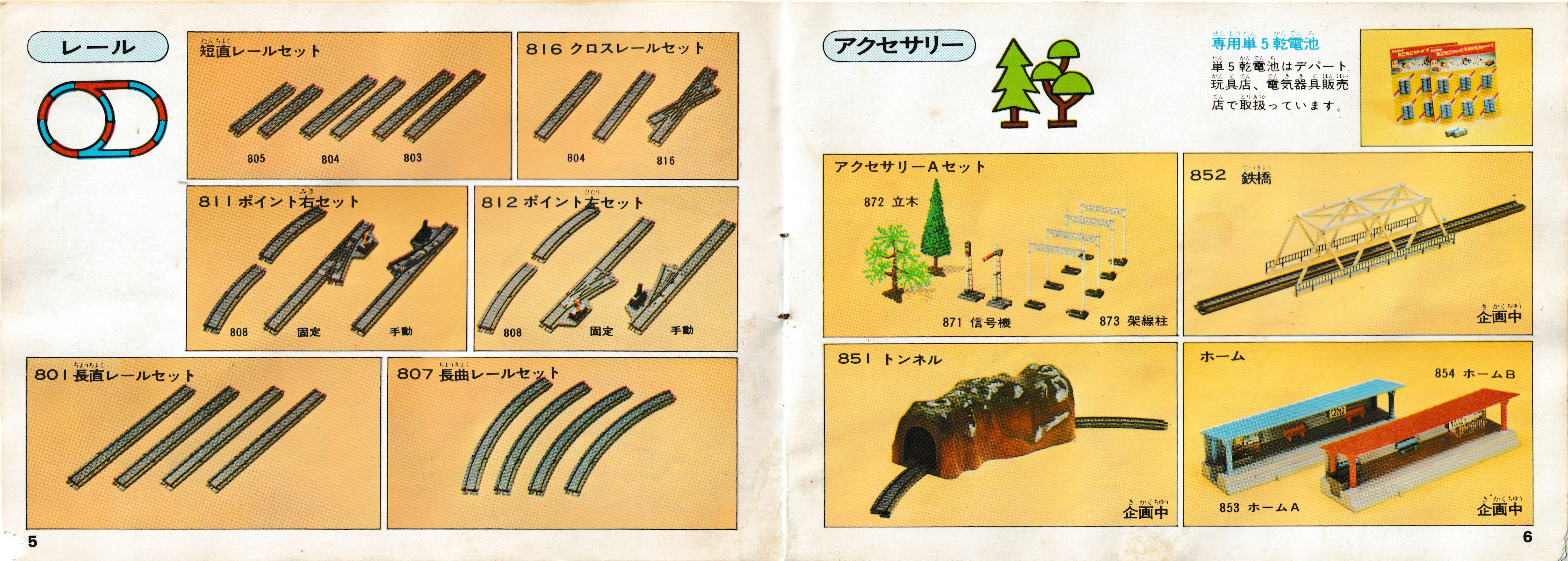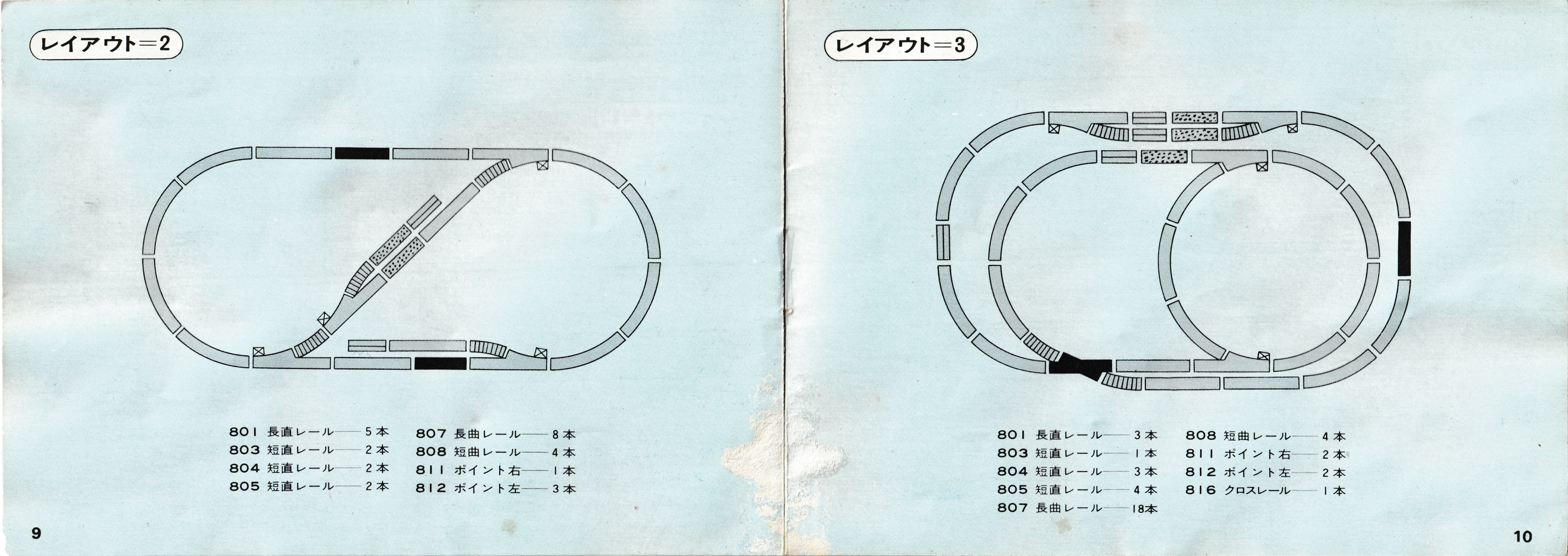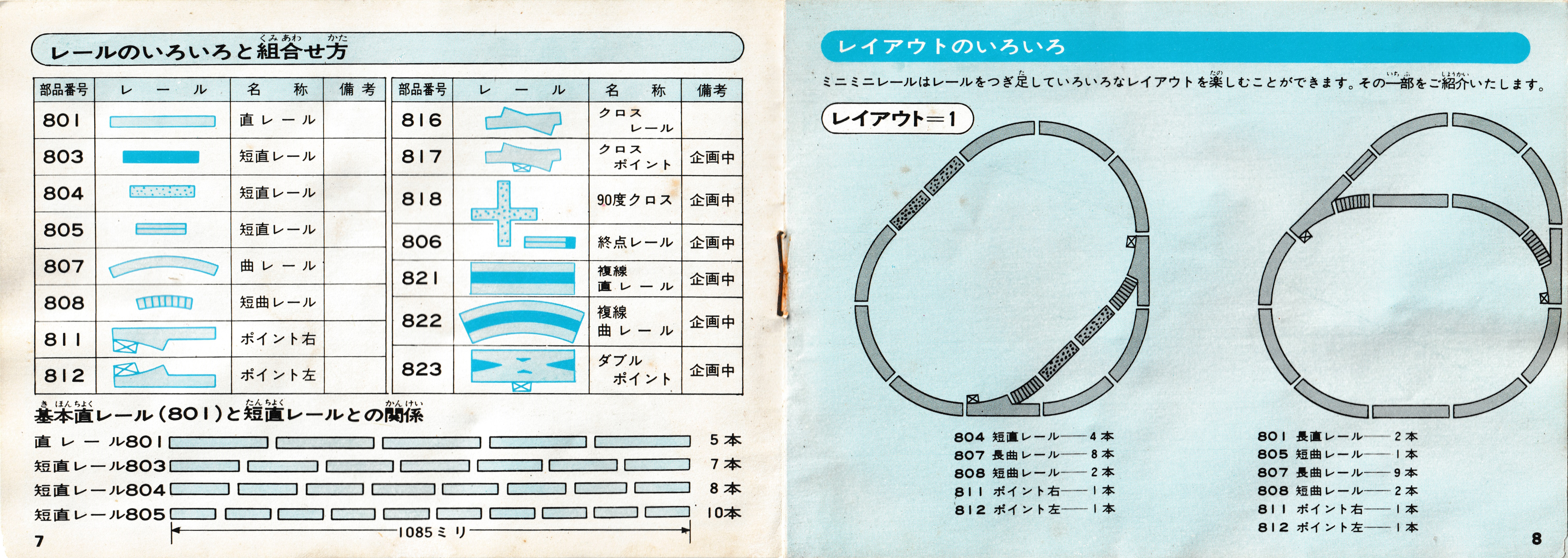 The left page gives the numbers and names of the different rails in the range at the time, although to be honest I do not think I have seen the 917 crossover point with turnout control, 818 crossover point, or 821 double track straight rail and 823 double track crossover point. Then, a few track plans are shown.