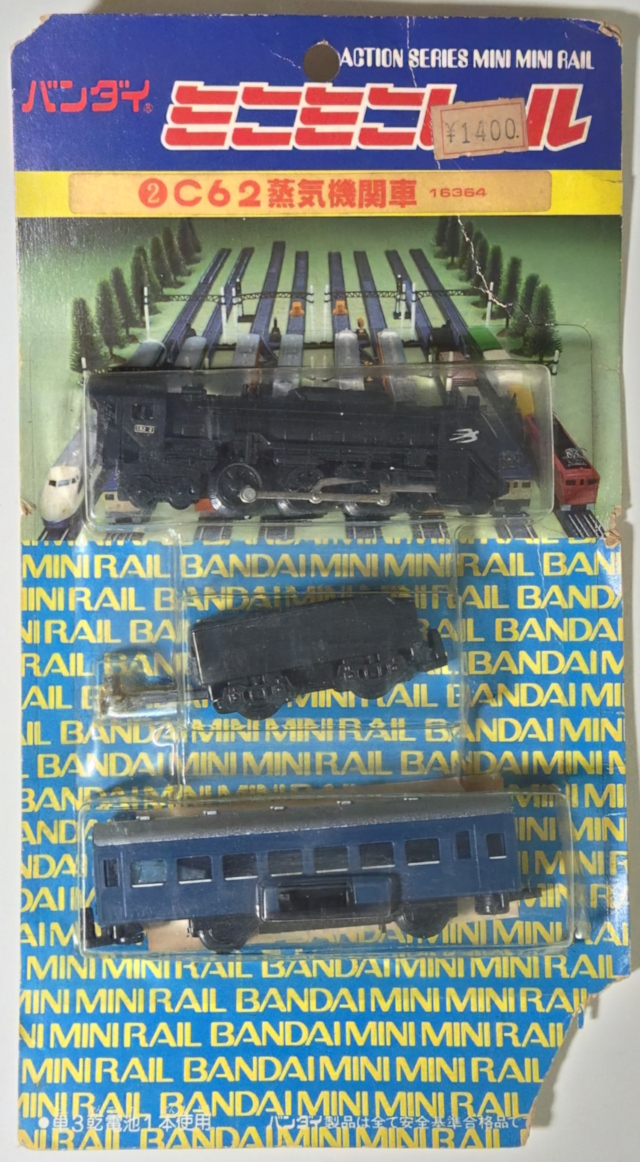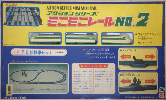 Bandai produced and sold the Mini Mini Rail (ミニミニレール) series of train toys in Japan from 1974 until around 1982. The range features fairly small trains about the same size as N scale trains and aimed to be a more toylike alternative to N scale, which was more expensive and primarily imported into Japan in the 1970s until ranges and makers like Tomix and Gakken began to expand Japanese N scale production and the Japanese N scale market, leading to the N scale boom and the surviving prevalence of N scale in Japan. Bandai had released a similar series of battery powered cars as the Mini Mini Car series the year before - the small size of these cars relative to traditional diecast cars which are often referred to as "mini cars" (this is where the mi and ca in Tomica come from - Tomy mini car) seems to be where the "Mini Mini" name comes from. Other toys like Tomy's Super Rail also aimed to offer an N scale alternative toy train system, and lived on for longer than Mini Mini Rail, and Bandai released the B Train Shorty series of toy trains even closer in gauge to N scale trains in the 2000s.
