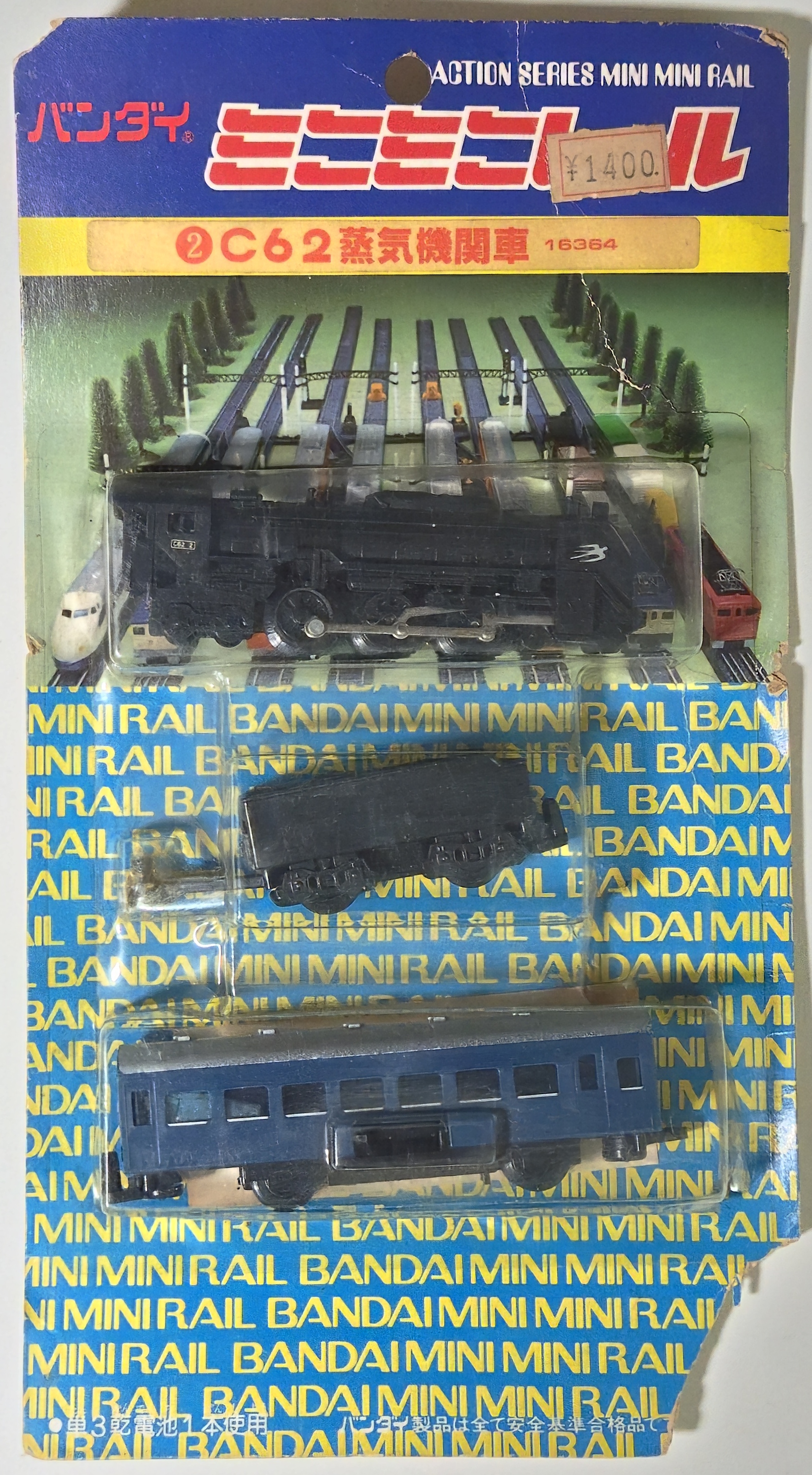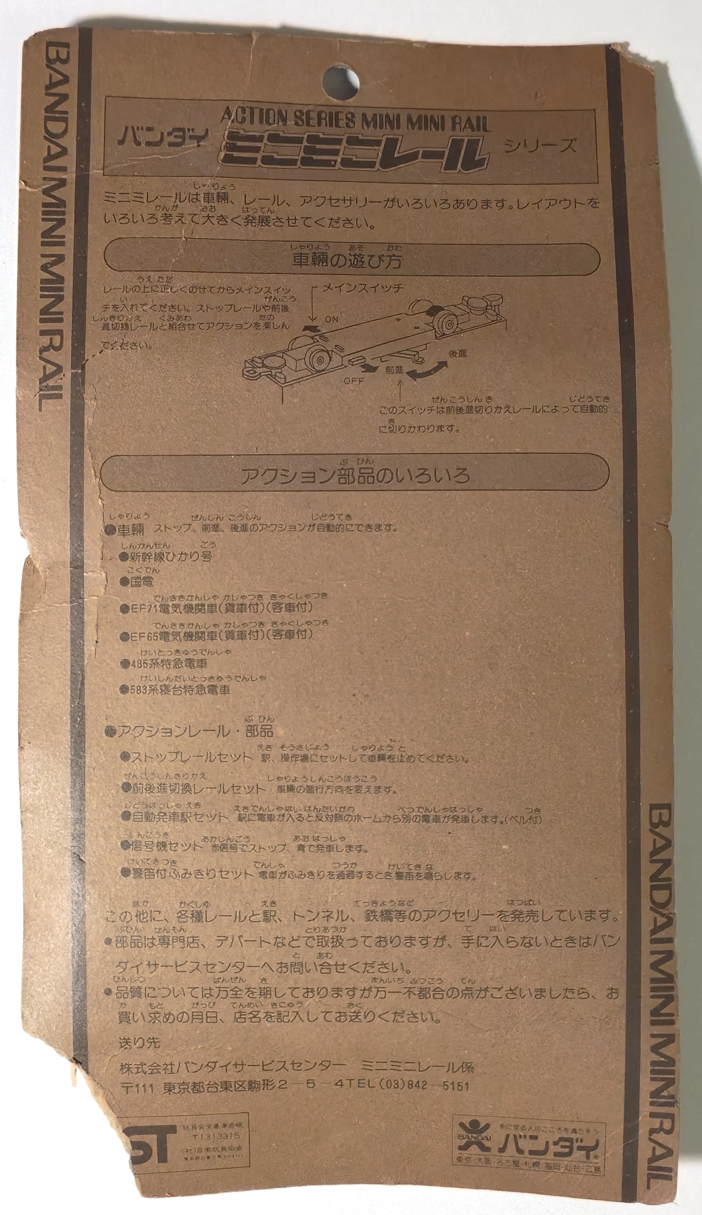 Bandai produced and sold the Mini Mini Rail (ミニミニレール) series of train toys in Japan from 1974 until around 1982. The trains are about the same size as N scale trains and run on rails 10.5mm apart, slightly wider than N scale's 9mm. For the first year or so all trains had a simple on-off gearbox, but starting in 1976 most of the range was updated to the reversing Action Series that also added an electrical cutoff switch. In the later 1970s the reversing chassis was redesigned to use a single AA battery instead of two N size batteries. Mini Mini Rail trains are typically three-car sets, with the motor and batteries located either in the locomotive or the intermediate car of the train. They use pin-style couplings which are easiest to assemble by putting down the locomotive or lead car and then adding more cars onto the end. All of the non-steam locomotive trains are designed to use the same chassis, with the longer unpowered intermediate and tail cars using a dummy chassis with the same footprint. Many toolings were reused with different plastic and paint colors to represent different trains and liveries as well as colors of freight cars.