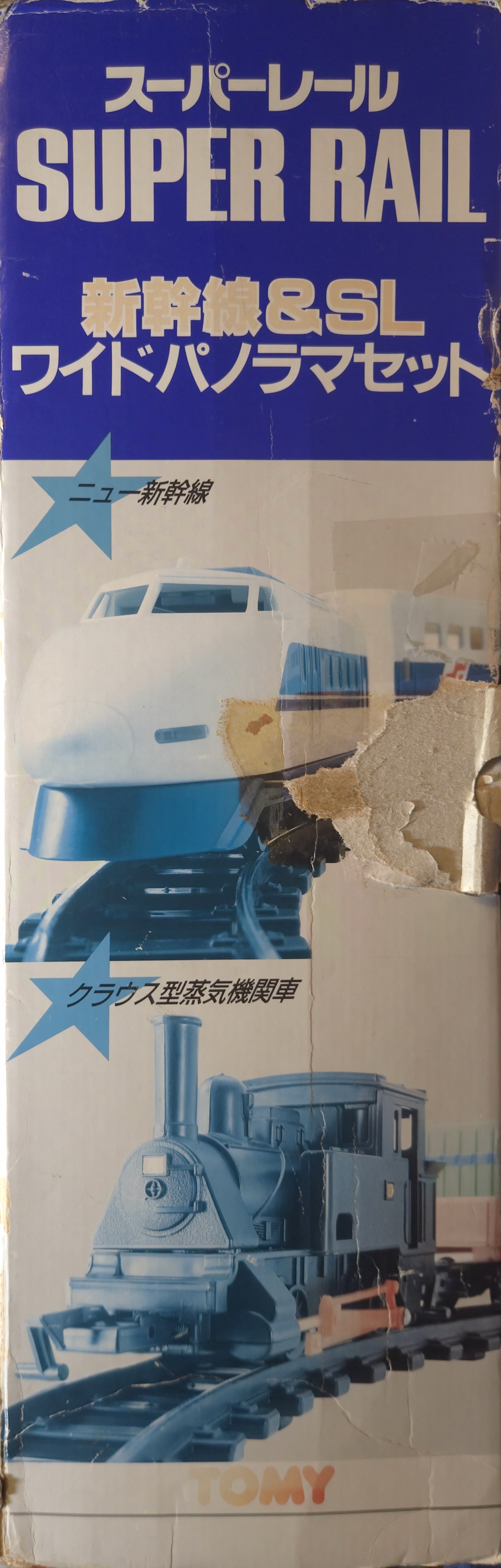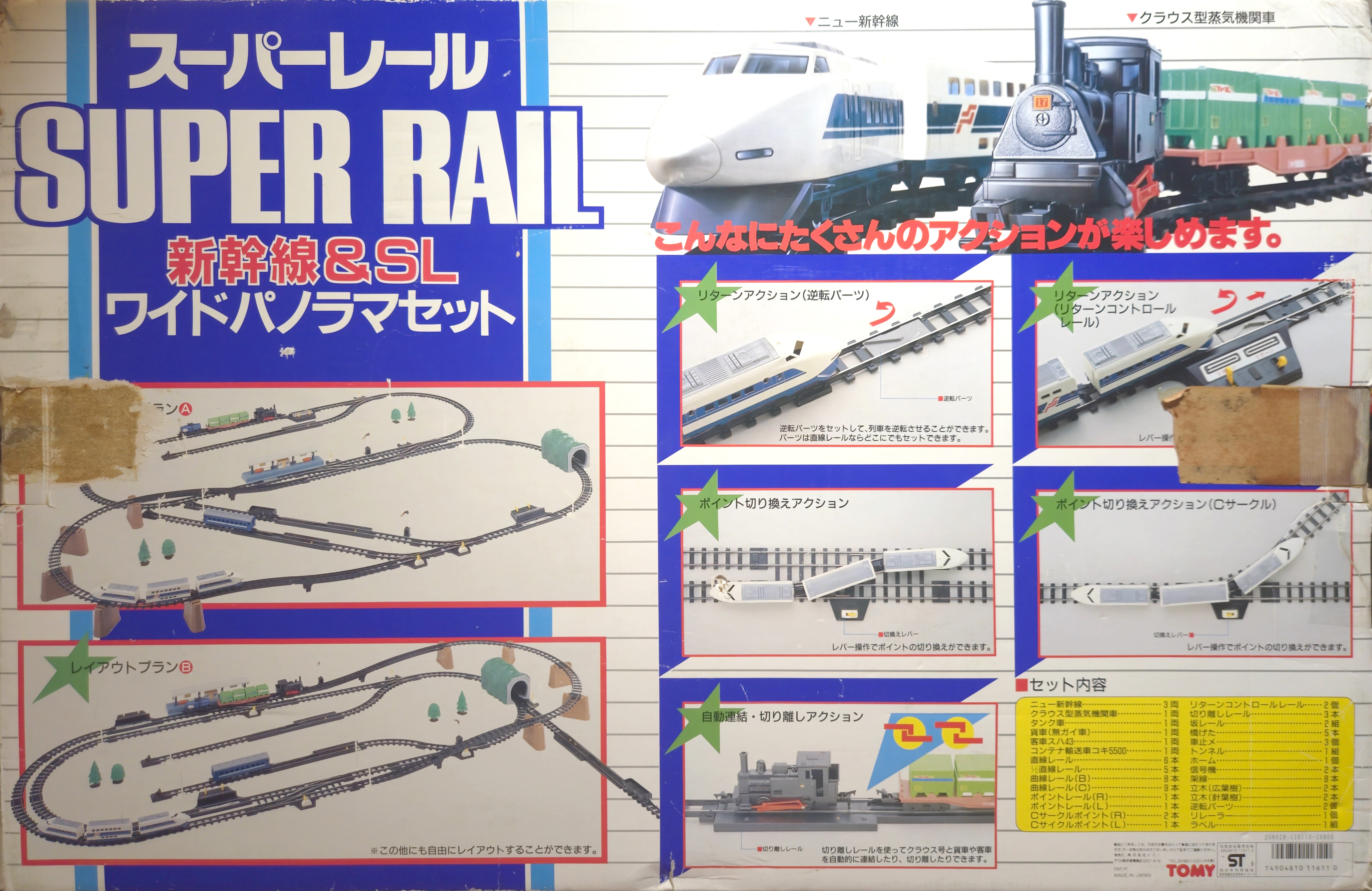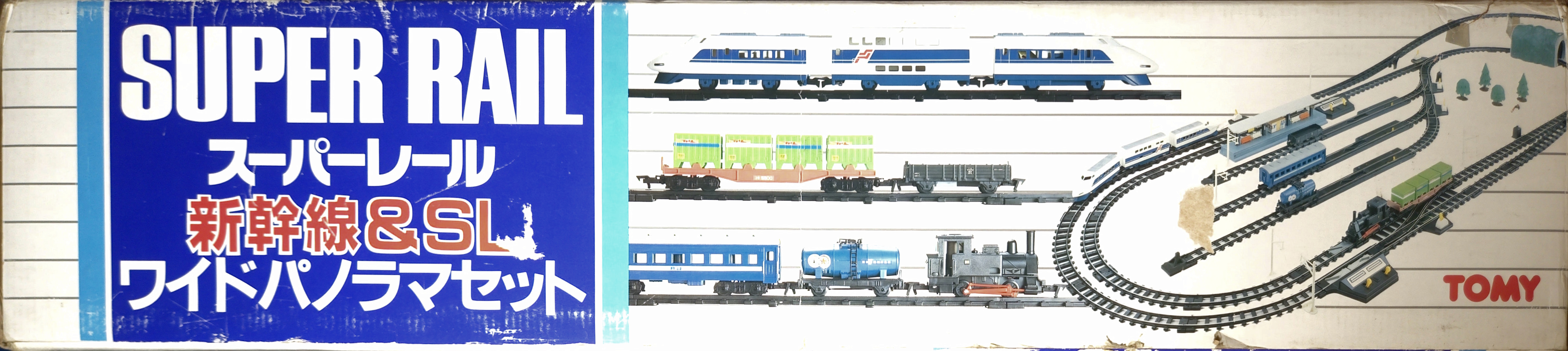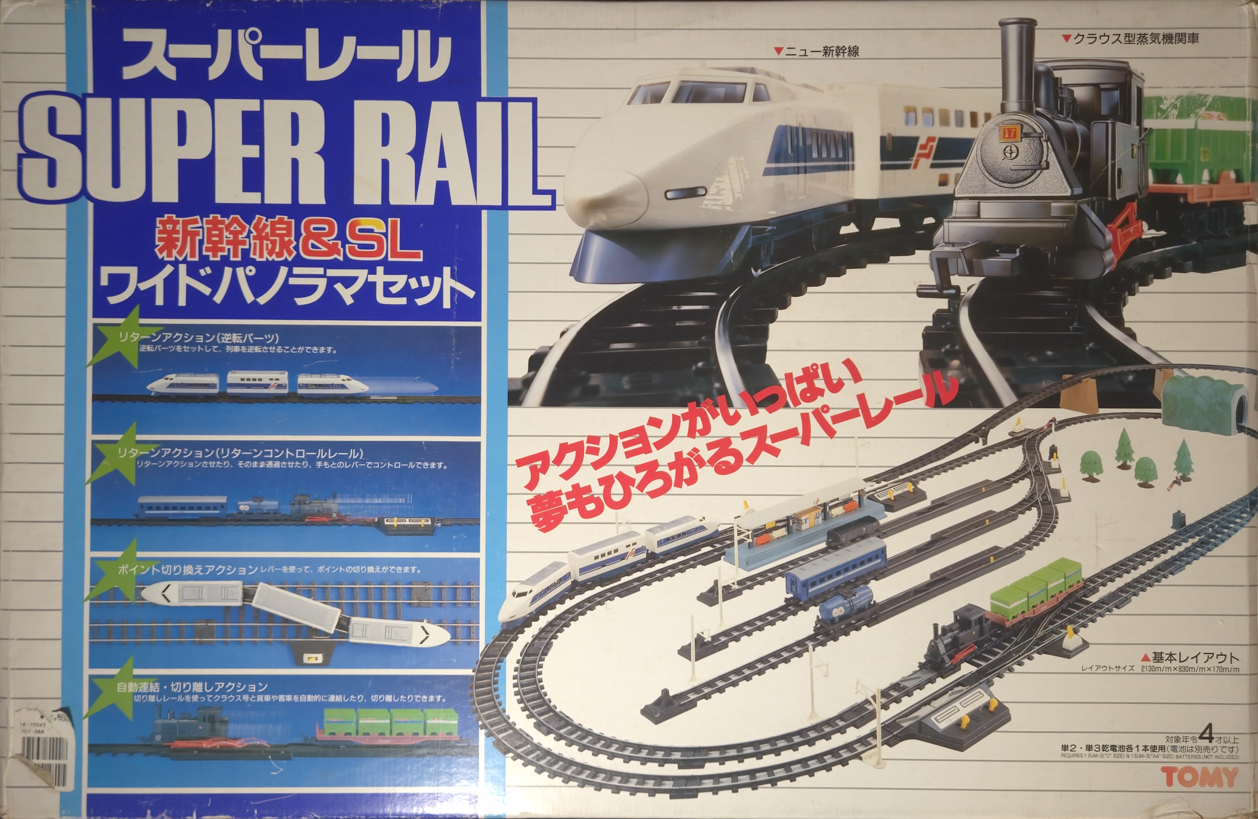 The largest Super Rail set, and the only set with more than one train, was the Shinkansen and Steam Locomotive Wide Panorama Set (新幹線&SL ワイドパノラマセット) which released in 1989. It features a large concentric-loop layout with elevation and a yard with several uncoupling rails.