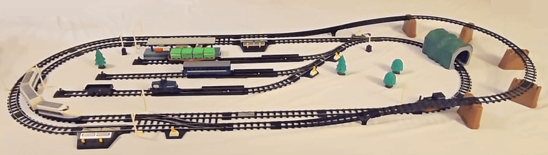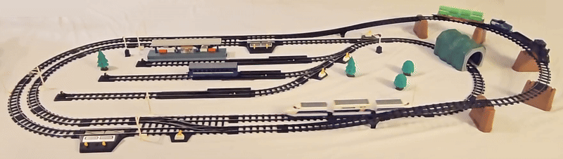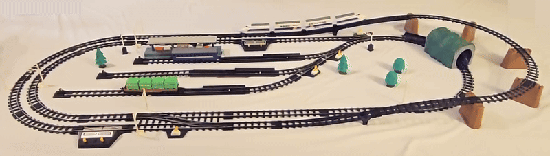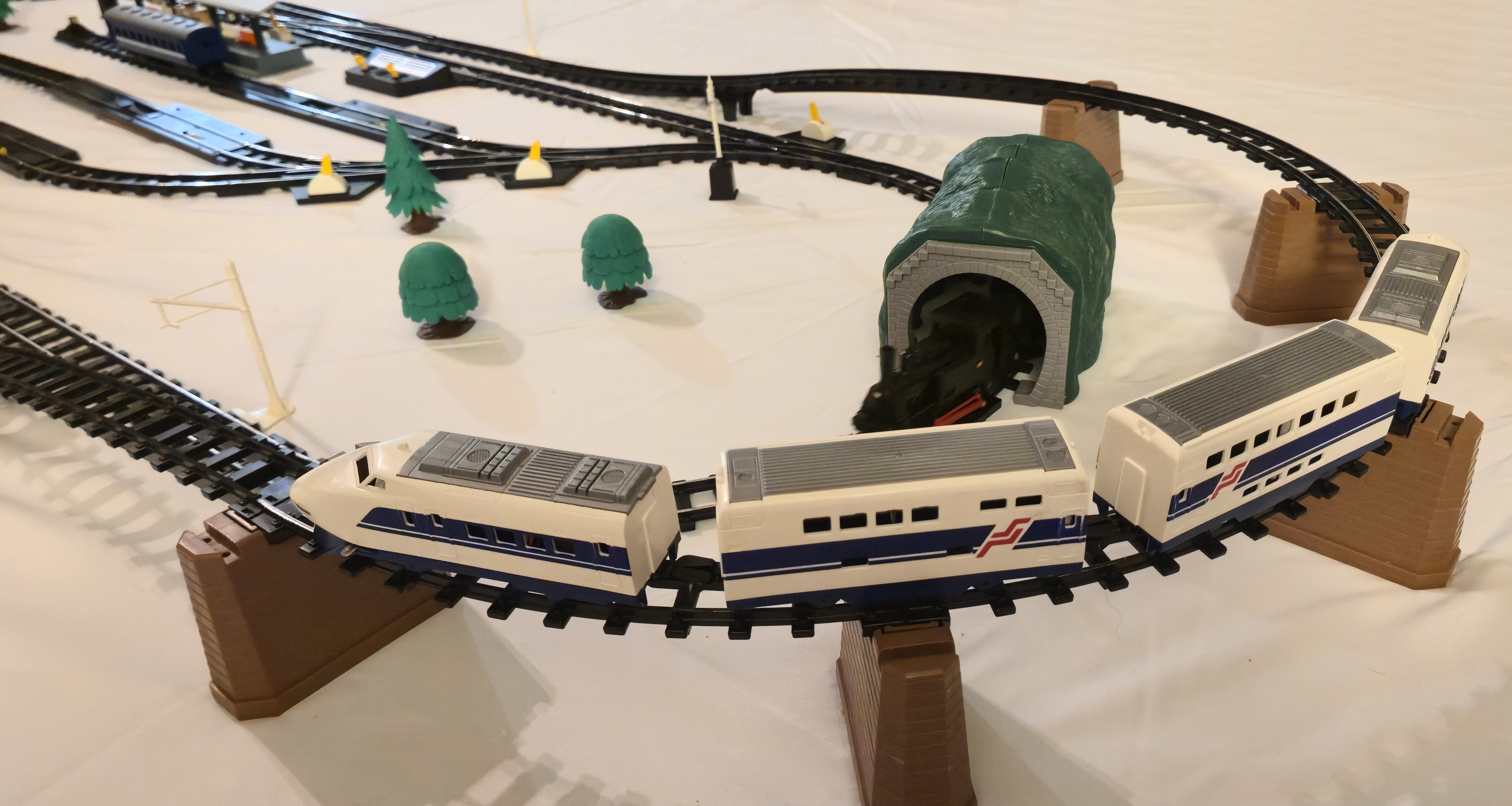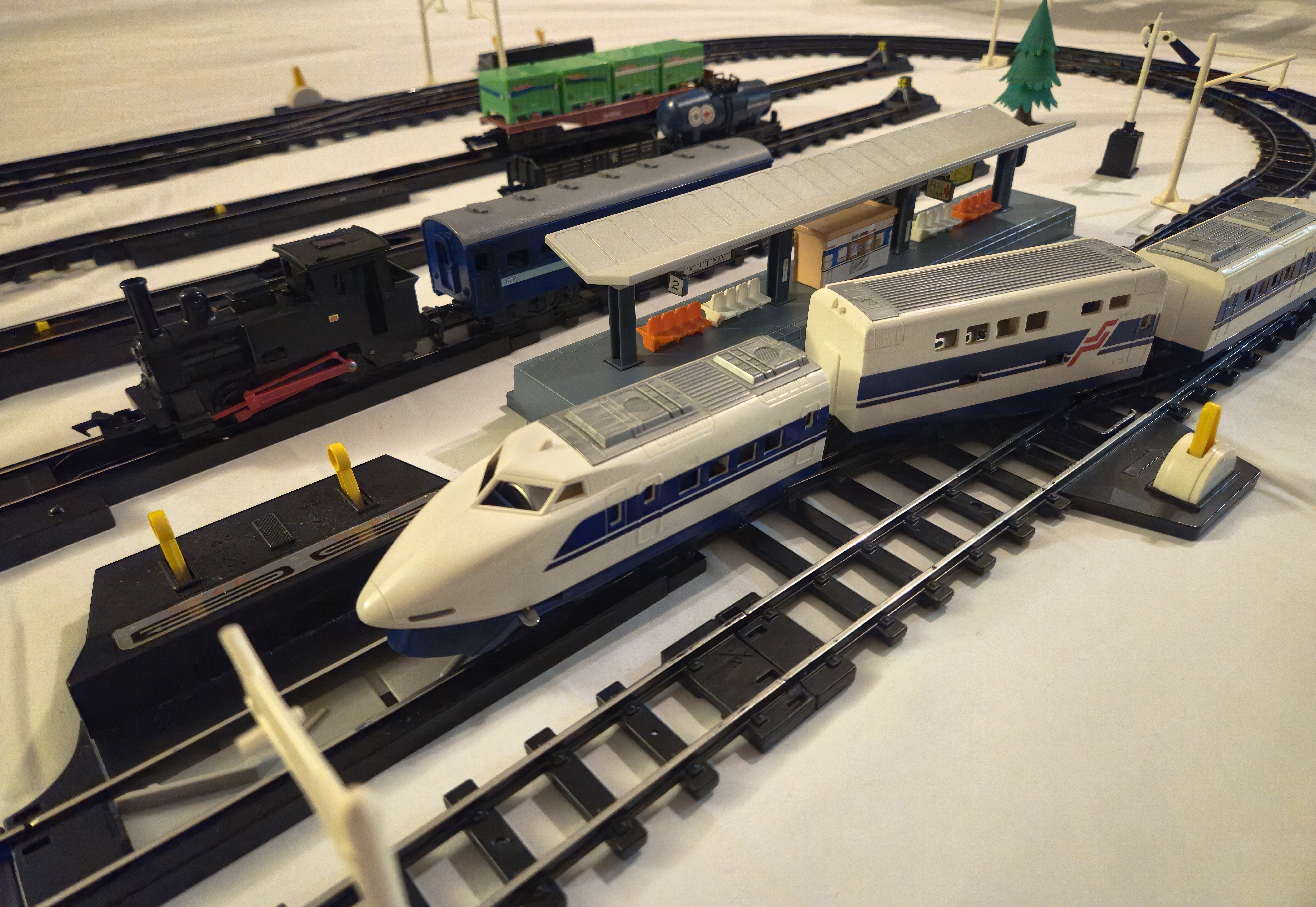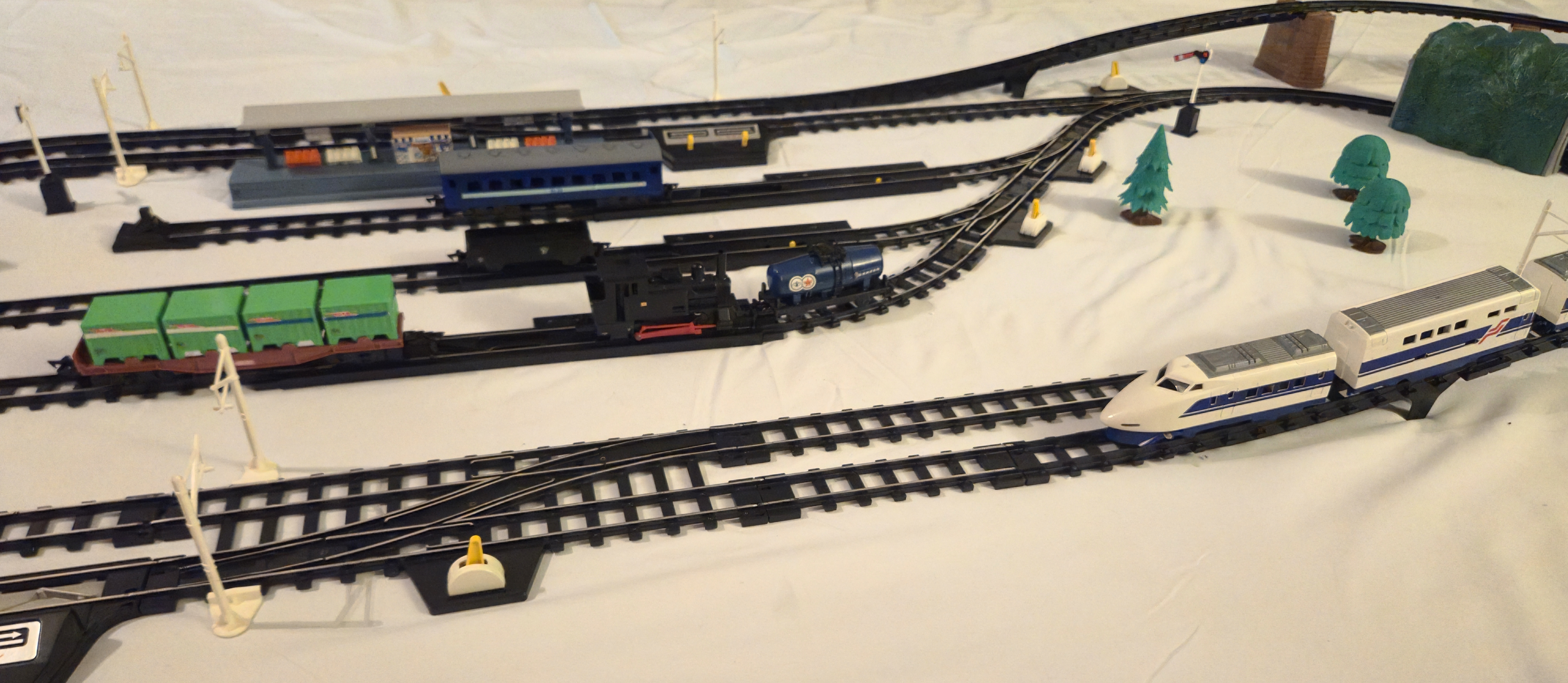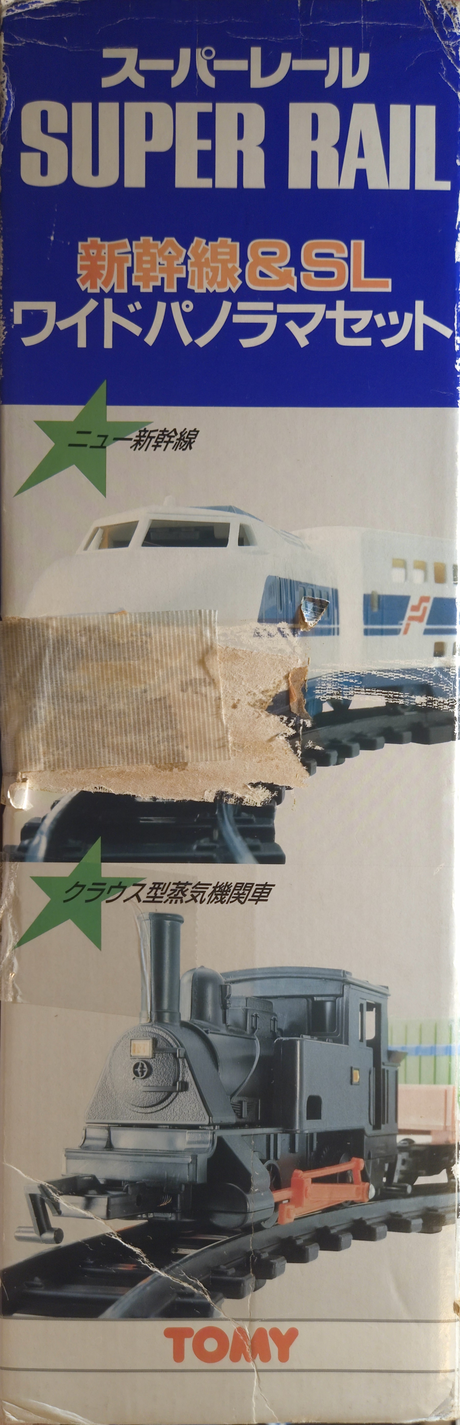 The largest Super Rail set, and the only set with more than one train, was the Shinkansen and Steam Locomotive Wide Panorama Set (新幹線&SL ワイドパノラマセット) which released in 1989. It features a large concentric-loop layout with elevation and a yard with several uncoupling rails.