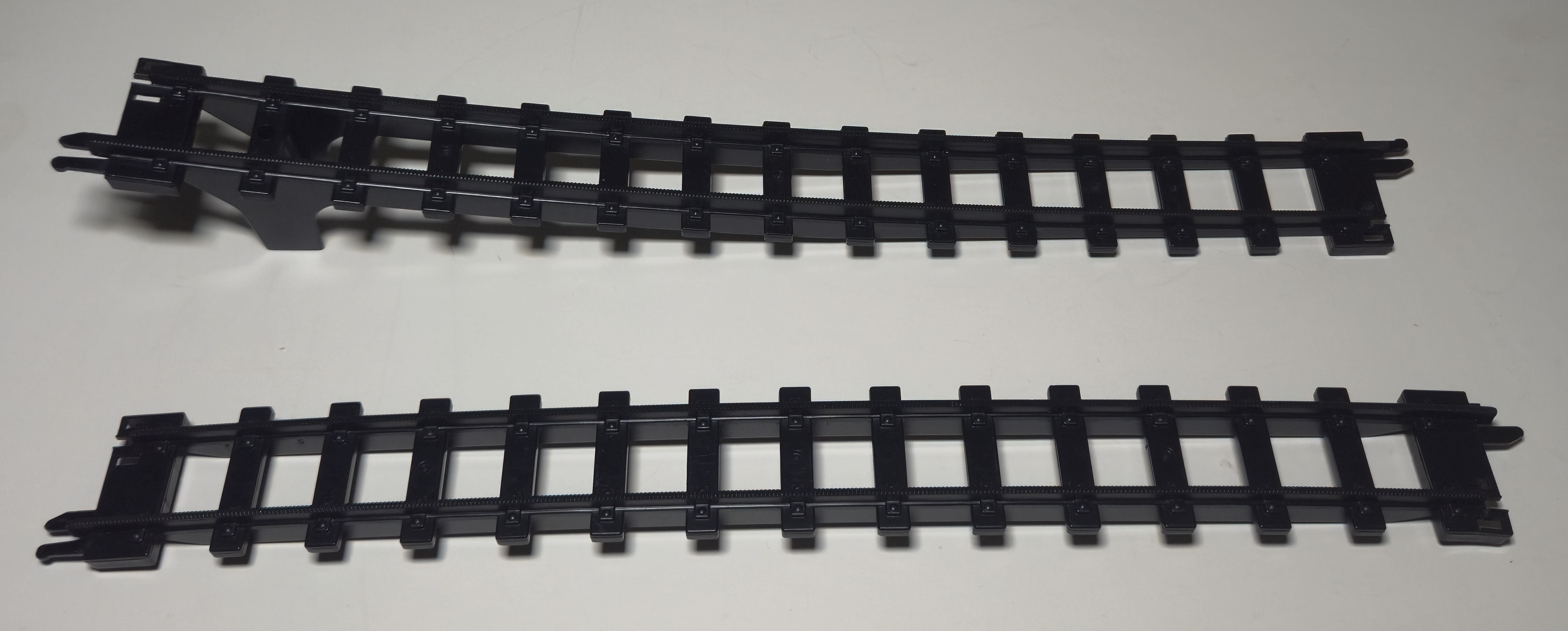 Three turnouts are included to branch off and form a yard with the three uncoupling rails, and part of the outer loop is elevated with the nice two-straight-long slope rails.