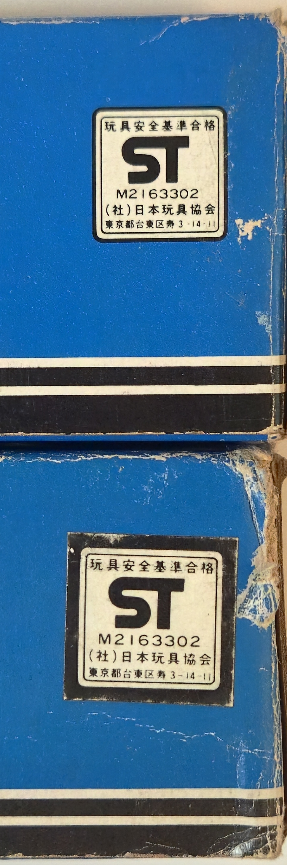 This was right around the height of the Blue Train Boom, which rose in the later 1970s. A Blue Train sticker was affixed to some boxes. The ST mark on my Blue Train stickered box is itself also a sticker, with a presumably later box having the same 1979 test date printed instead.