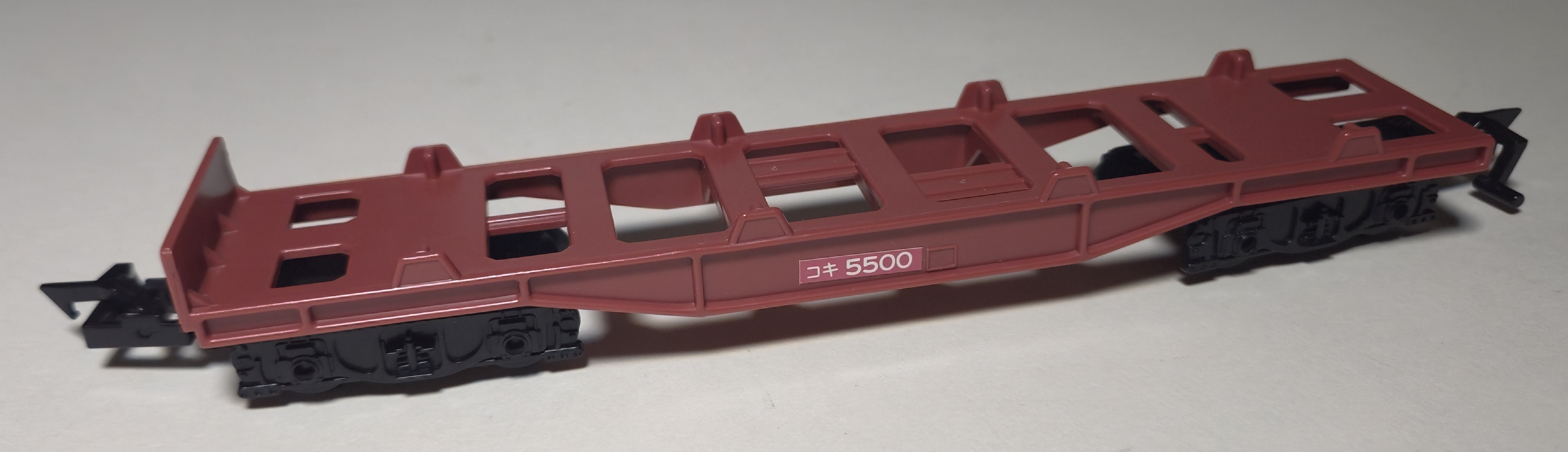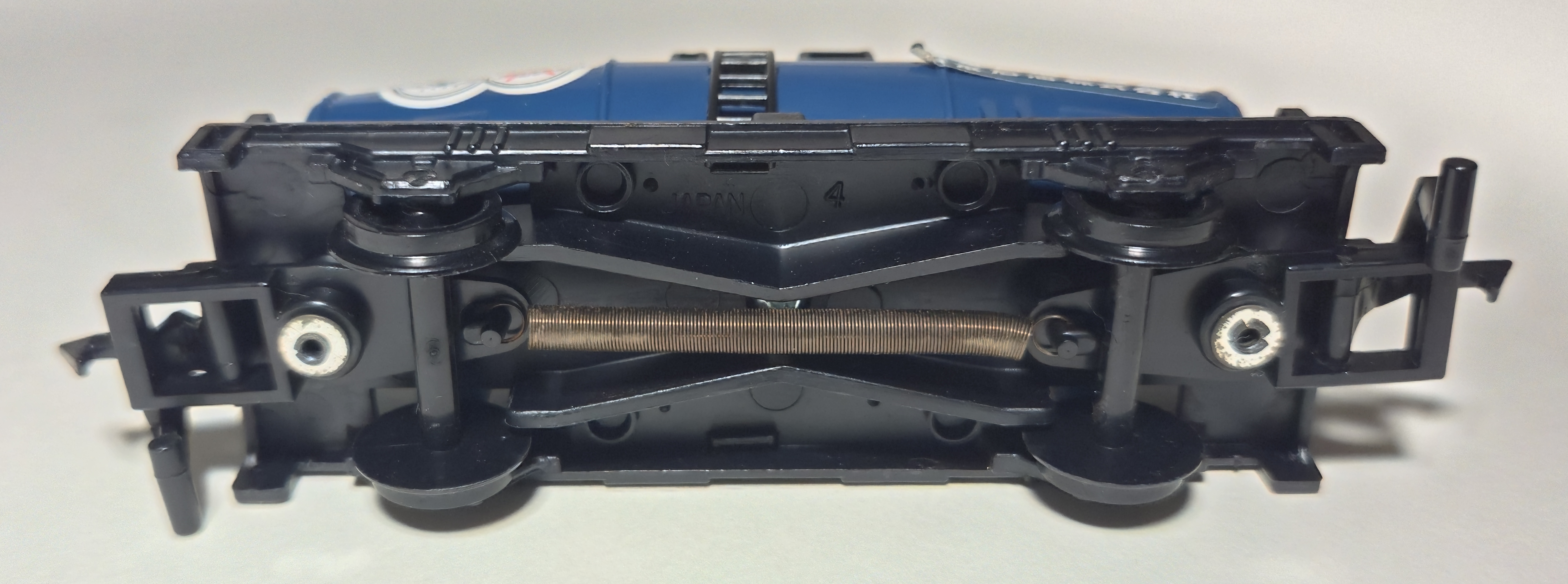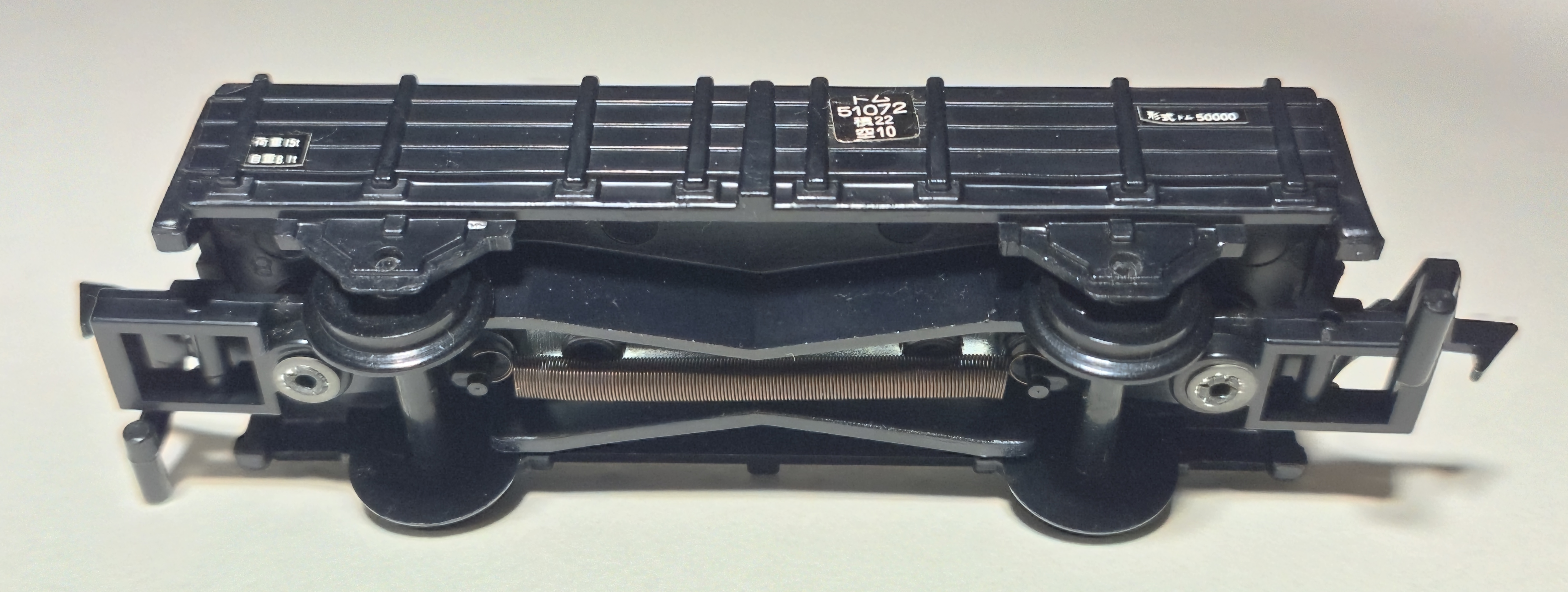 Like other two-axle rolling stock, a spring underneath holds the couplings in tension and allows the coupling gimmick to work. It was also released in black with stickers in the five-car freight car pack. The earlier coupling hooks are clipped onto an axle molded into the rotating catch, but later hooks have the axle molded into their base and clip into holes in the receptacle.