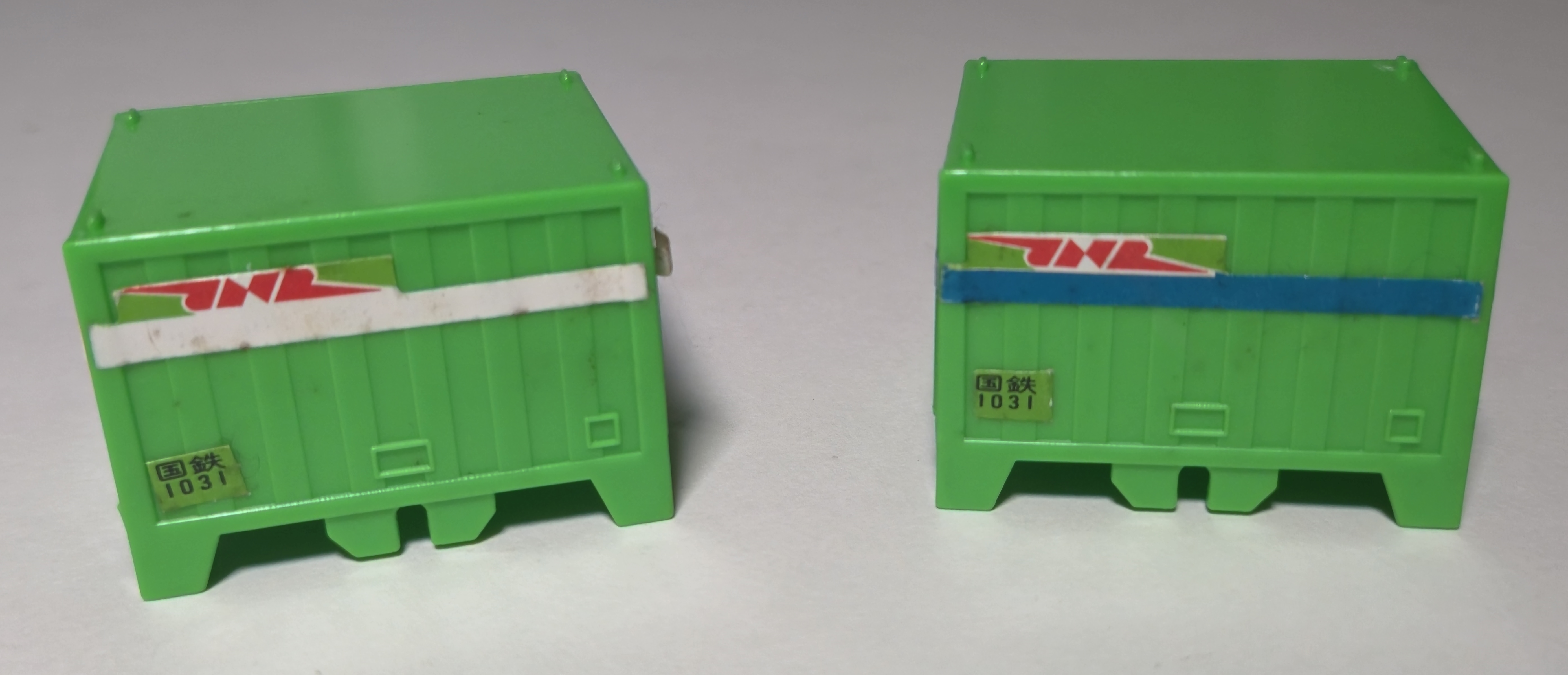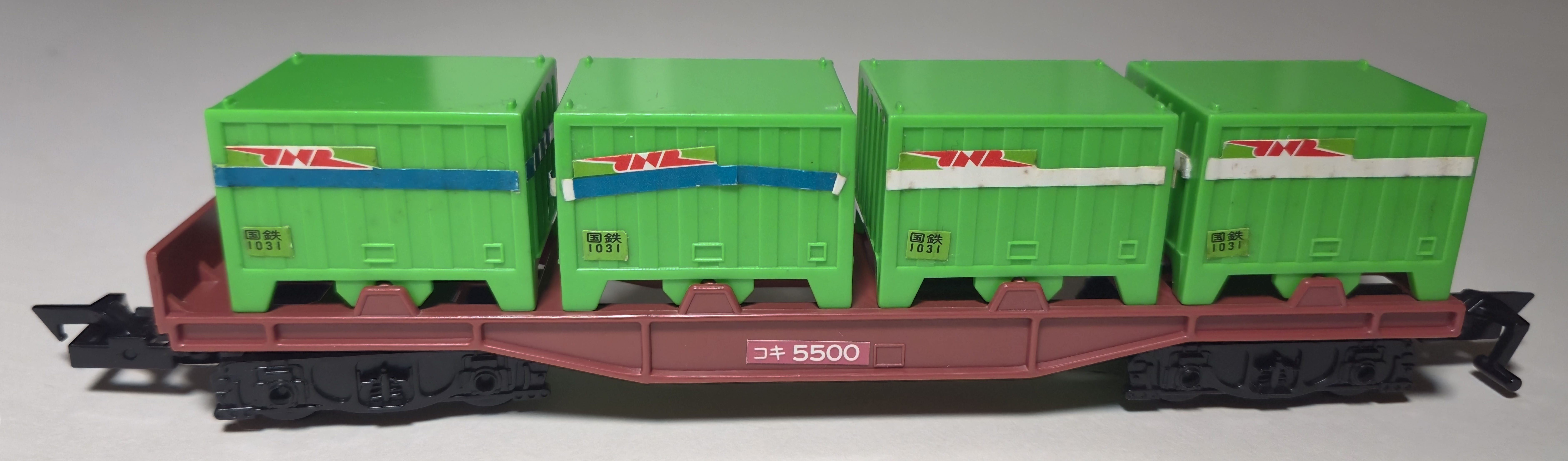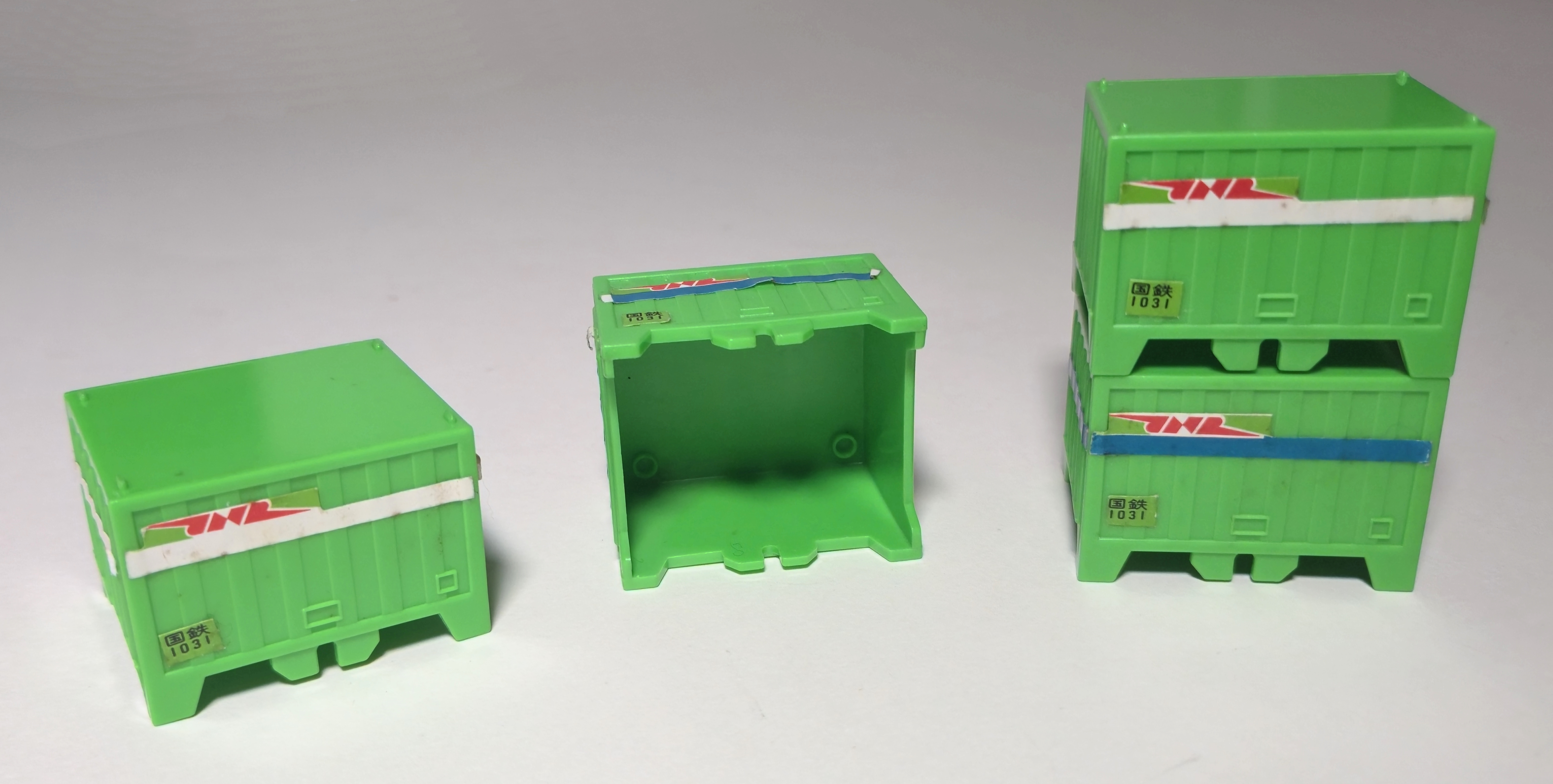 The containers are removable and stackable, of course, and predate the Plarail container wagon with similar removable containers.