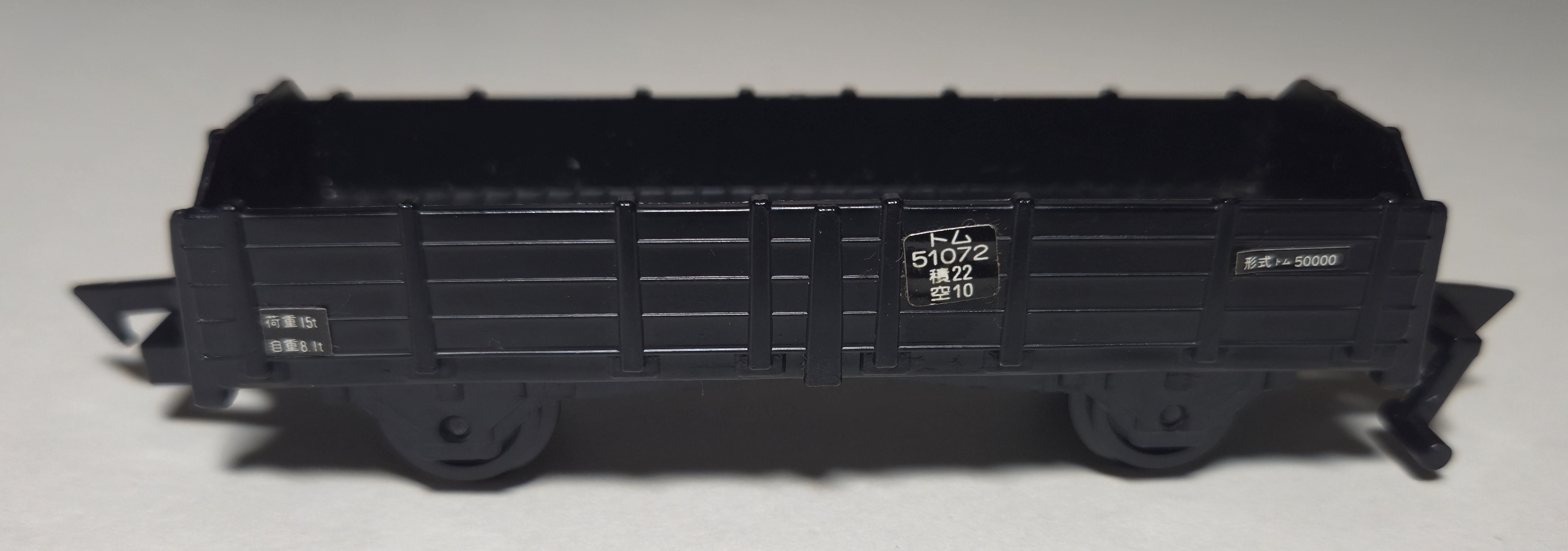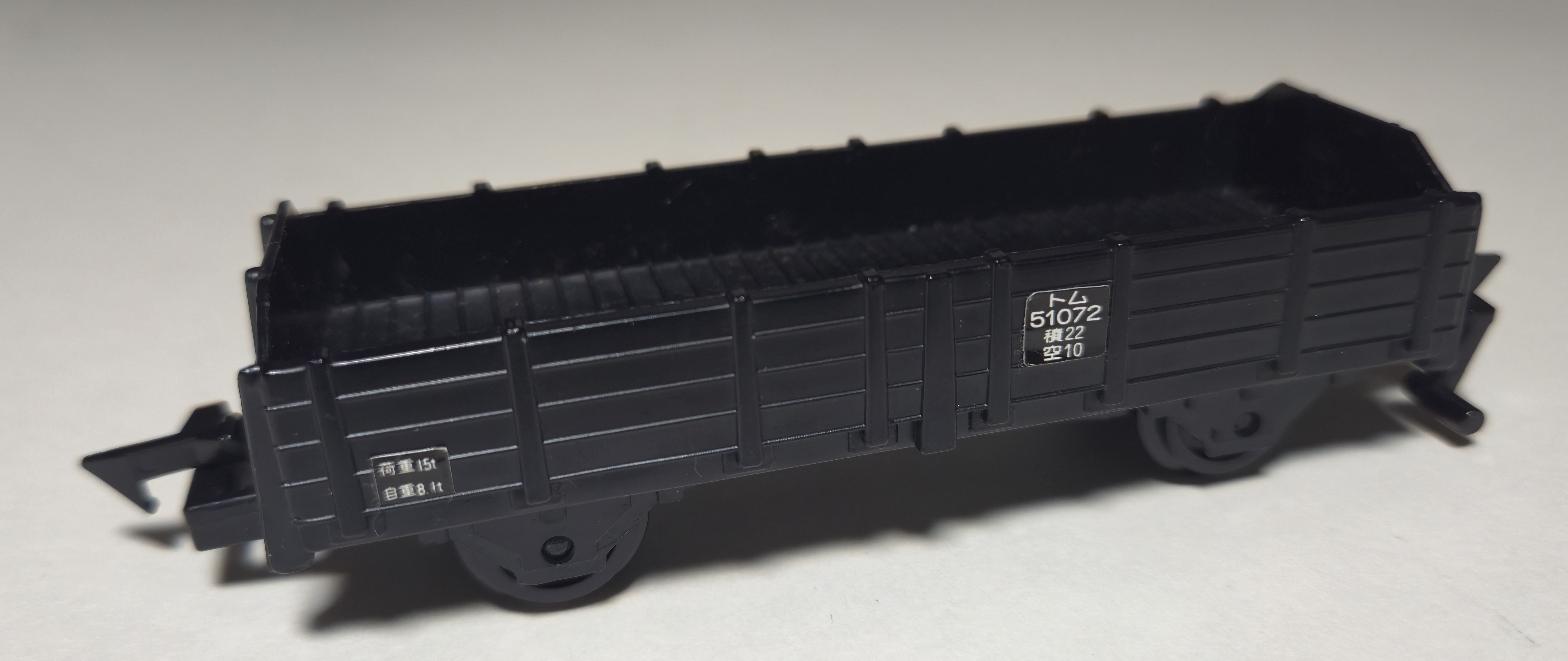 This open wagon was first introduced in one of the early 1974 "10s System" sets in black without stickers. It was also produced in orange and brown alongside the black car (all with stickers) in the Super Rail Black era, but black seems to be the most common.