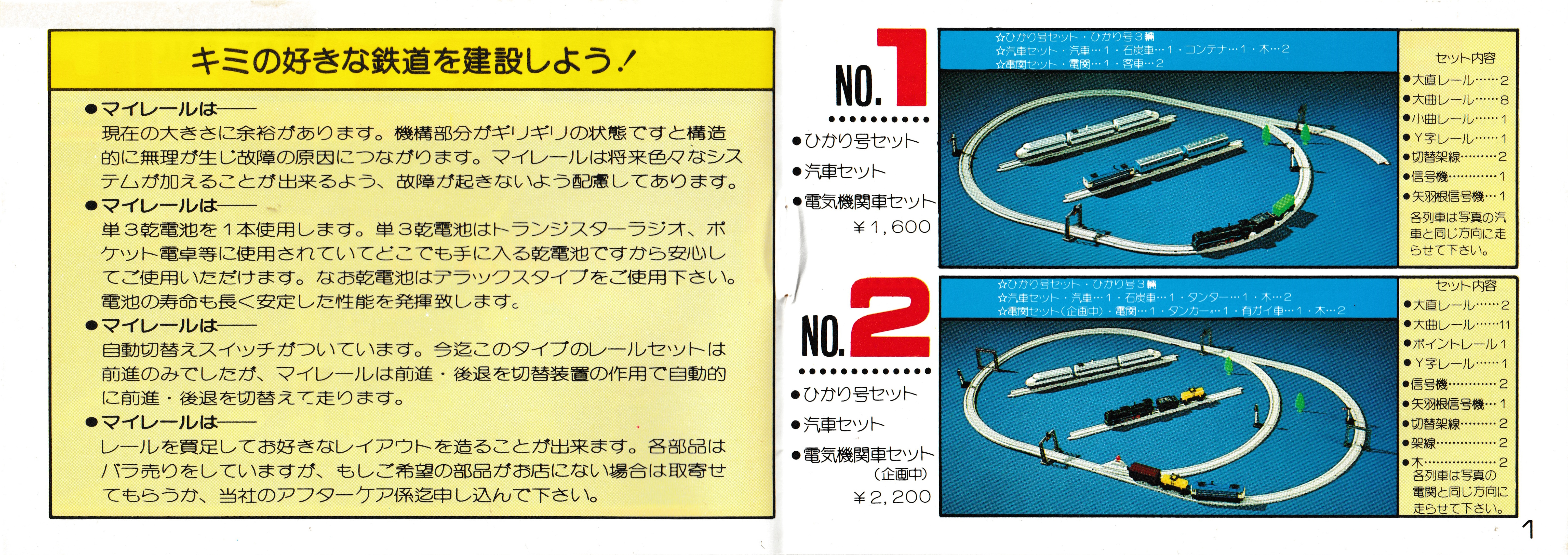 The left panel talks about some of the features of My Rail - I suspect they were aware of Mini Mini Rail, and they point out that My Rail works on AAs and reverses, two things Mini Mini Rail did not do in 1975 but would be adapted to do in the later 1970s. All types of sets were planned to eventually be sold with each of the three trains - the catalogue notes that some combinations were still in the preparation stage. All trains appeared in the oval with siding No. 1 set but the EF-65 had not yet been released in the No. 2 passing loop set at the time of printing.