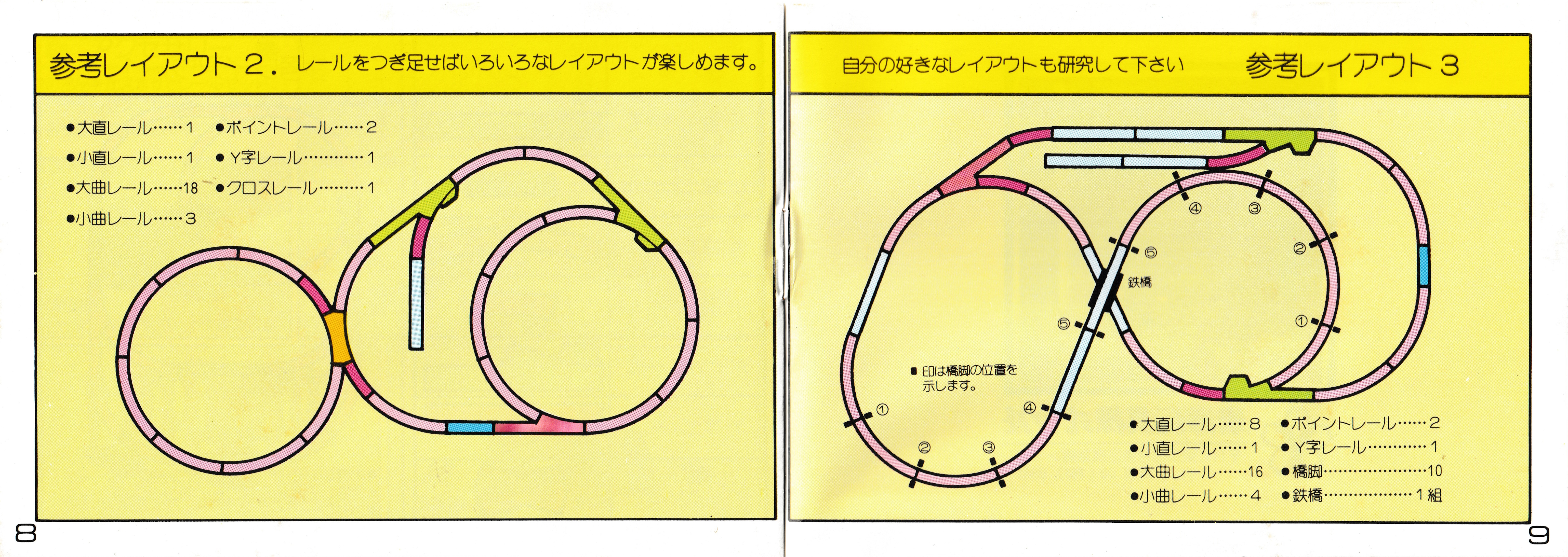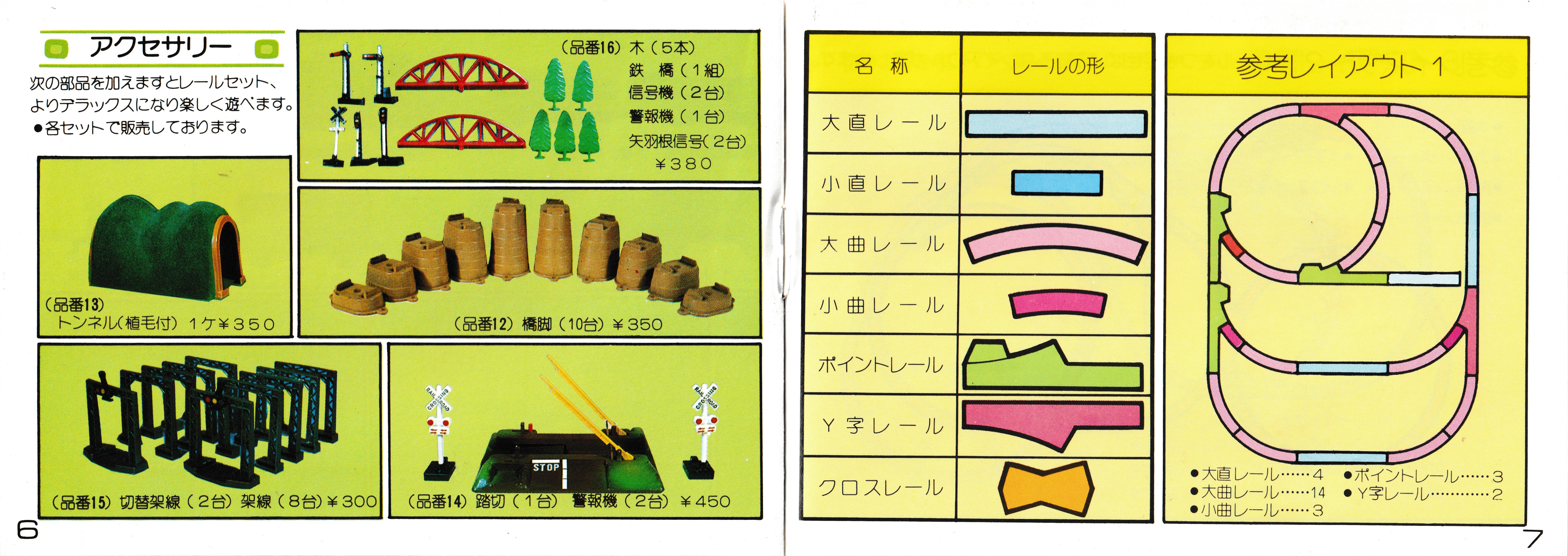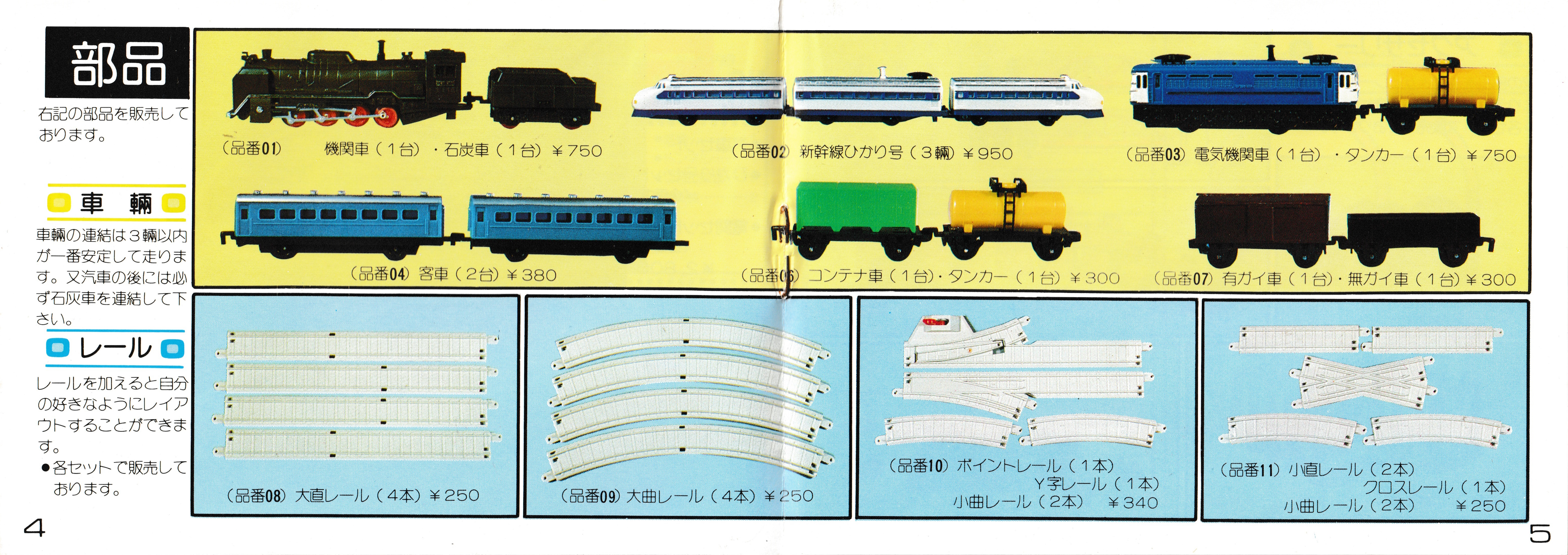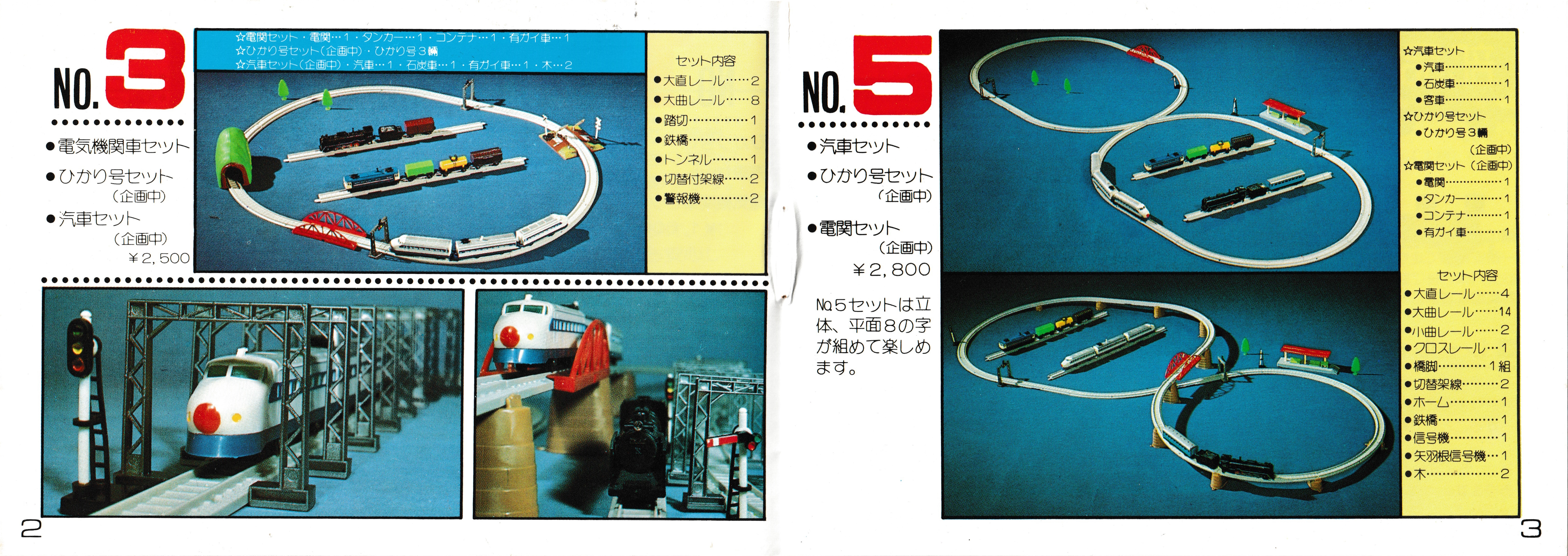 The accessory-focused No. 3 and larger No. 5 sets. The 5 set has parts to make an elevated or flat figure eight. An August 1975 advertisement includes the Nos. 1, 2, and 3 sets with D-51, number 1 and 2 Hikari sets, and No. 1 and 3 Electric Locomotive sets. The No. 5 set is also shown at the top of this advertisement, and a No. 6 set with a multi-story building and even a new double curve rail was later released.
