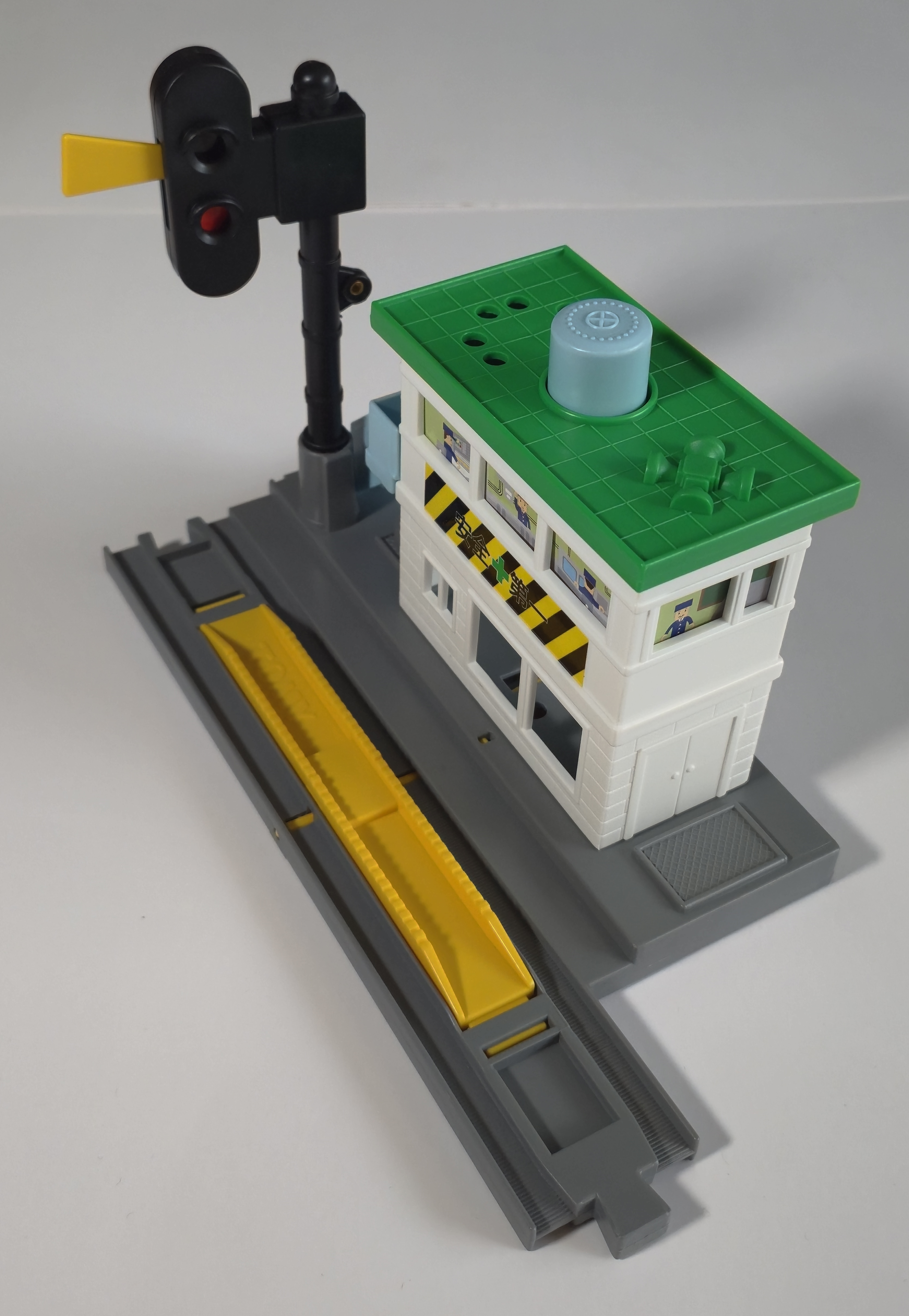The signal's arm and the position of colored stickers inside the signal housing change with the stop rail. The blue stack on the roof can be pushed down to make a whistle sound.
