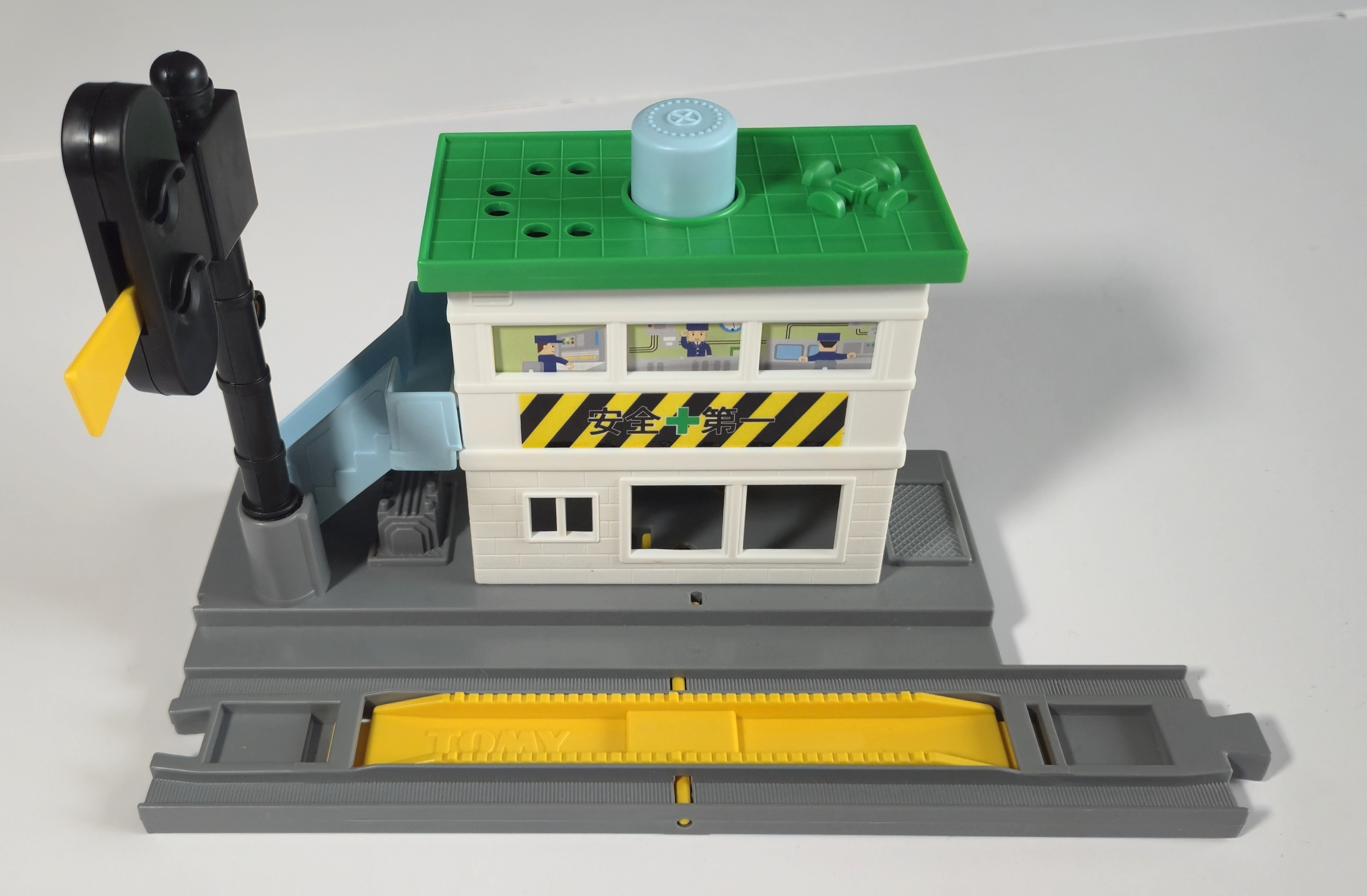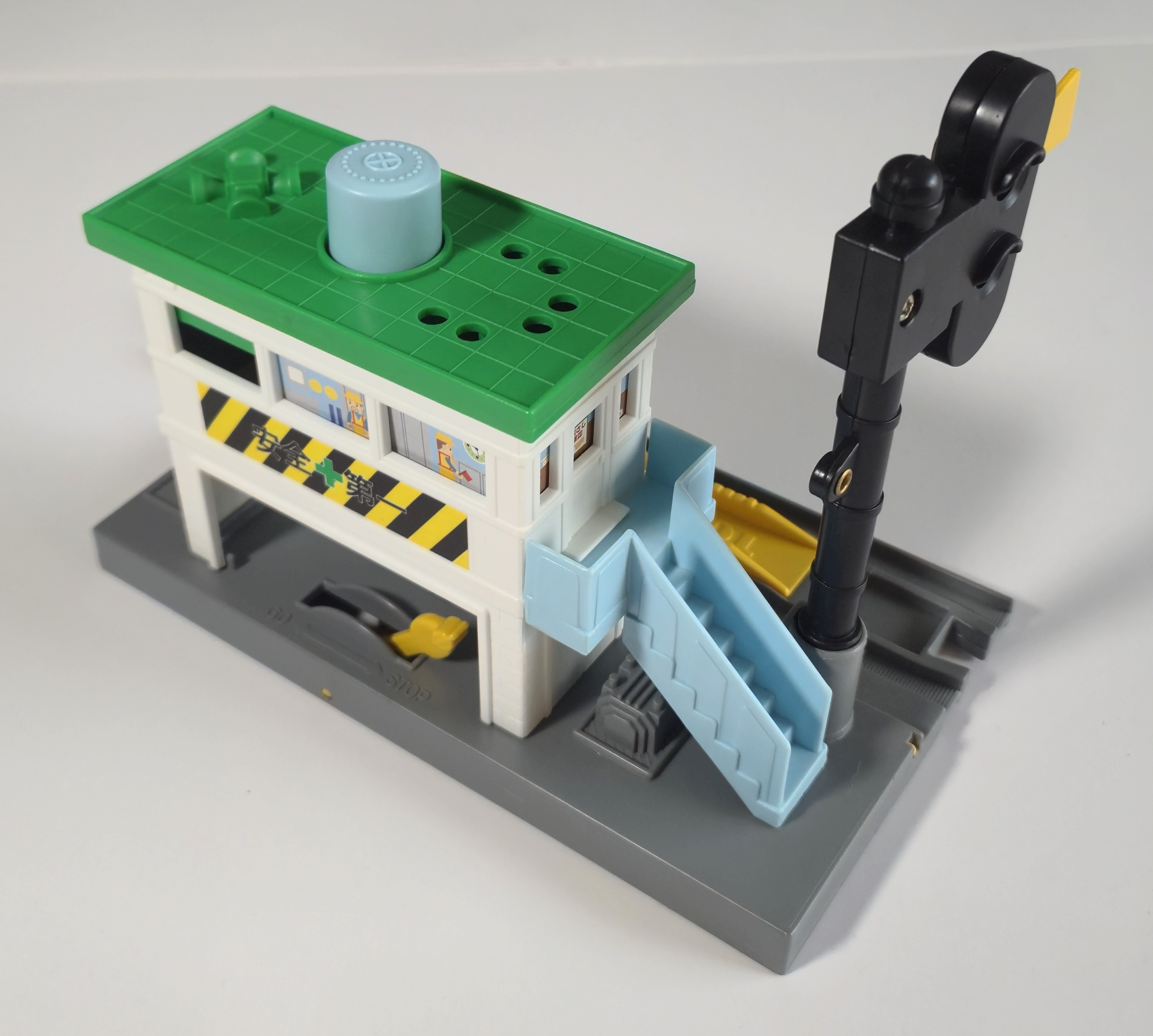 The Plarail Signal Station (しんごうじょ) was first released in 1975 and represents a signal box with signal and stop rail which can be flipped from a lever in the lower level of the building. During Japanese production the station had concave connections on either end and included two bean joint rails.