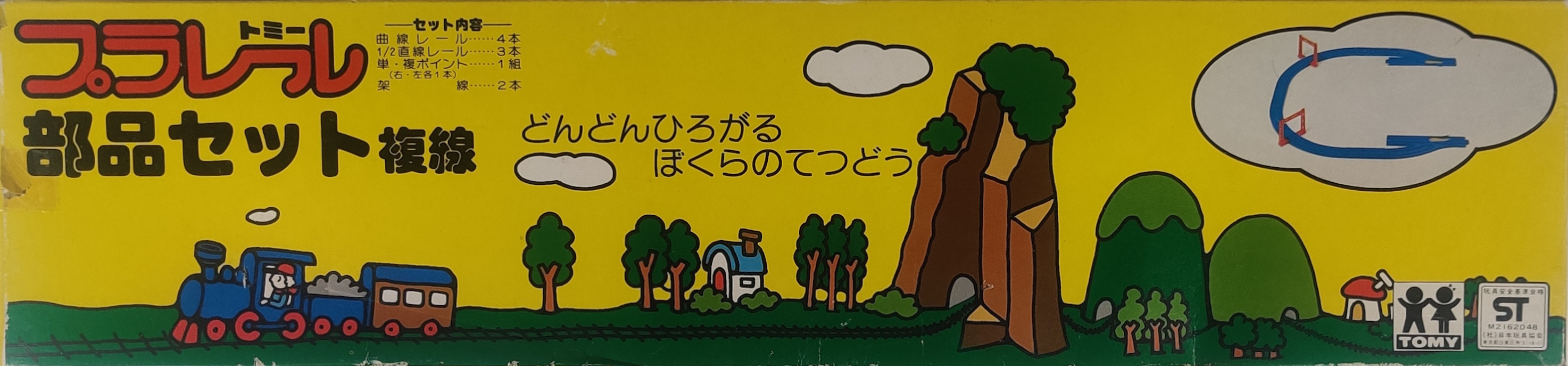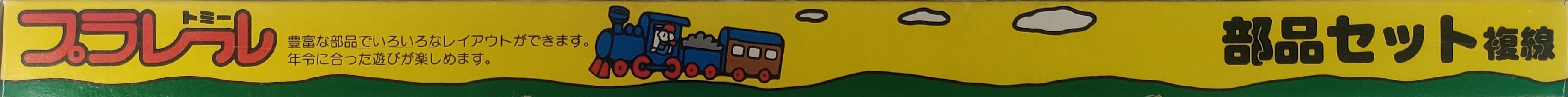 The Double Rail Parts Set (部品セット複線) was released in 1977 and was made to expand the numbered Basic sets with some double track-style sections to add an outer passing loop. The three Basic sets in their expanded form are shown on the back of the box as well as a large setup with many 1970s Plarail accessories. The G-26 on the rear of the box means that this box was printed and the contents likely produced in 1977, the year it was first released.
