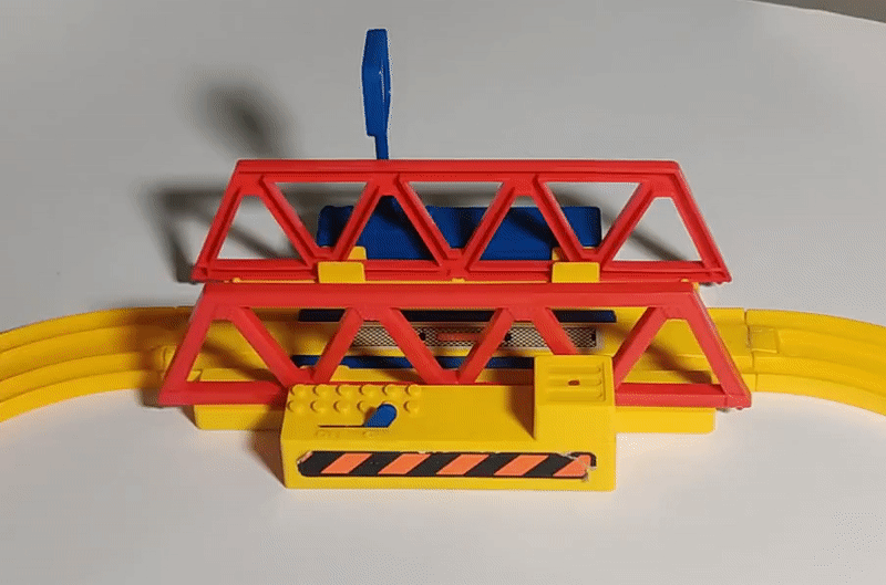 The base of the Horn Rail is the length of a standard straight rail and includes a battery compartment for two AA batteries, a power switch, an enclosure for the piezo-electric beeper inside, and contact patches in the rail surface that press on switches inside when a train passes to turn on the horn sound. The battery compartment includes a stud pattern to attach the sign to and moldings along the side of the tracks allow for the sides of an Iron Bridge to be inserted inside without the need for Block Bridge Girders.