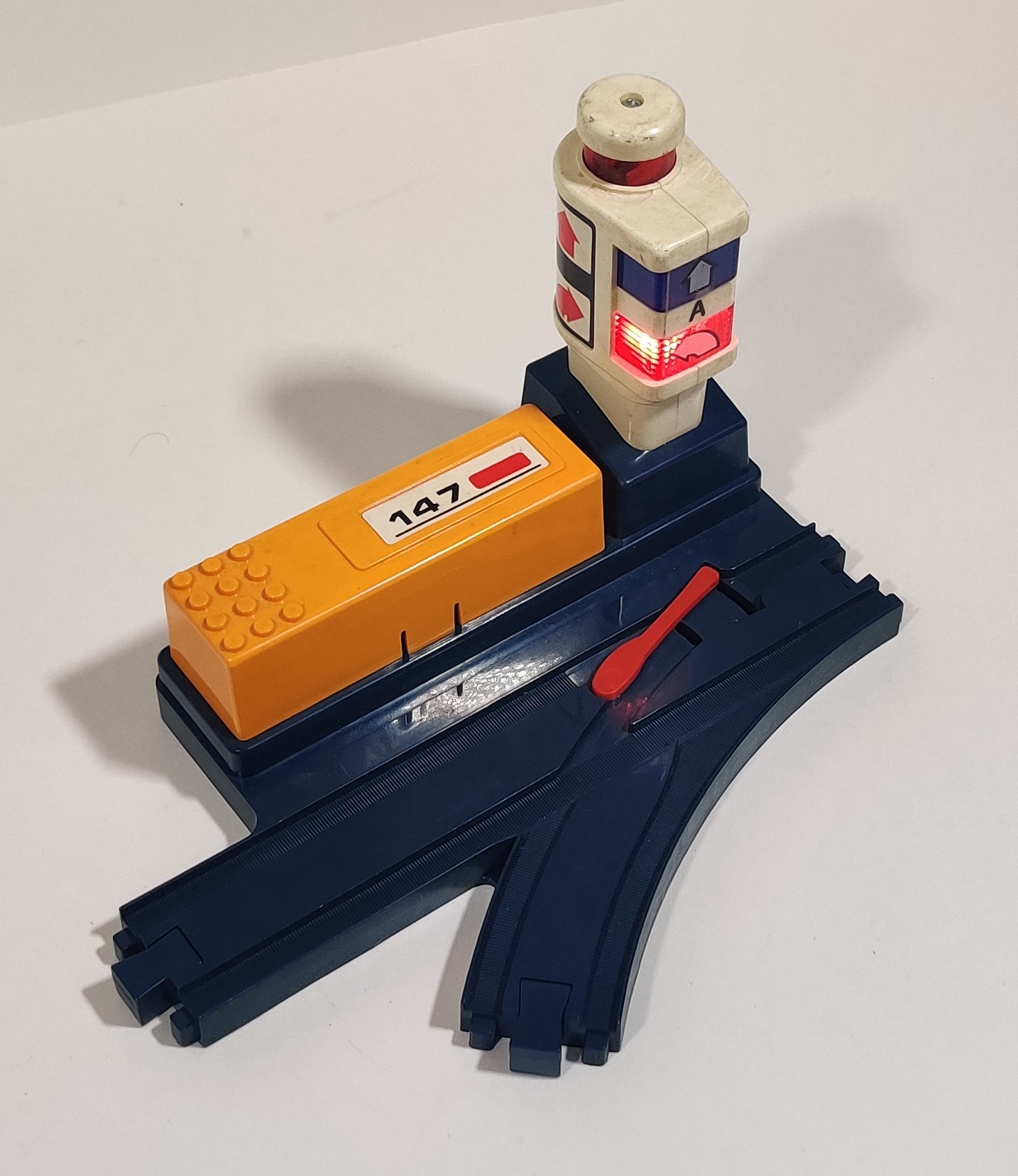 The Remote Control Point Rail (A) (リモコンポイントレール(A)) is a remote control point rail that branches off to the left with a concave entry connector and two convex branch connectors. The track base is a darker blue matching that of TomyTrain or Tomy Express (it even has a deep red directional lever) with an orange battery cover like a LEGO-stud style patch on top and an exaggerated signal with lights to indicate which position it is set in.