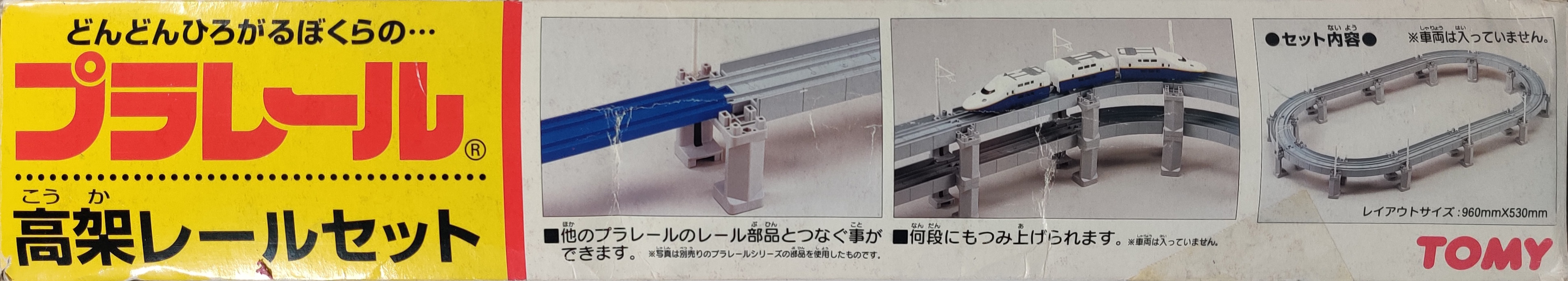 The first product to feature the new elevated rail sections was the 1999 Elevated Rail Set (高架レールセット). The box shows the range of the late 1990s new power era, with several Shinkansens joining new and old conventional line trains... The ST8 mark indicates the box was printed in 1998, when the track sections had already been finalized and passed toy safety requirements and had the production box design ready.