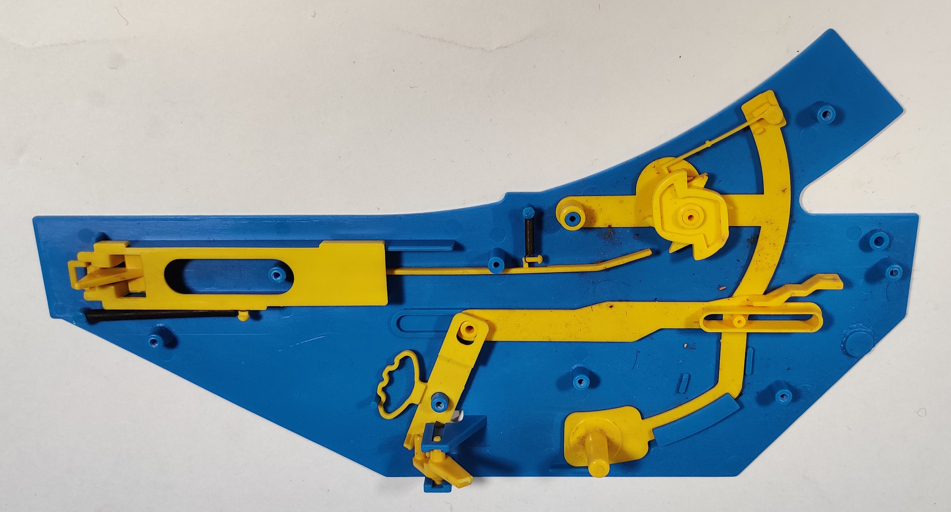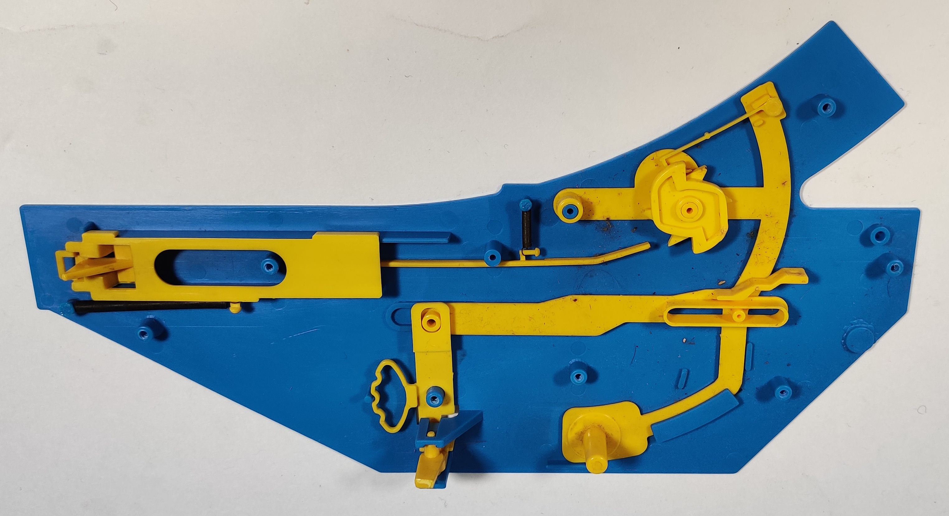 When the ratchet is engaged, each successive passing of a train advances the ratchet one sixth of a rotation, flipping through the different positions of the decider. When the switch is set to manual, it swings the ratchet mechanism away from the trigger and brings in a linkage connected to the three-position lever, which moves a peg forward and backward to press on the spring-loaded directional decider.