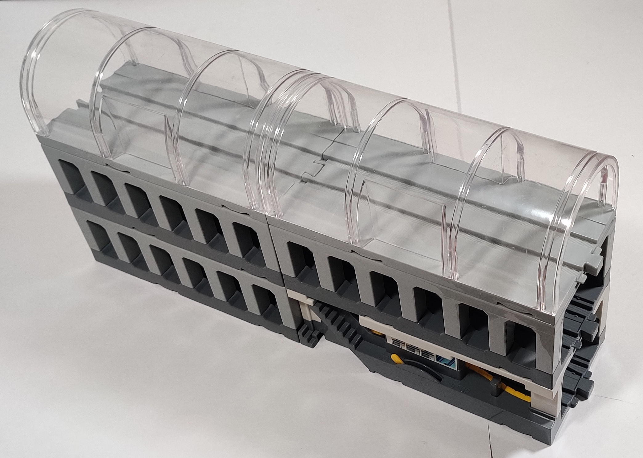 In 2006 Tomy released the first of a few tunnel and dome accessories for the Plarail system that could be stacked and connected together. This system primarily consisted of translucent "domes" as well as subway-style tunnels. The sections are also compatible with Tomica Town curbs and other accessories.