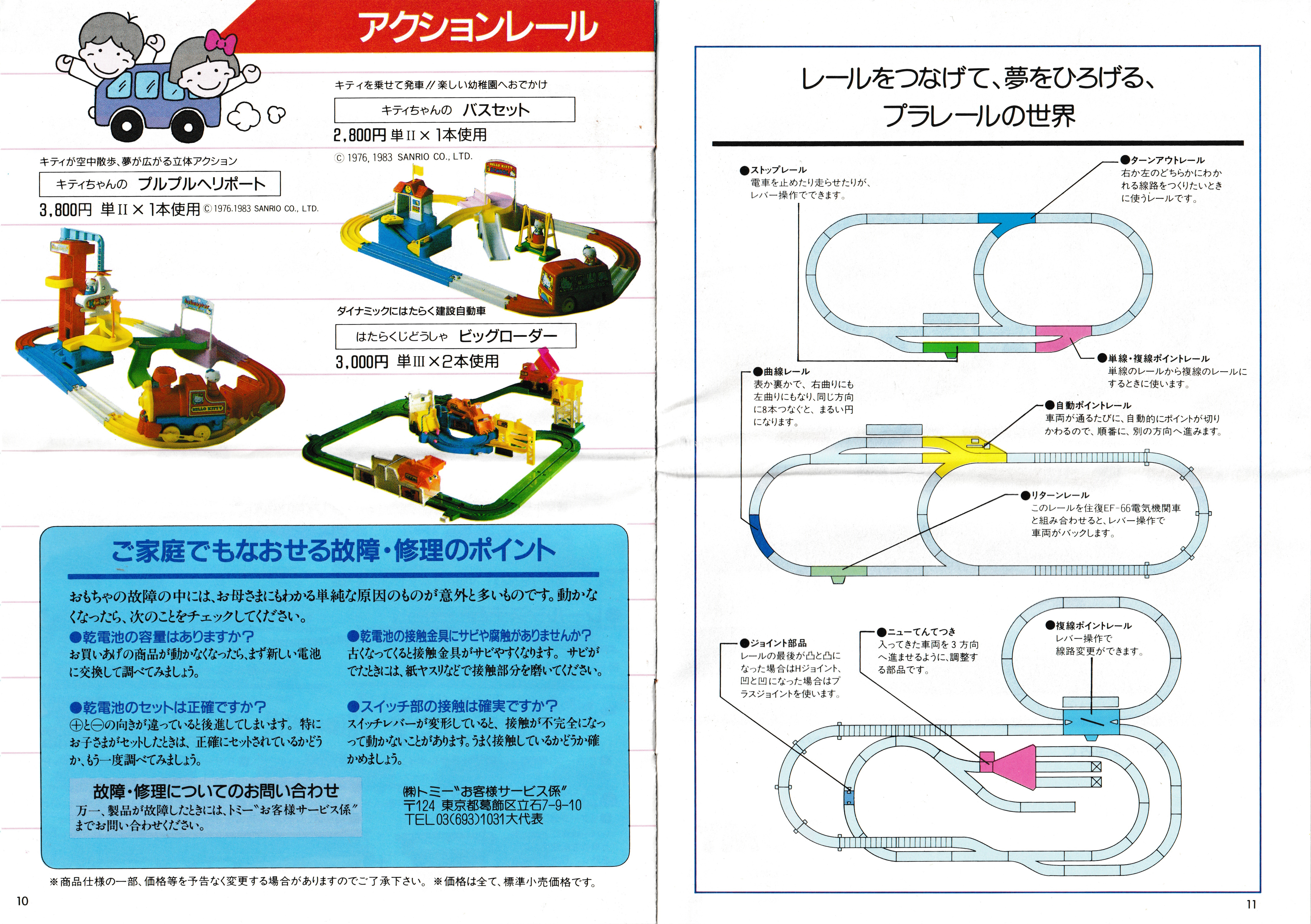The last page shows Action Rail, in particular two Hello Kitty licensed versions of the 1970s Plarail Land sets and the colorful Working Vehicle Big Loader. Three layouts are also shown, one based on the Basic No.3 Set and two others that are not quite as extravagant as some of the early 1980s suggestions.