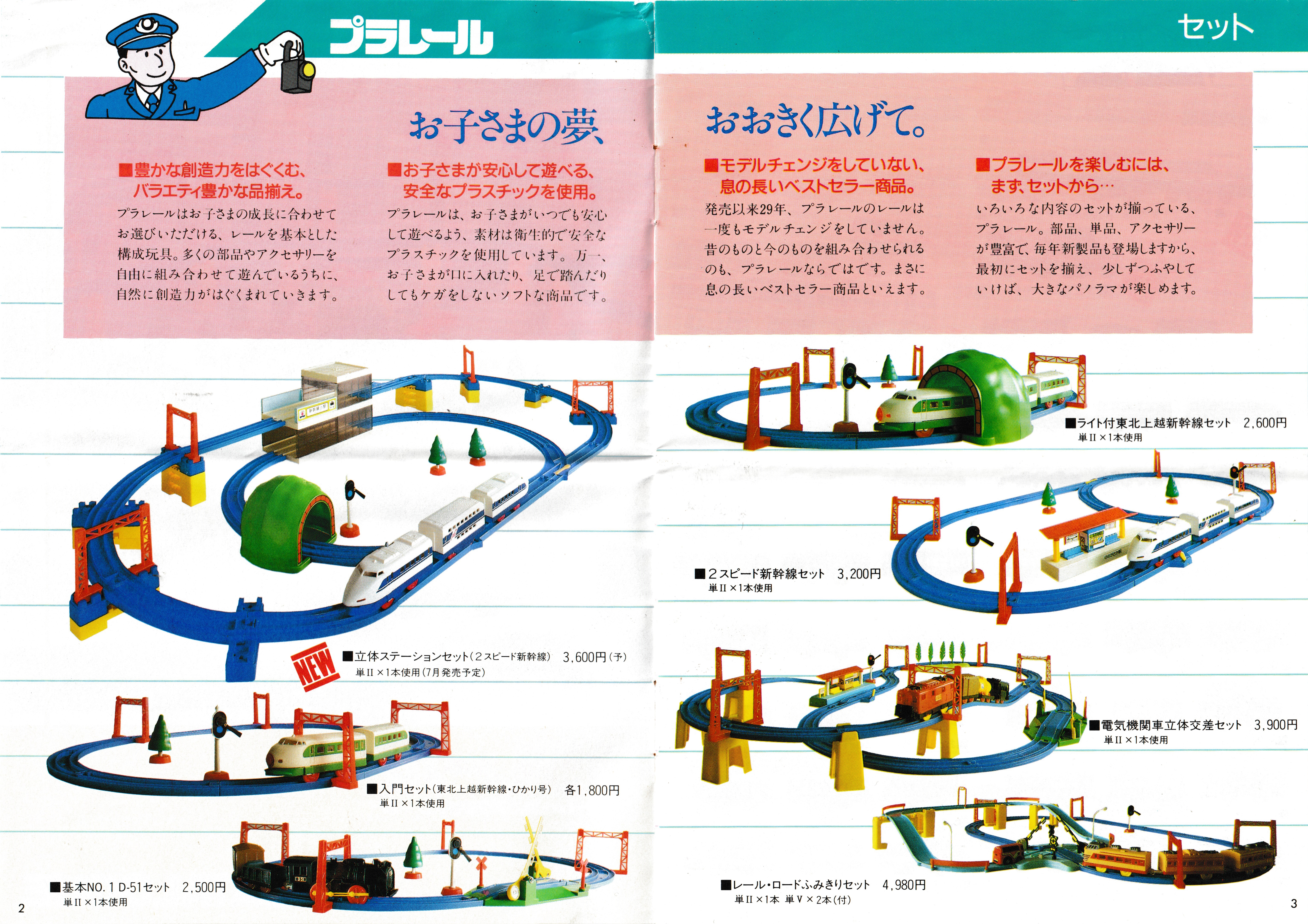 The text at the top of the spread showing sets comments on Plarail's wide variety of products, the safety of the plastic and flexible rails, that the standard has not changed in 29 years, and to start with any set. On display were the first new power sets, the 2-Speed Shinkansen Set and the 2-Speed Shinkansen Three-Dimensional Station Set, as well as many later or longer-lasting old power sets like the Rail Road Level Crossing Set, Basic No.1 Set D-51, Electric Locomotive Overpass Set, and apparently even the Beginner's Sets.