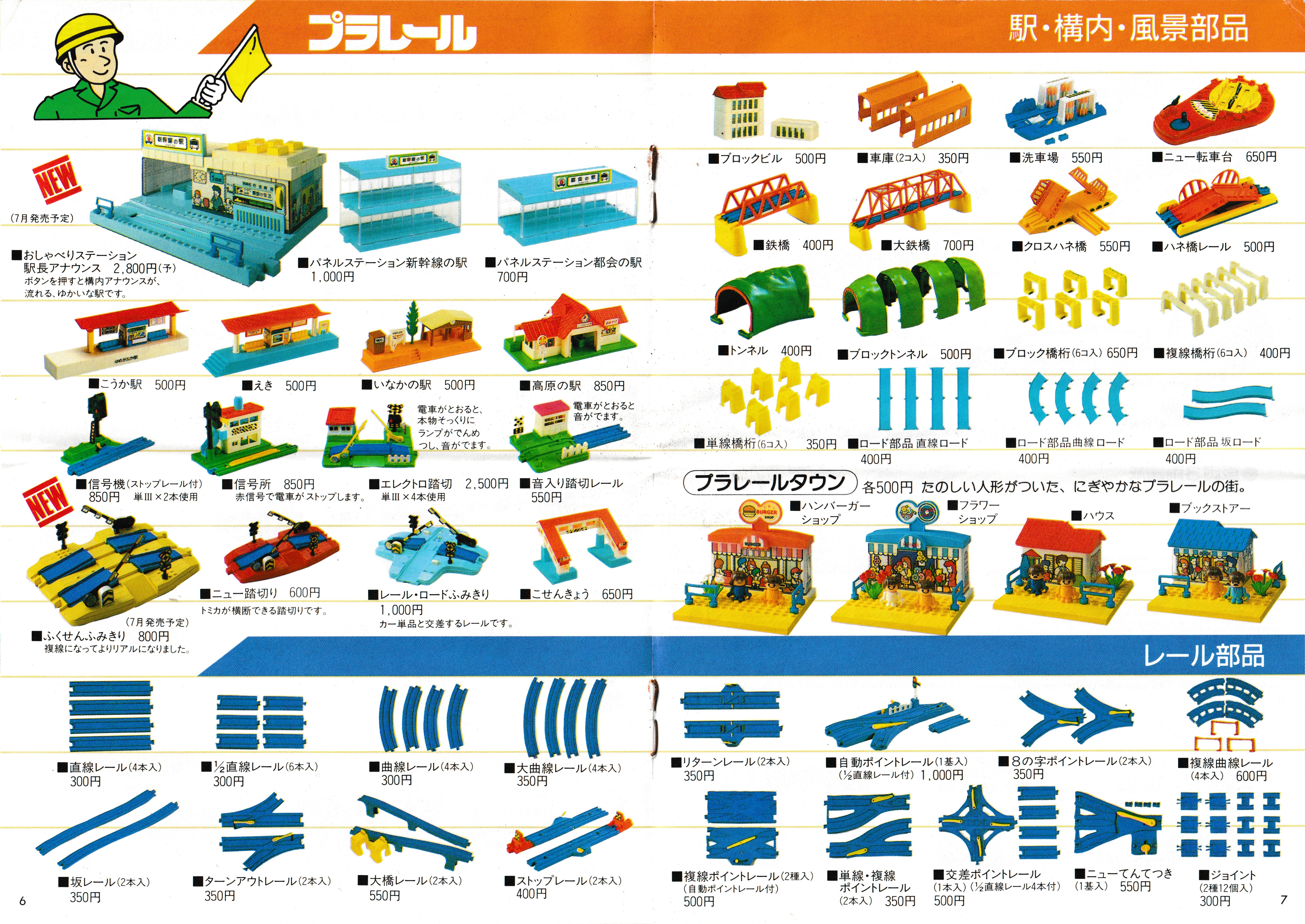 Accessories, early Panel Stations and a variety of other stations, staple tunnels and bridges, and the recently introduced Plarail Town buildings. As touted earlier in the pamphlet, many rails have not changed since their introduction in the 1960s, with large radius curves, the double track system, and older sloped bridge rails and joint rails on sale.