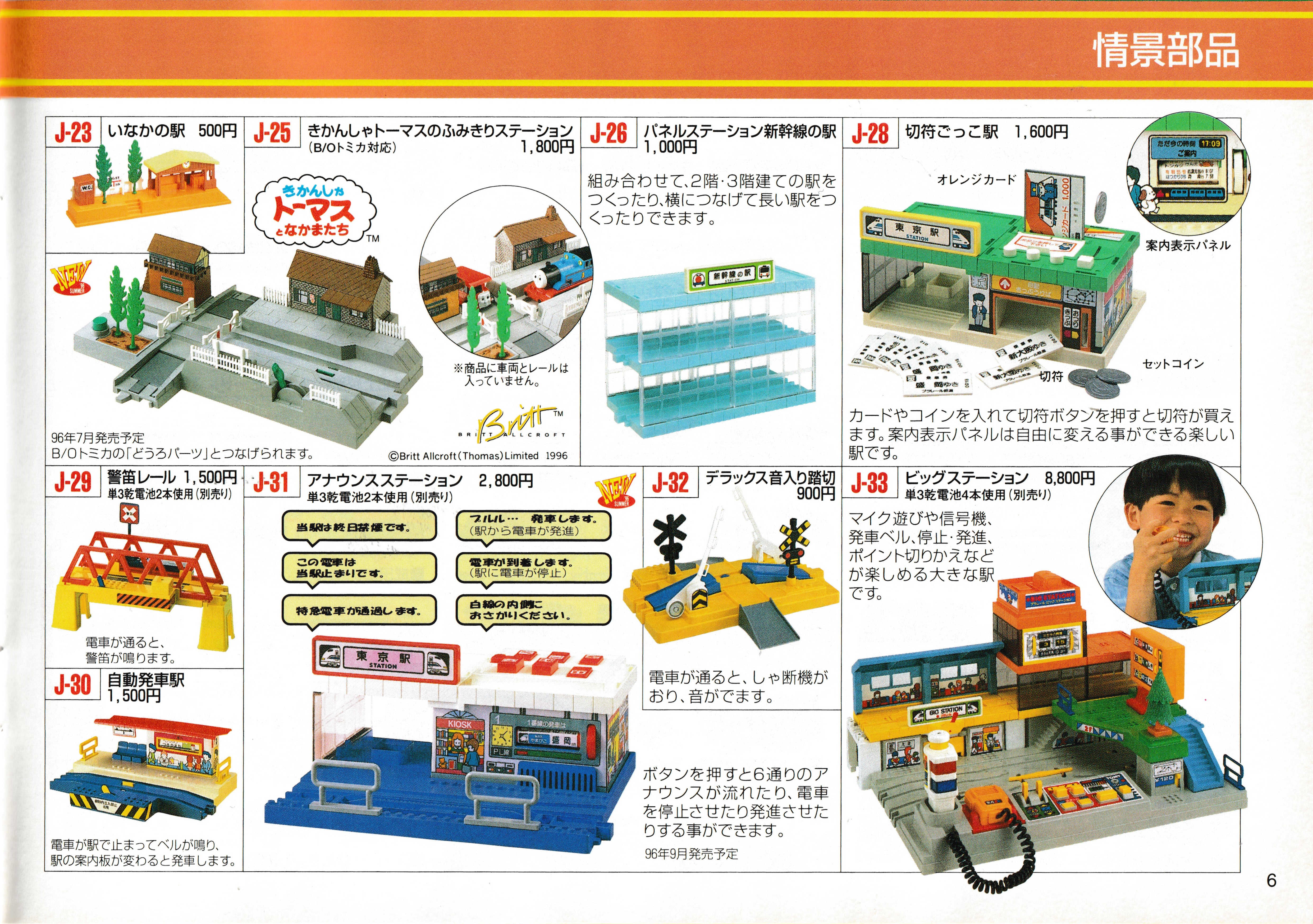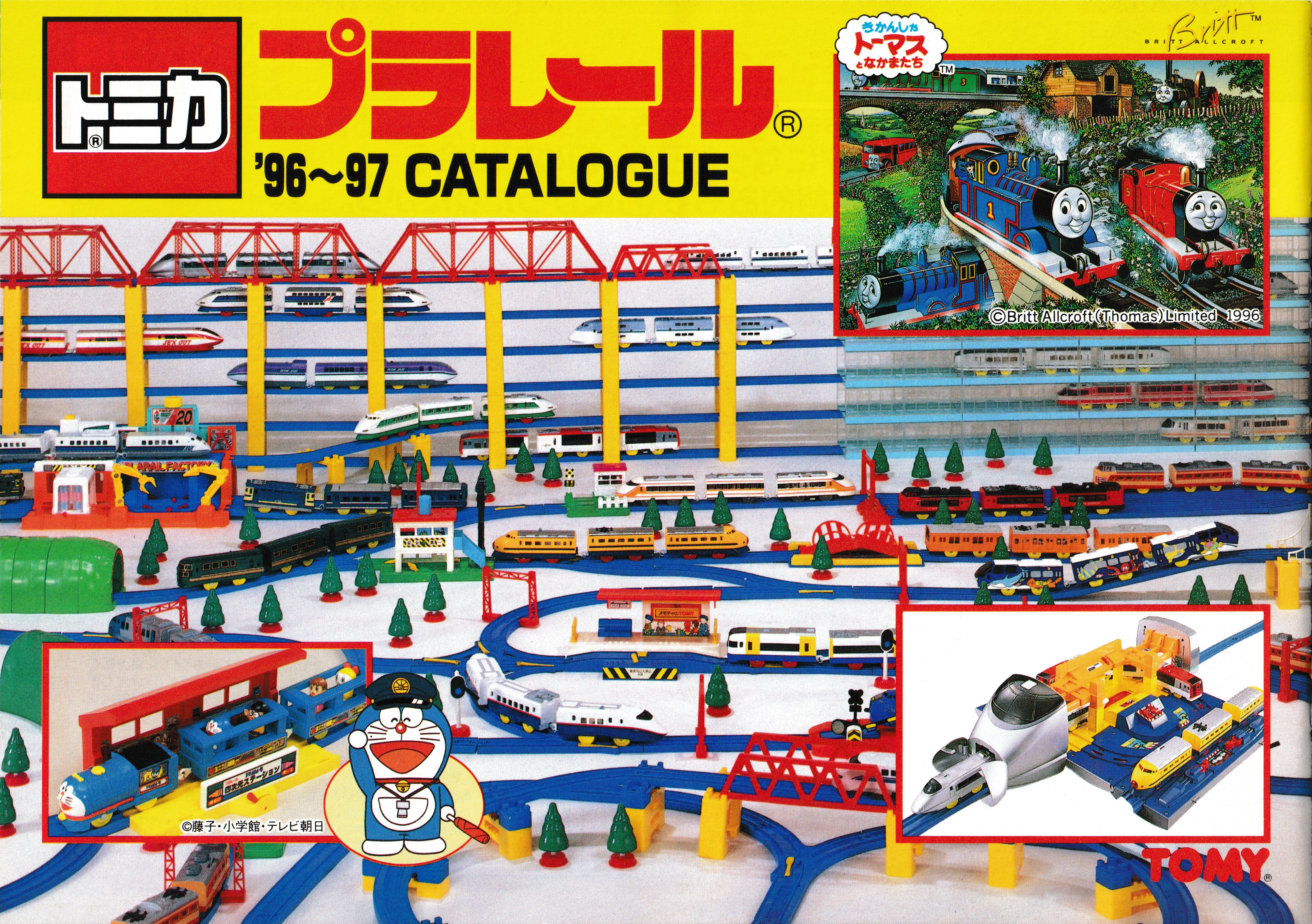 A similar stacked layout to the 1994 and 1995 catalogues is on the rear cover, showing it is the Plarail side of the catalogue. A Thomas illustration is again featured as in 1995 as is the large Tsubasa and Doraemon.