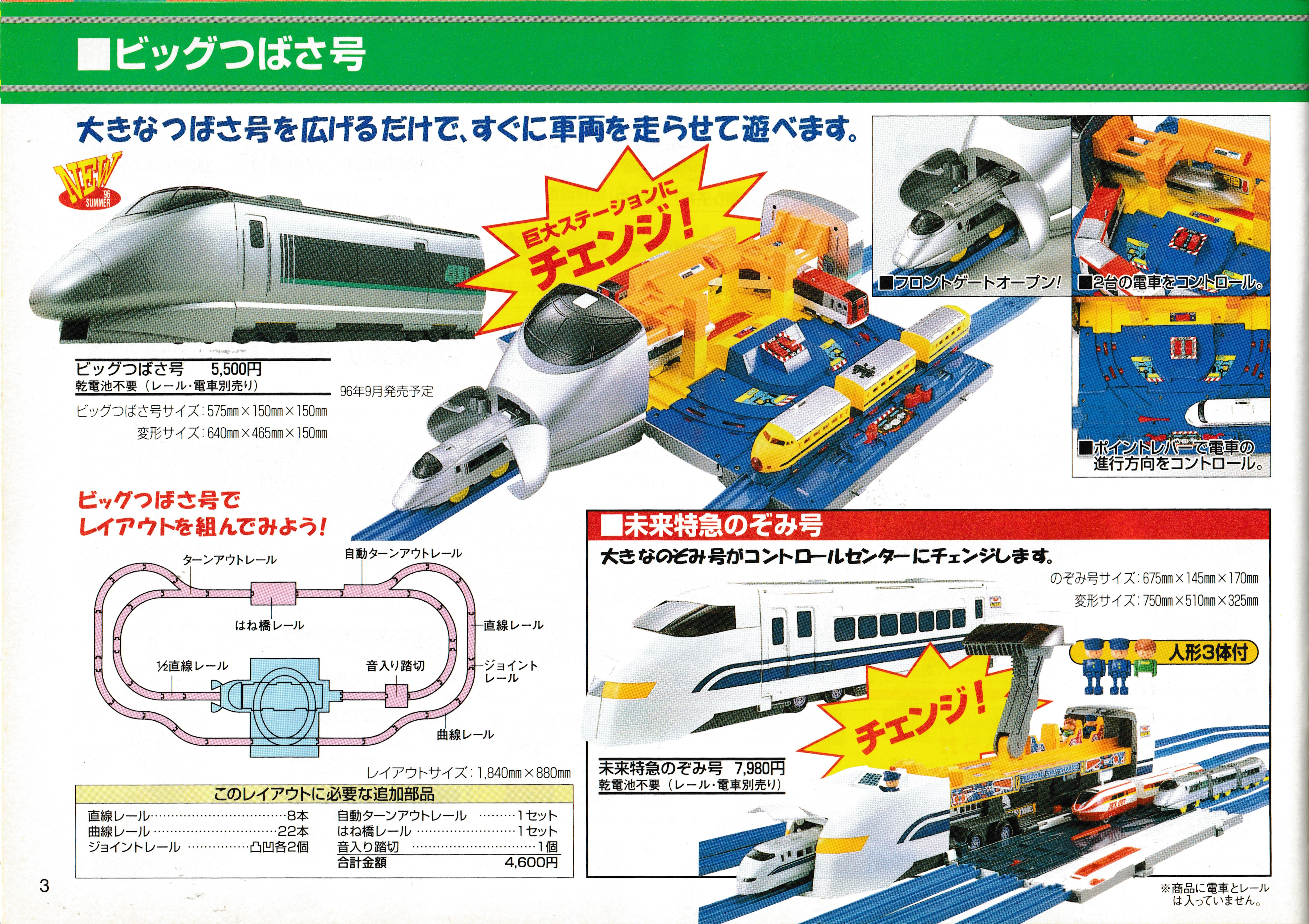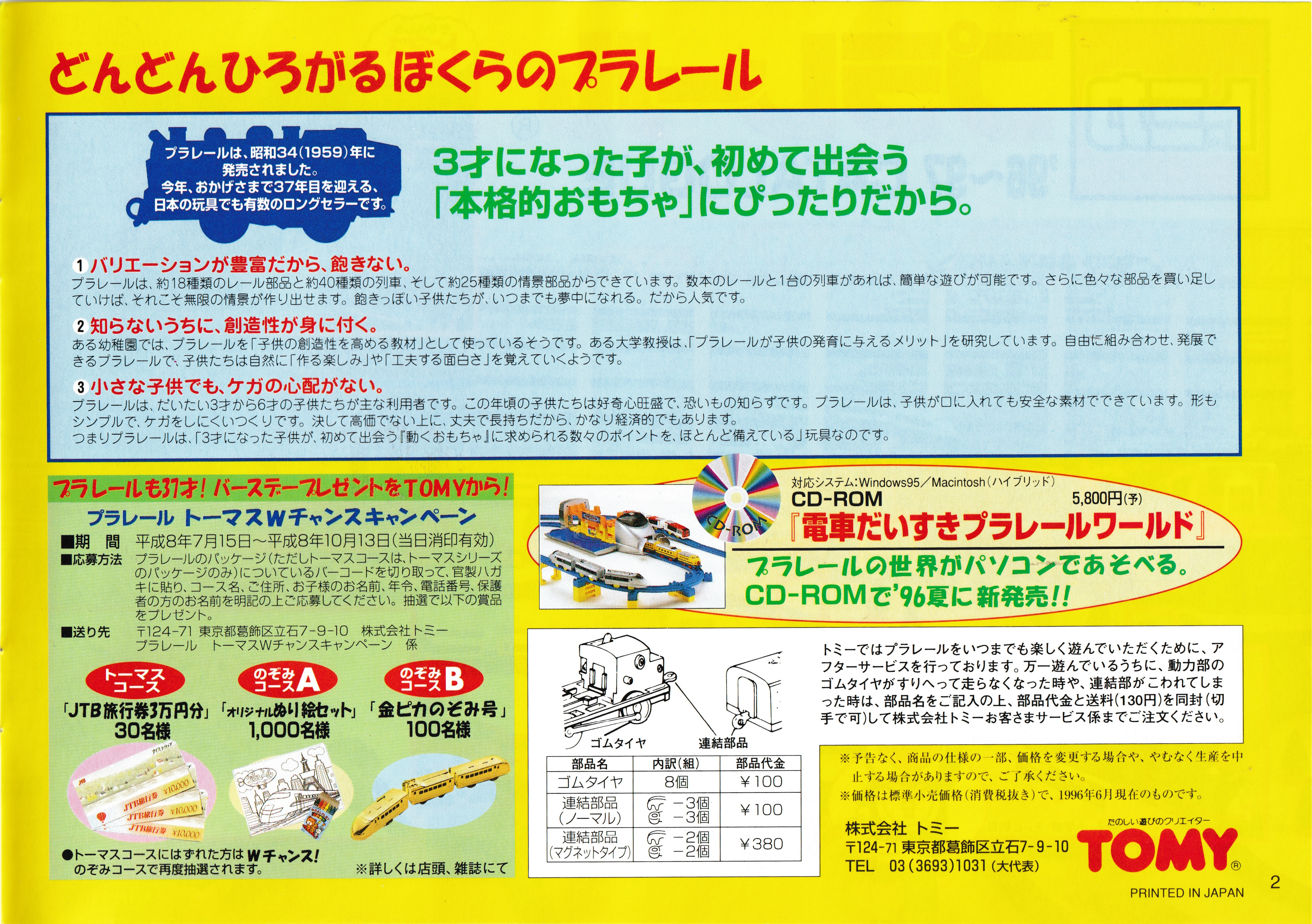 The Big Tsubasa joins the Big Nozomi introduced in 1995. The other page outlines one of the typical prize giveaways awarded for mailing in UPC codes and advertises the 1996 Plarail World CD ROM and replacement parts.