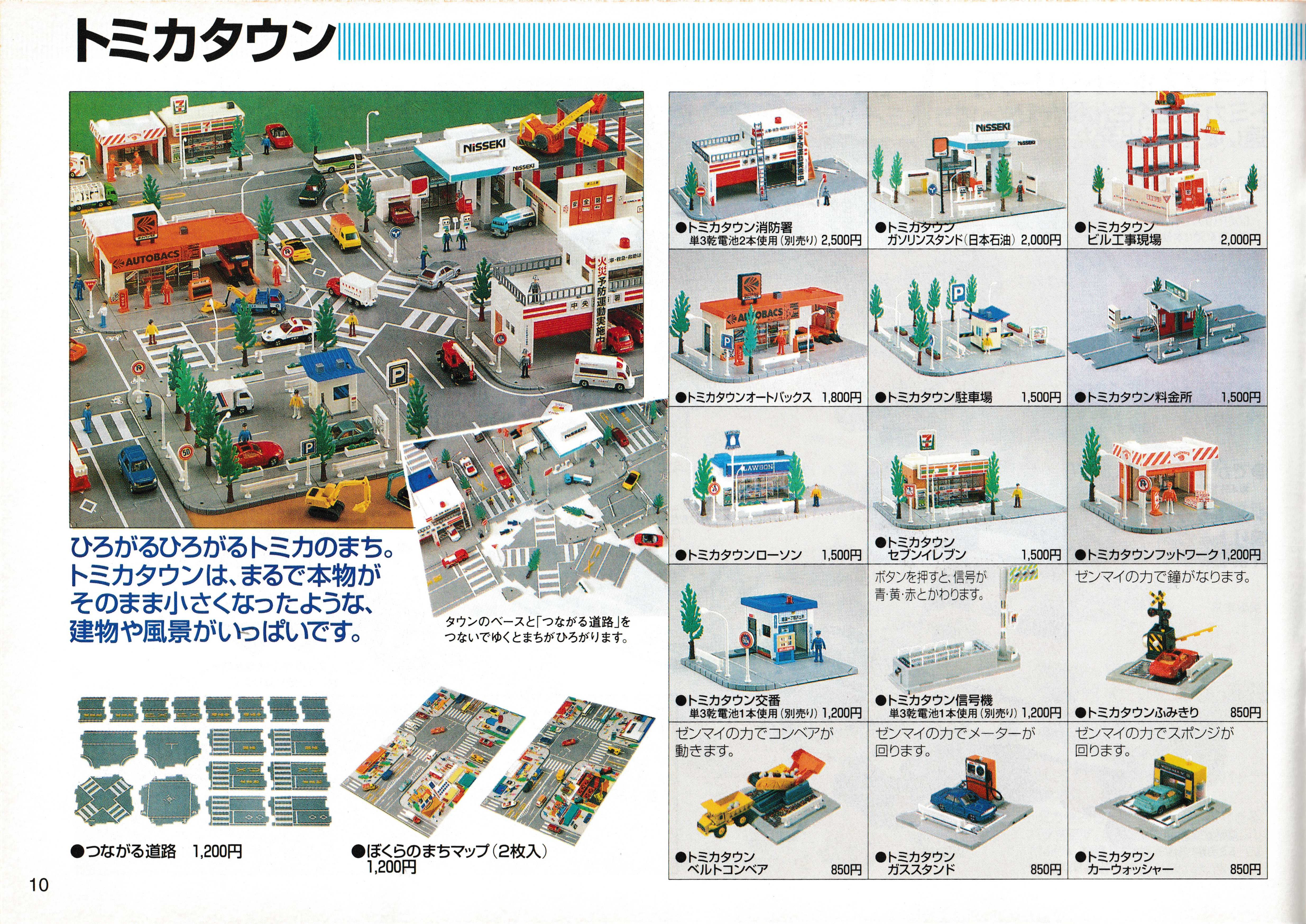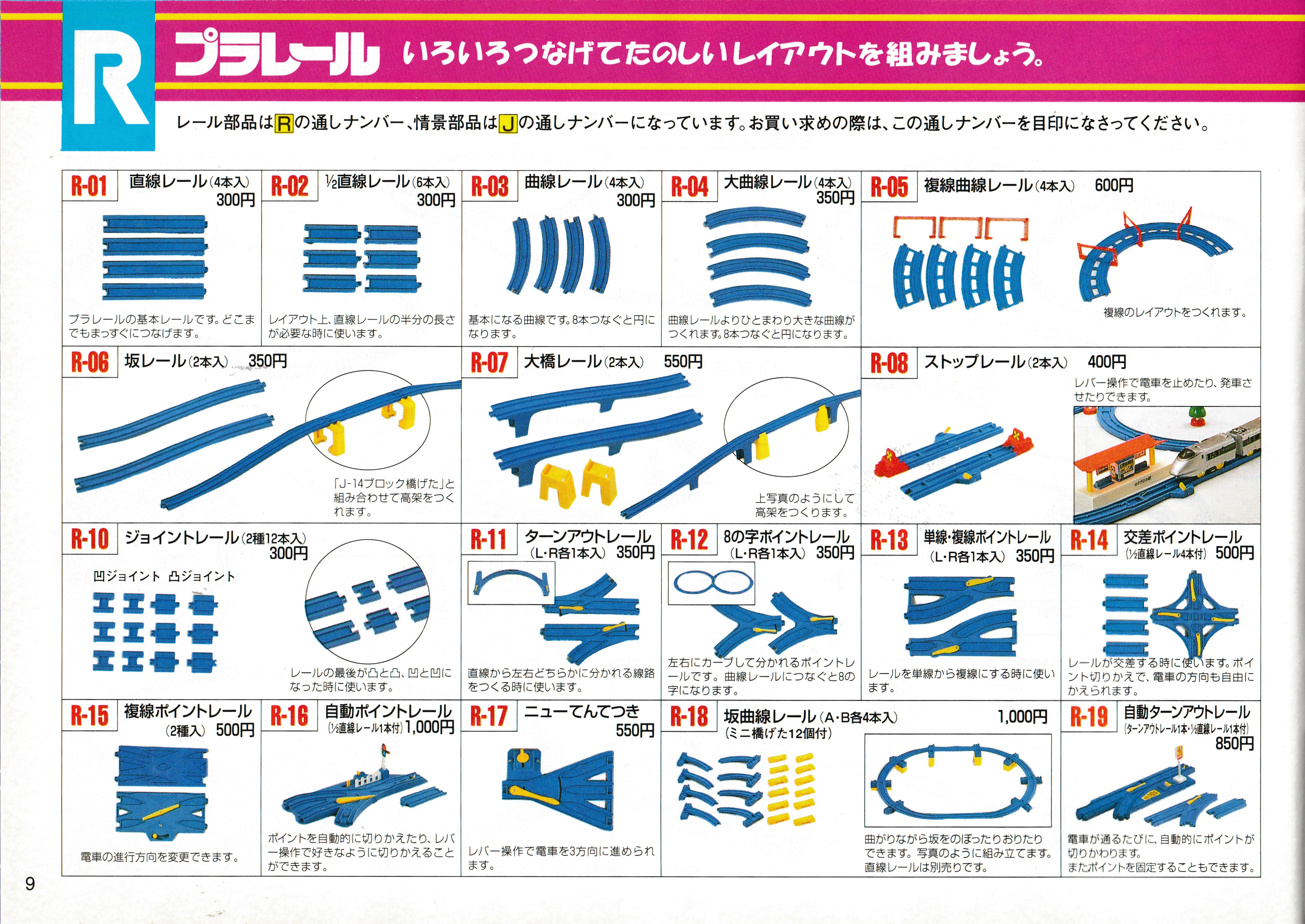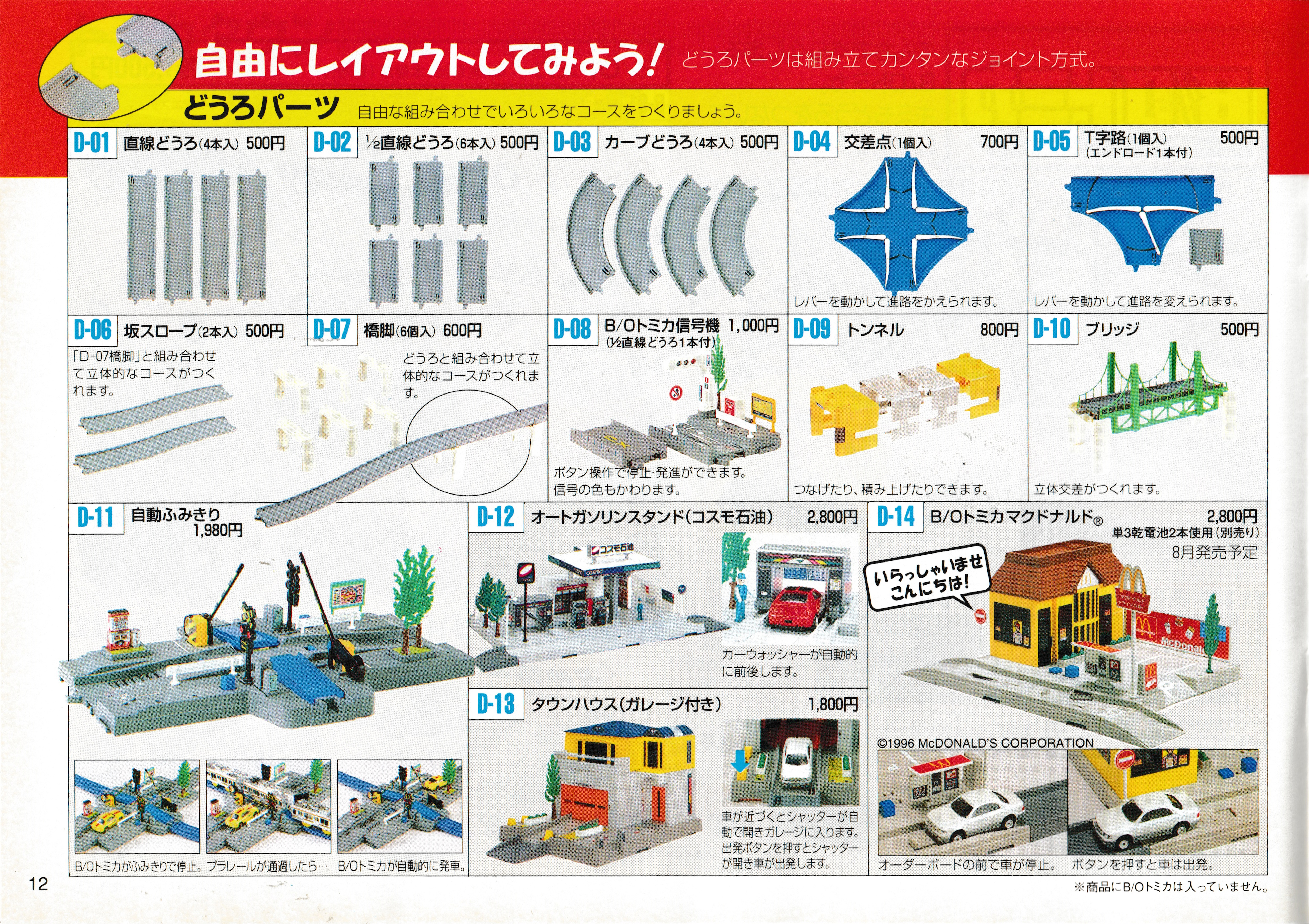 A few older rail toolings were still in production alongside the still-standing staple pieces. I quite like the suggested layouts, there are some nice diagonal straight sections, good accessory usage, a Motor Tomica crossover layout... I think I could build most of these layouts, some day I ought to.