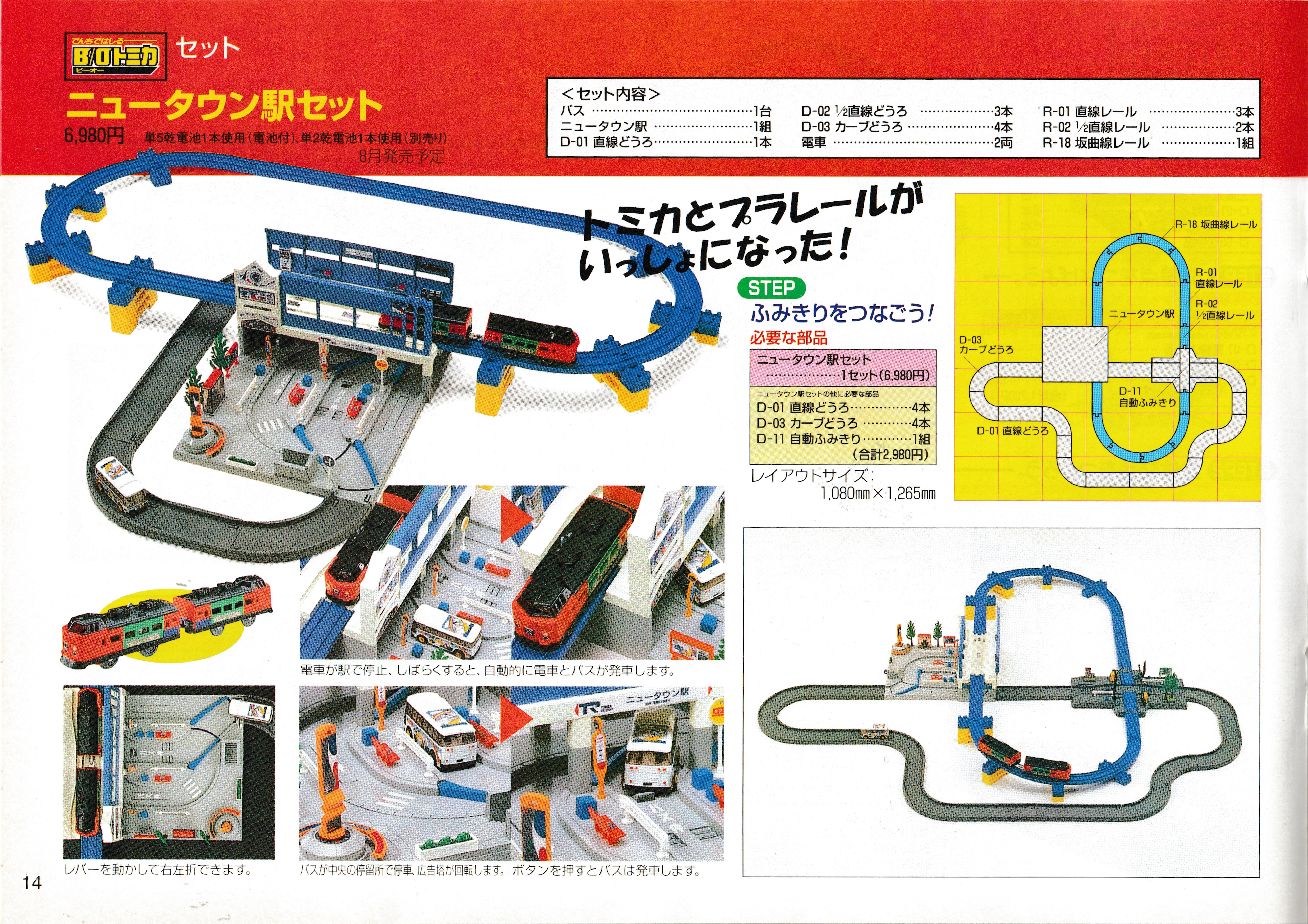 The nice B/O Tomica New Town Station Set and expansion suggestions as well as the period Big Loaders and Metal Pocket trains. This is the middle of the catalogue, and both pages are numbered 14, with the numbers counting down towards the Plarail back cover of the catalogue.