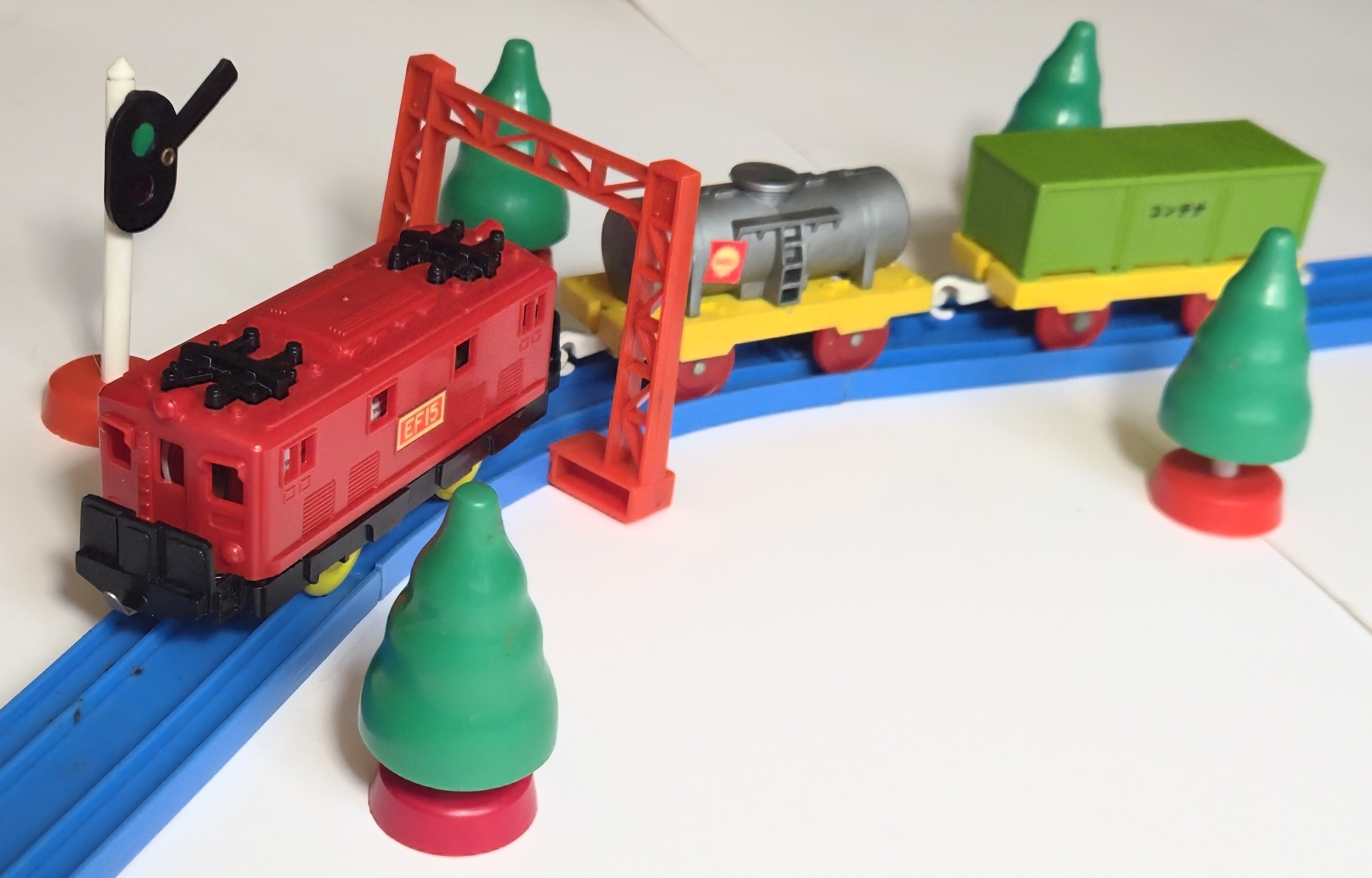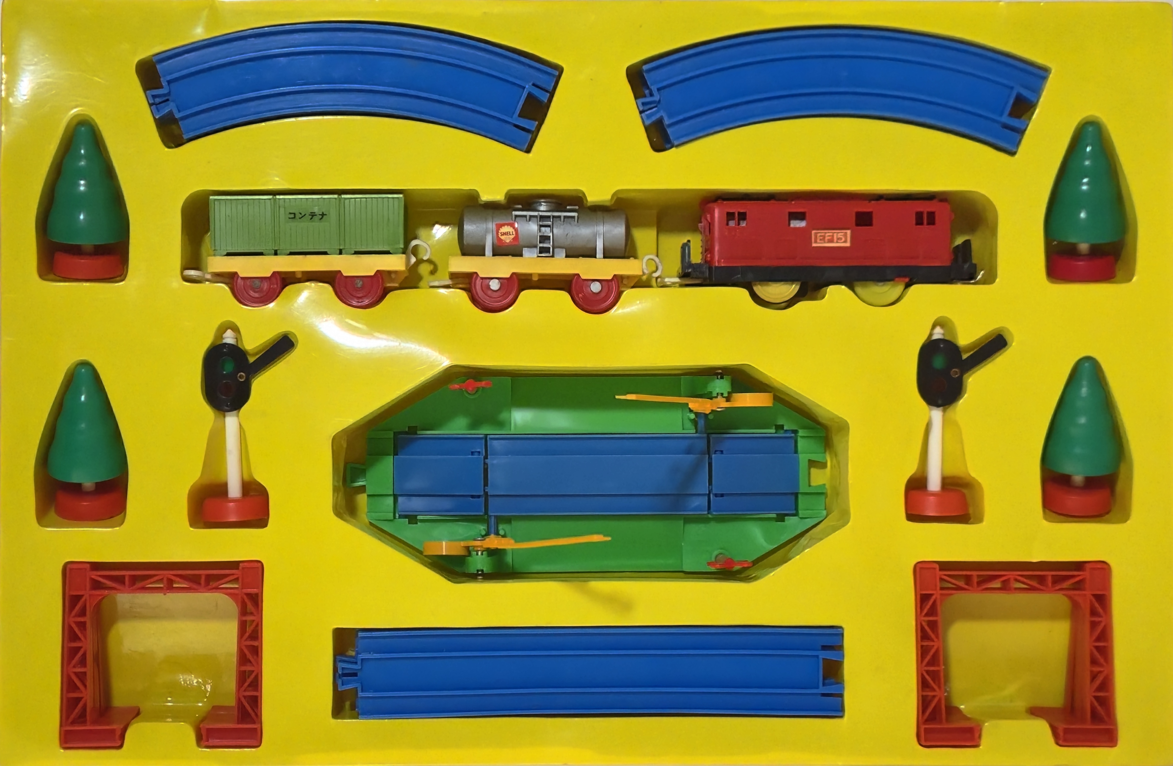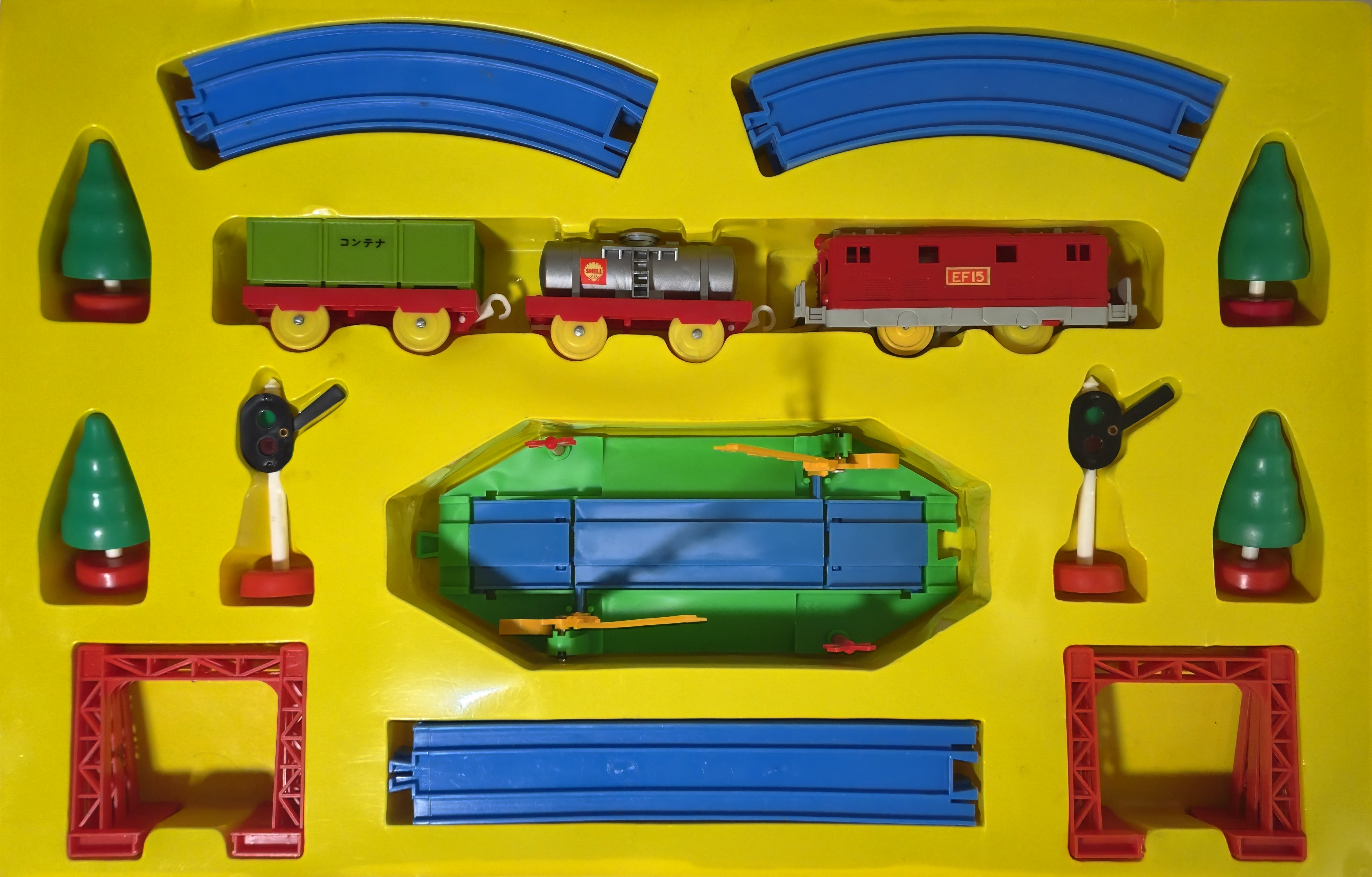 The 1970 Electric Locomotive Set (でんききかんしゃセット) included the then-new EF-15 Electric Locomotive, freight cars, and the first Plarail automatic Railway Crossing.