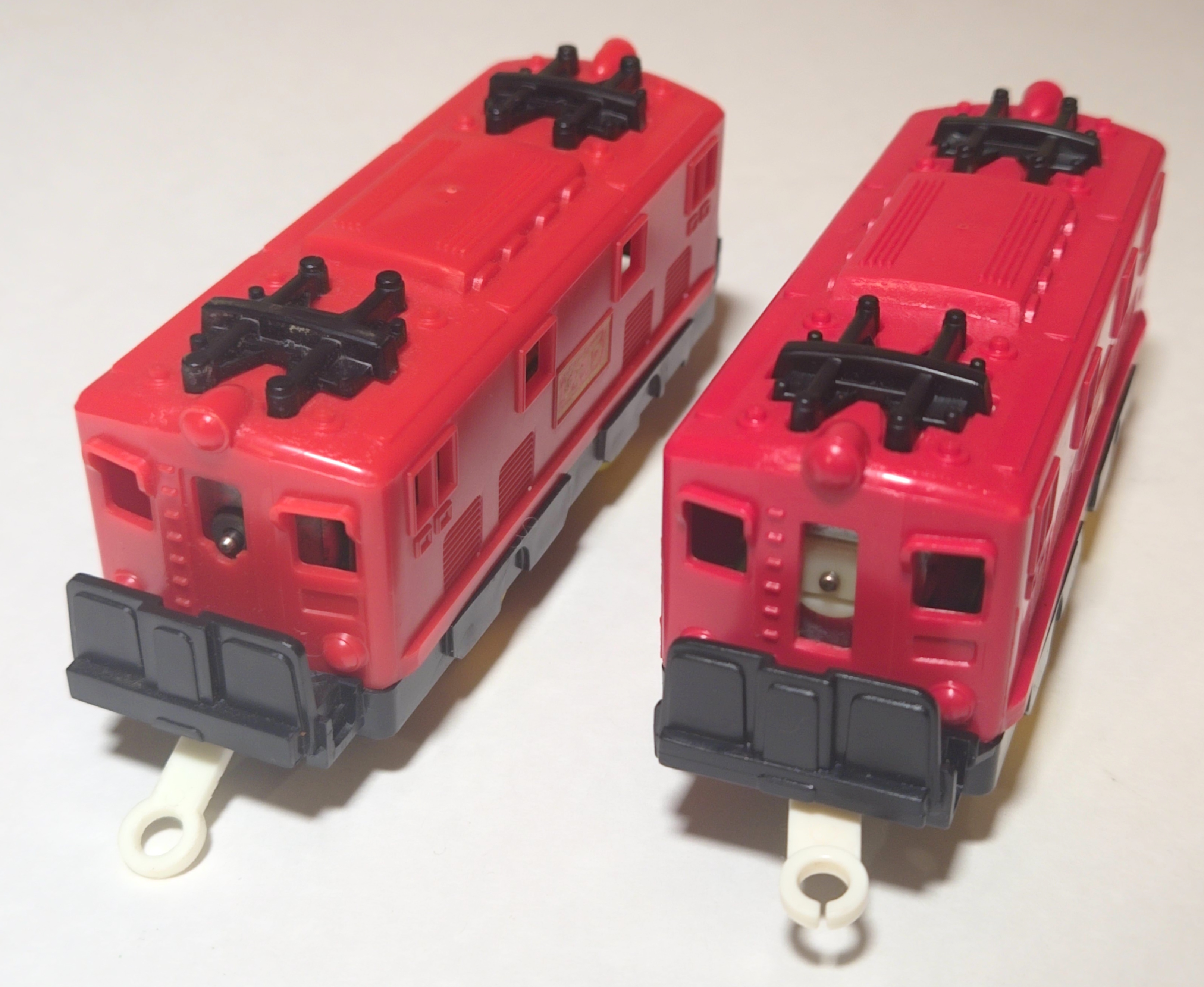 The EF-15, sold as the Electric Locomotive as it was the only one in the range at its introduction in 1970, headlines this set hauling two also-new freight cars. The power switch is bent up at the end, as was the style at the time. The original 1970 runs of this set had the early grey chassis EF-15 with alternate-color early freight cars.