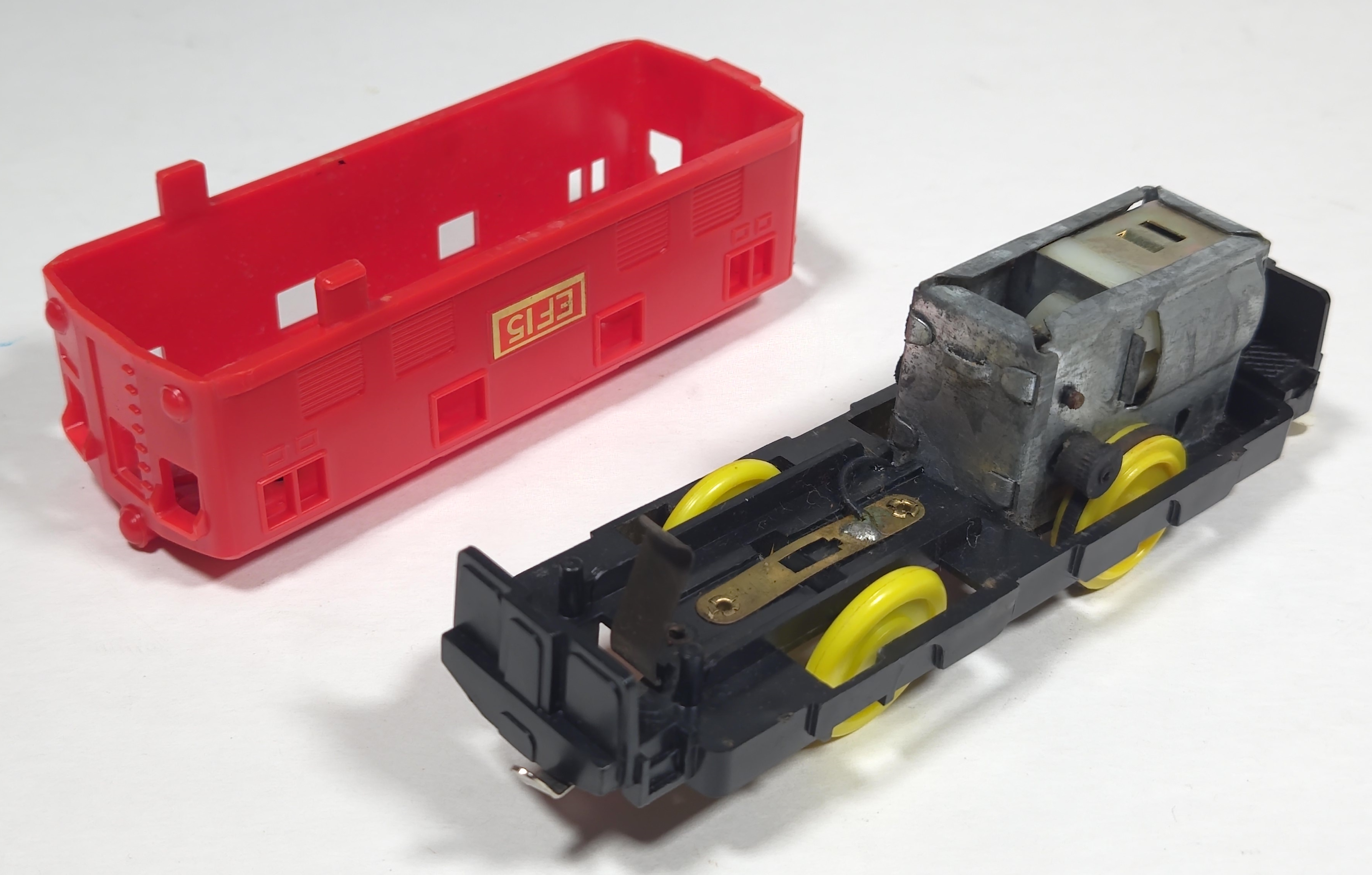 Around 1972 the EF-15 chassis was changed to black and the freight cars changed chassis and wheel colors to the more iconic combination that stayed in production for decades. I think in part this was to differentiate the color of the chassis from the locomotive body, but yellow EF-15s were also sold in the later 1970s...